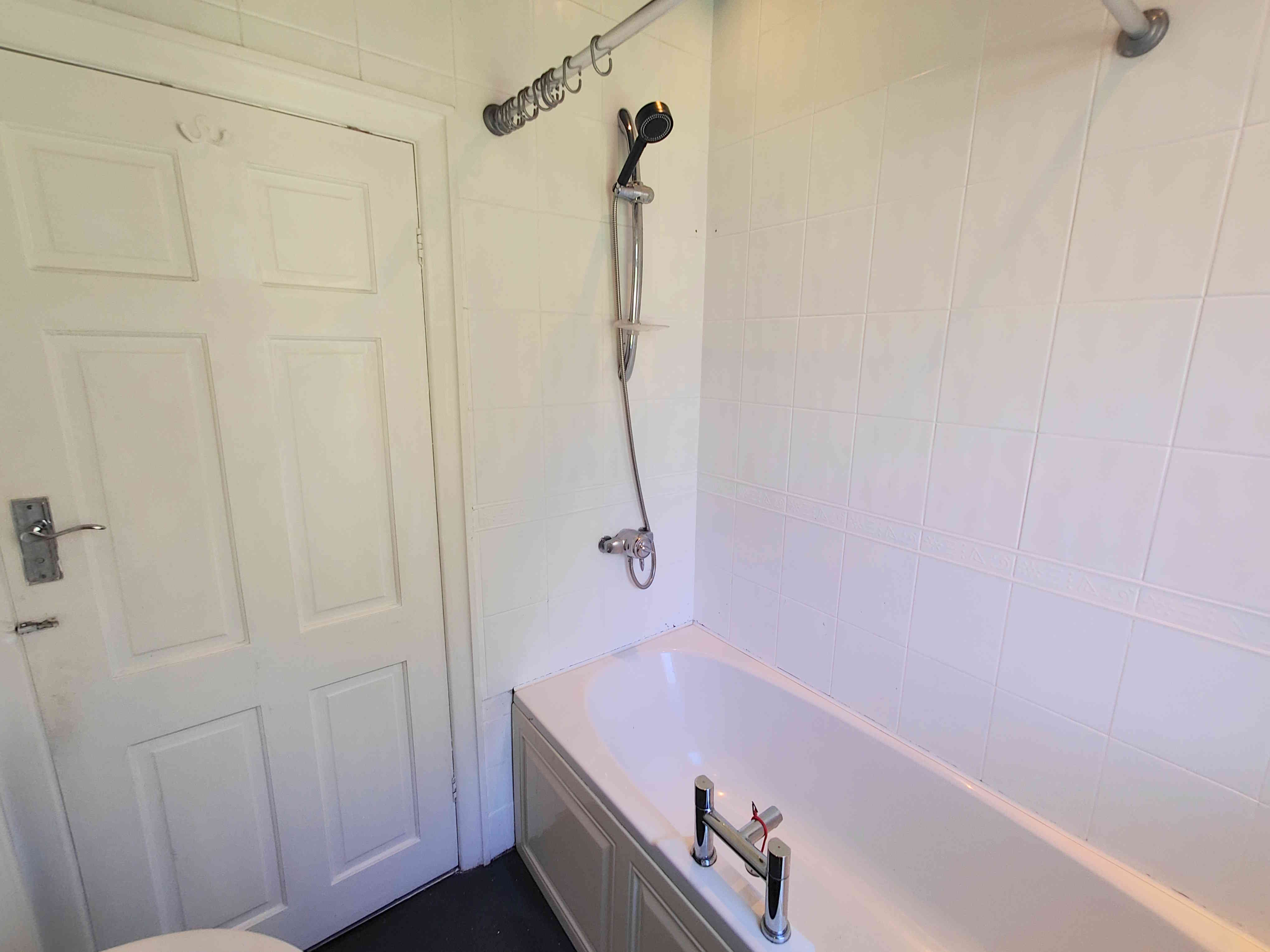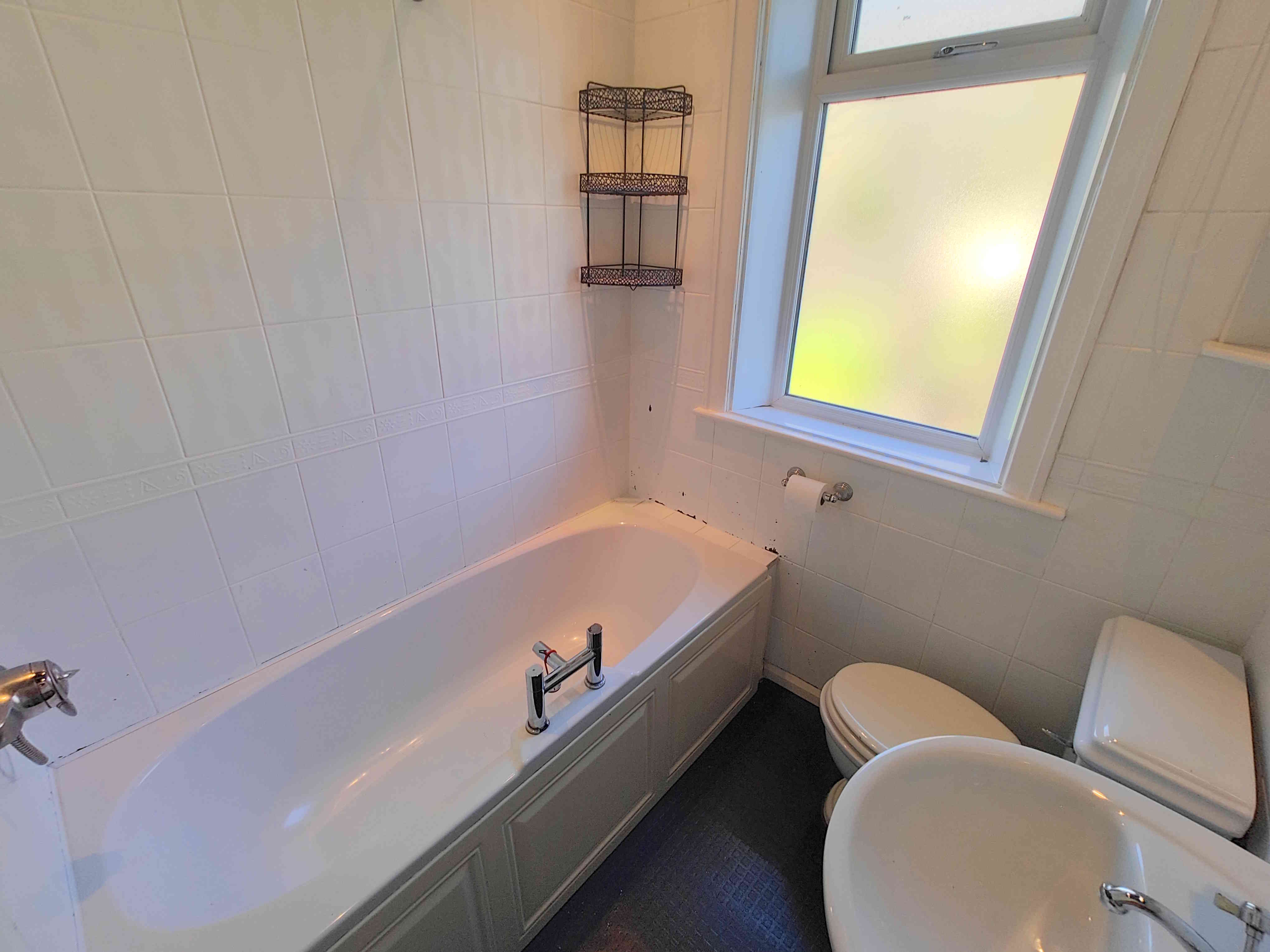 A neatly laid out house bathroom that features a panel bath, over bath shower, low-flush toilet, pedestal washbasin, vinyl floor, tiled splashbacks, central light fitting and a frosted uPVC double glazed window to the rear elevation.
