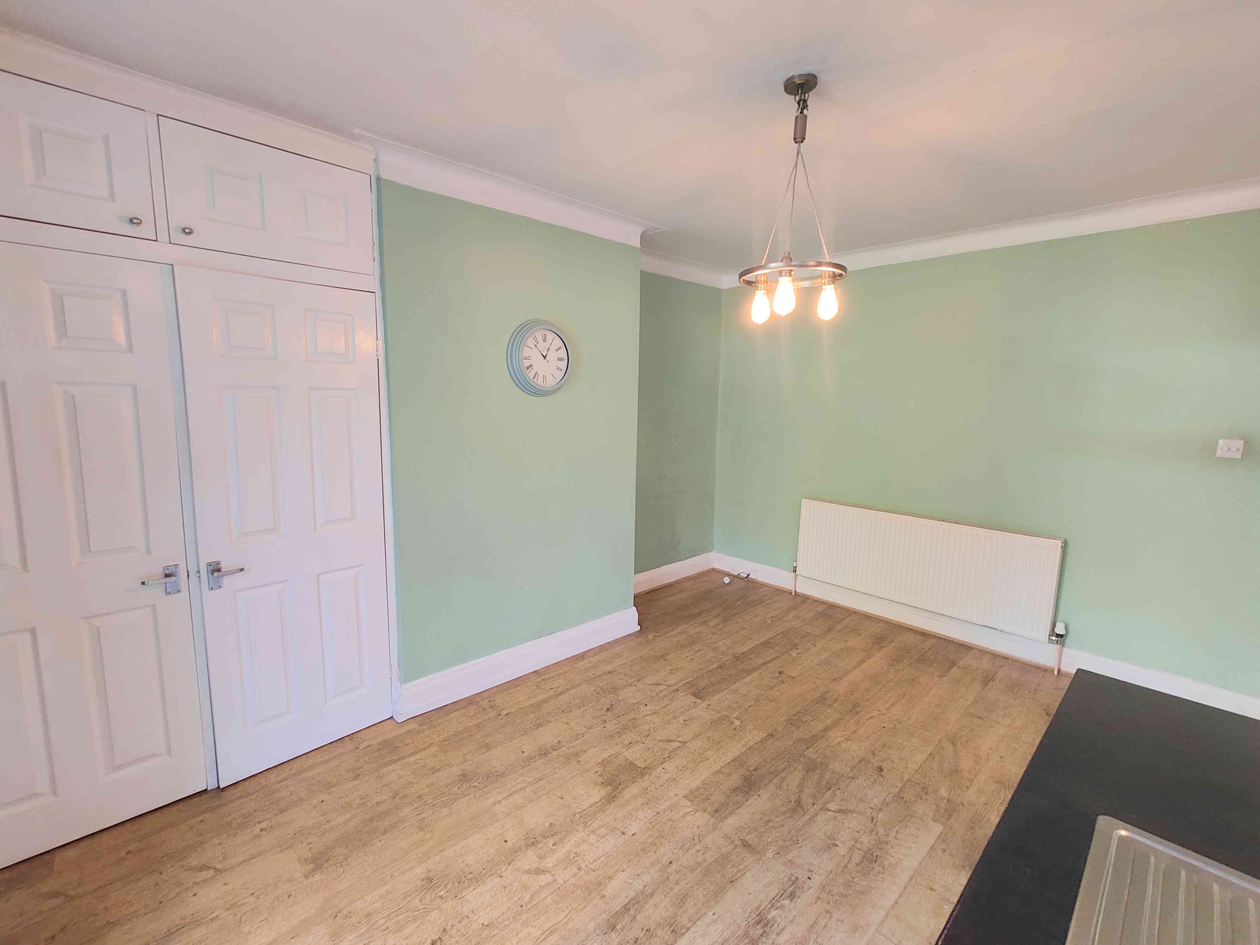 Another large and spacious communal area, the dining kitchen offers the ideal place for family meals or entertaining. The dining area offers plenty of room for a large family dining table and benefits from additional storage space with an alcove inset cupboard. The kitchen is set to one side of the room with two sets of laminated work surfaces and features over or under counter cupboards and drawers. A uPVC double glazed door offers access to the rear garden and two uPVC double glazed windows bathe the whole room in natural light. With a wood laminate floor, single radiator, two central light fittings, integrated hob, integrated cooker, extractor hood, space for a fridge/freezer, plumbing for a washing machine and a stainless steel sink with stainless steel mixer tap.