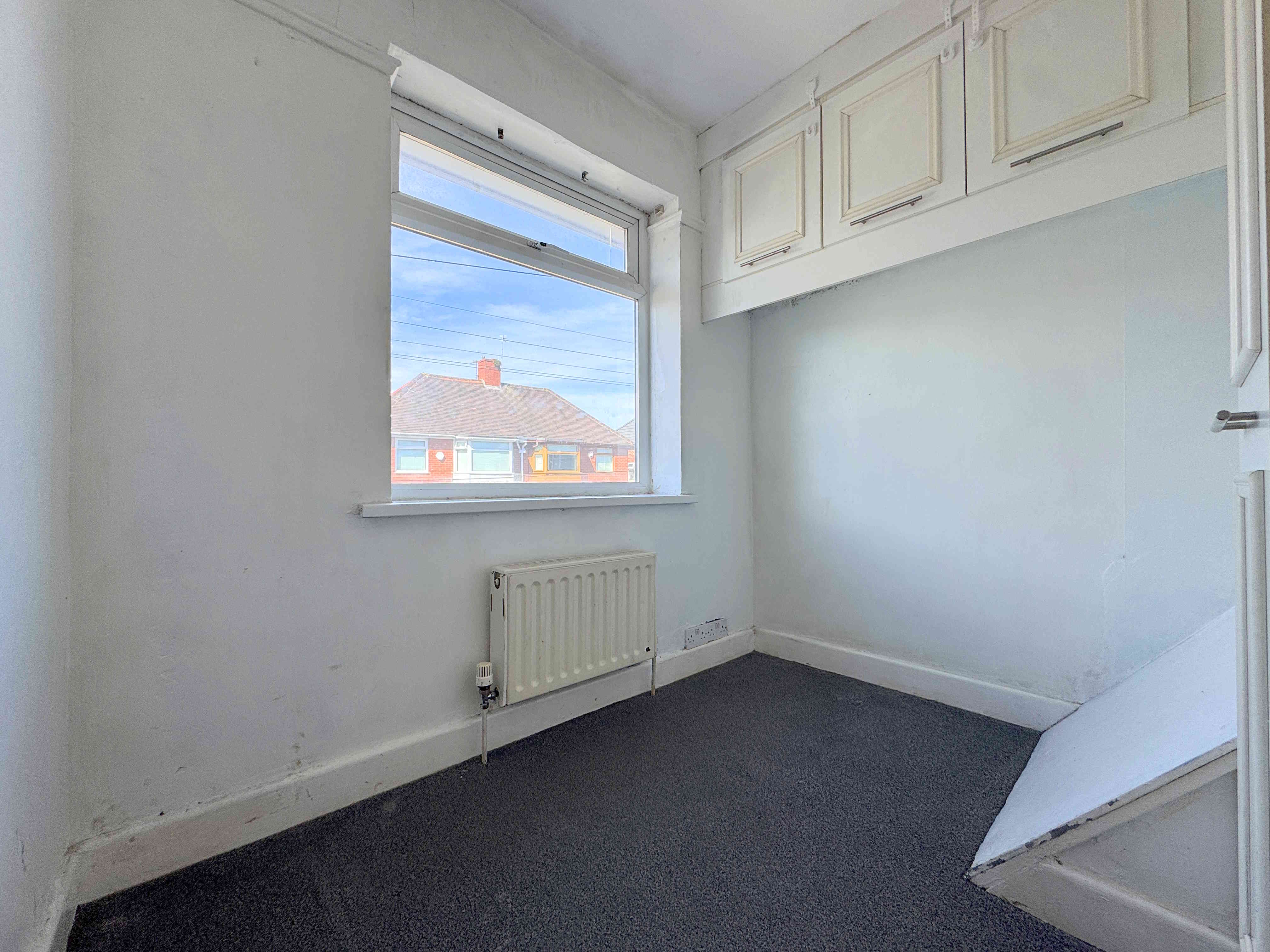 A single bedroom ideal as a home office or nursery, complete with fitted cabinets and drawers, a radiator, and a UPVC window.