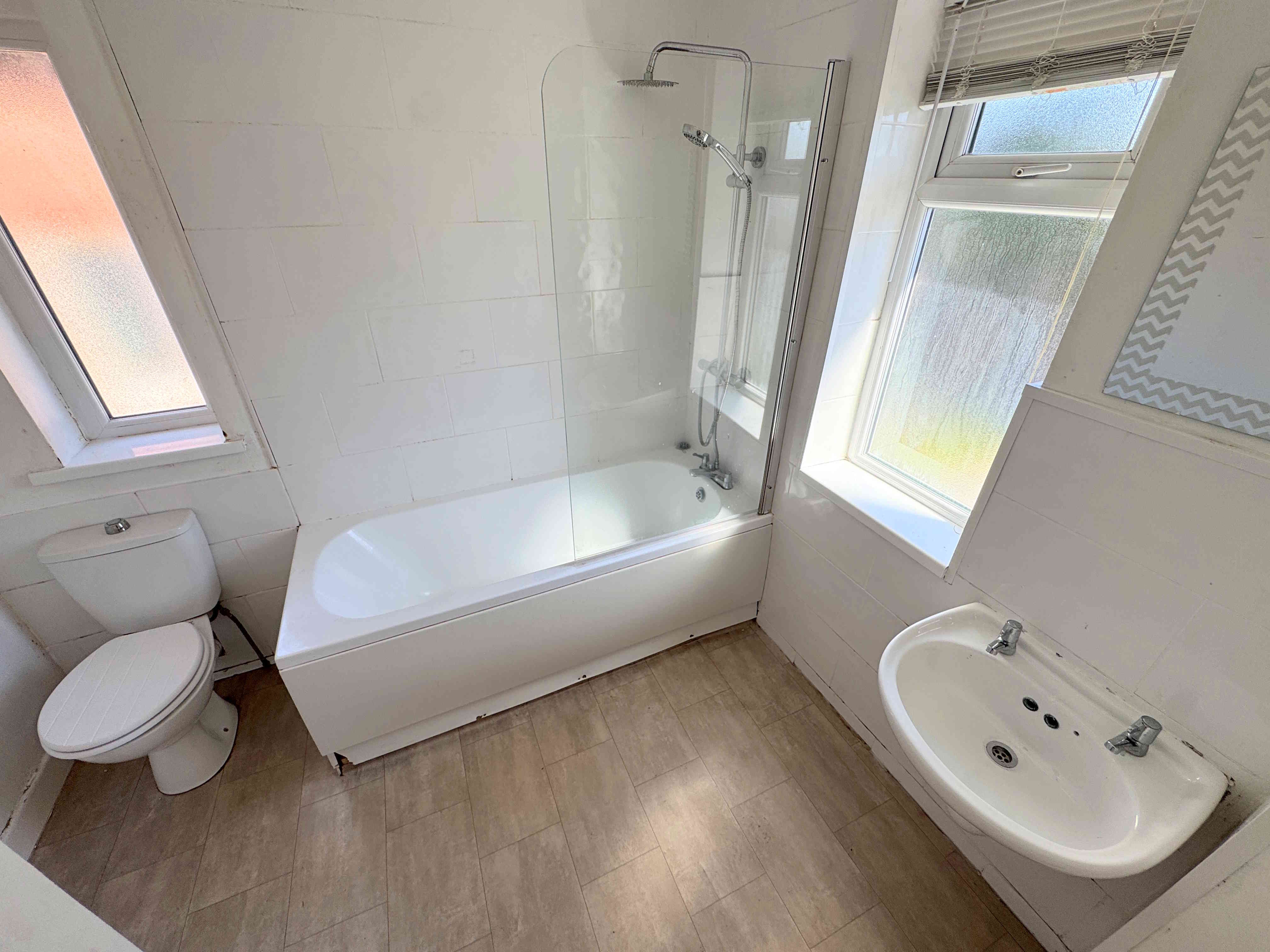 A three-piece bathroom comprising a bathtub with rainfall and handheld power shower, low-flush toilet, and pedestal sink. Additional features include partially tiled walls, a radiator, extractor fan, and UPVC windows.