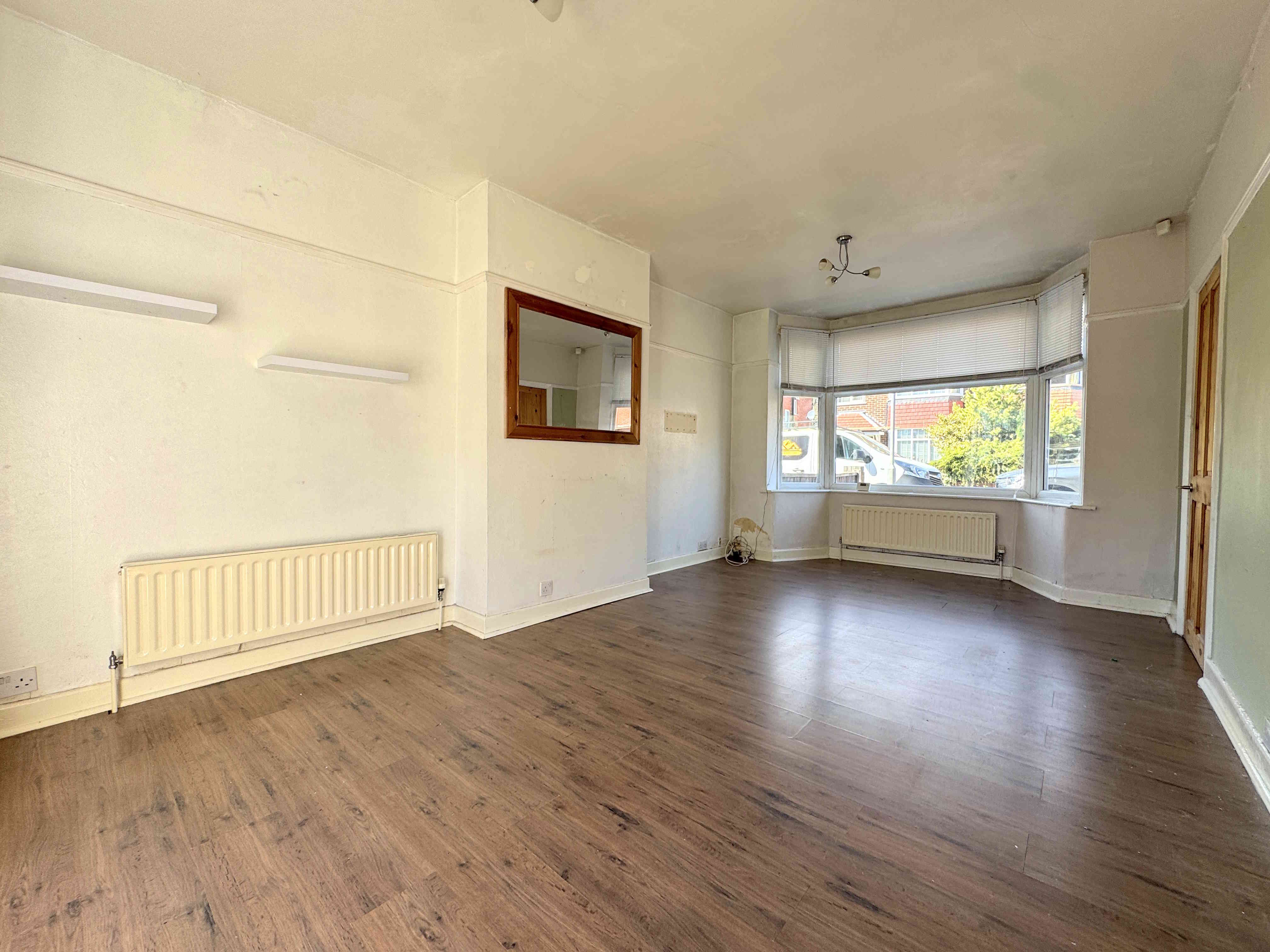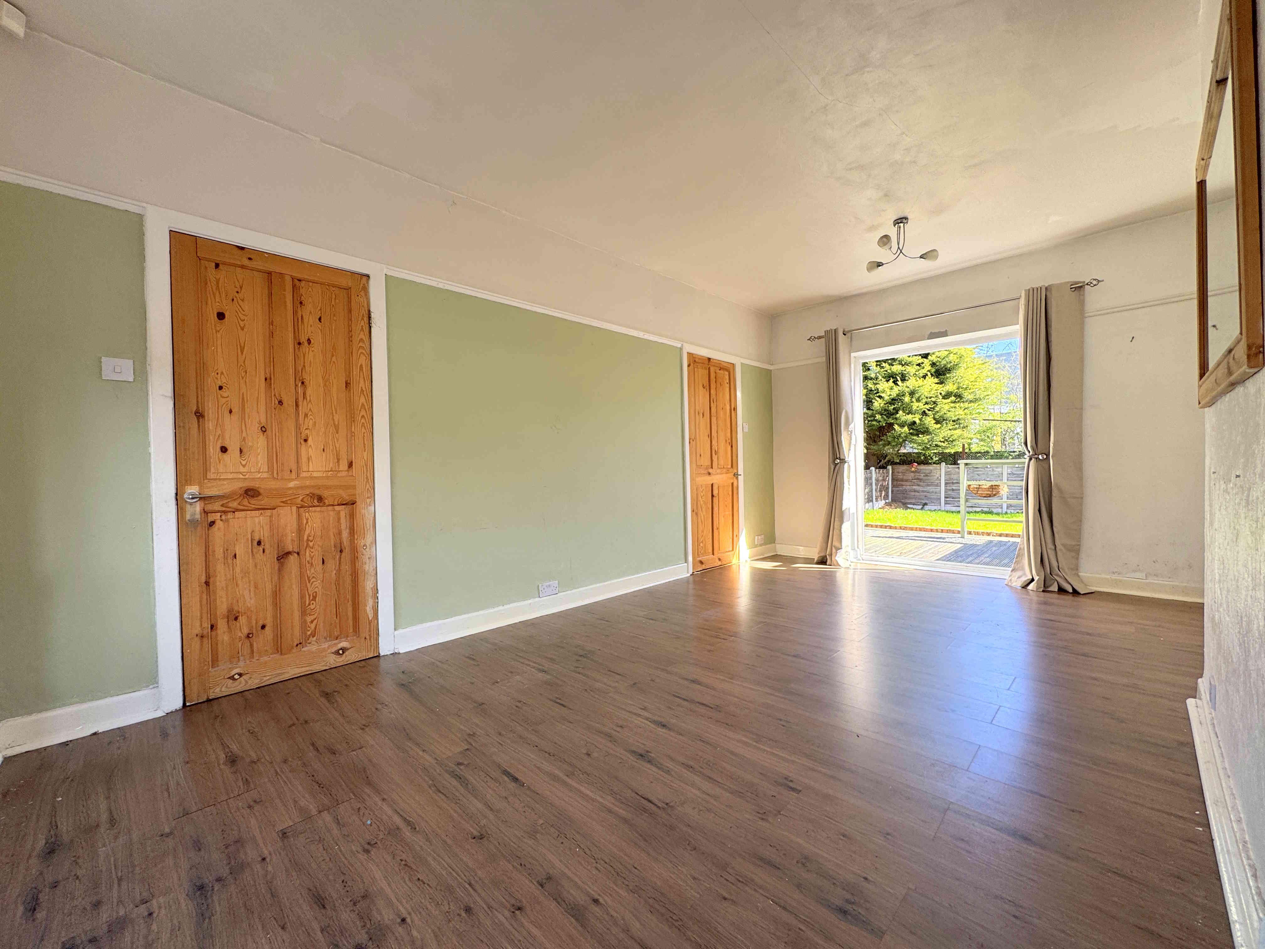 A generous and naturally bright lounge featuring wood-effect laminate flooring, radiators, a UPVC bay window to the front, and UPVC patio doors opening onto the rear garden.