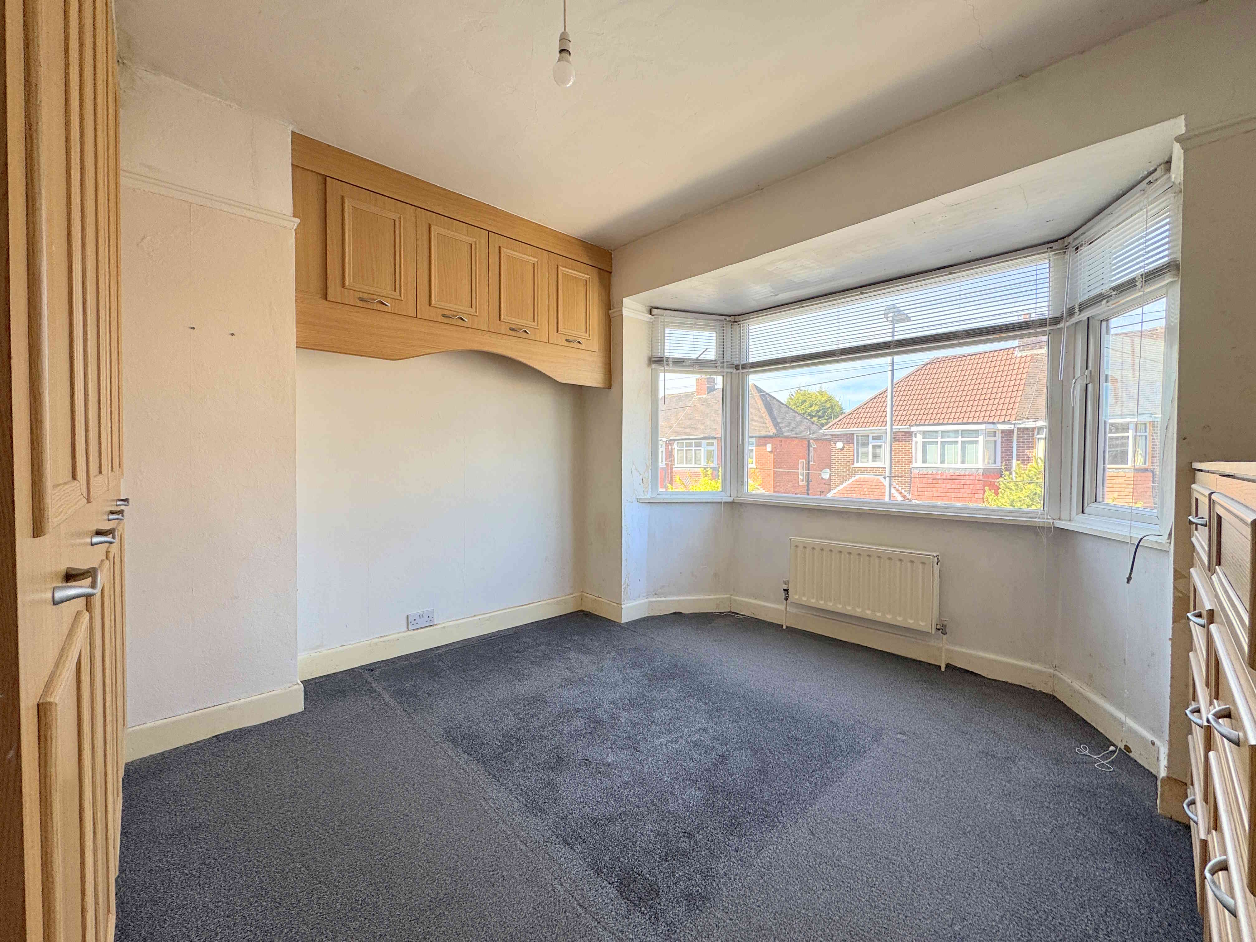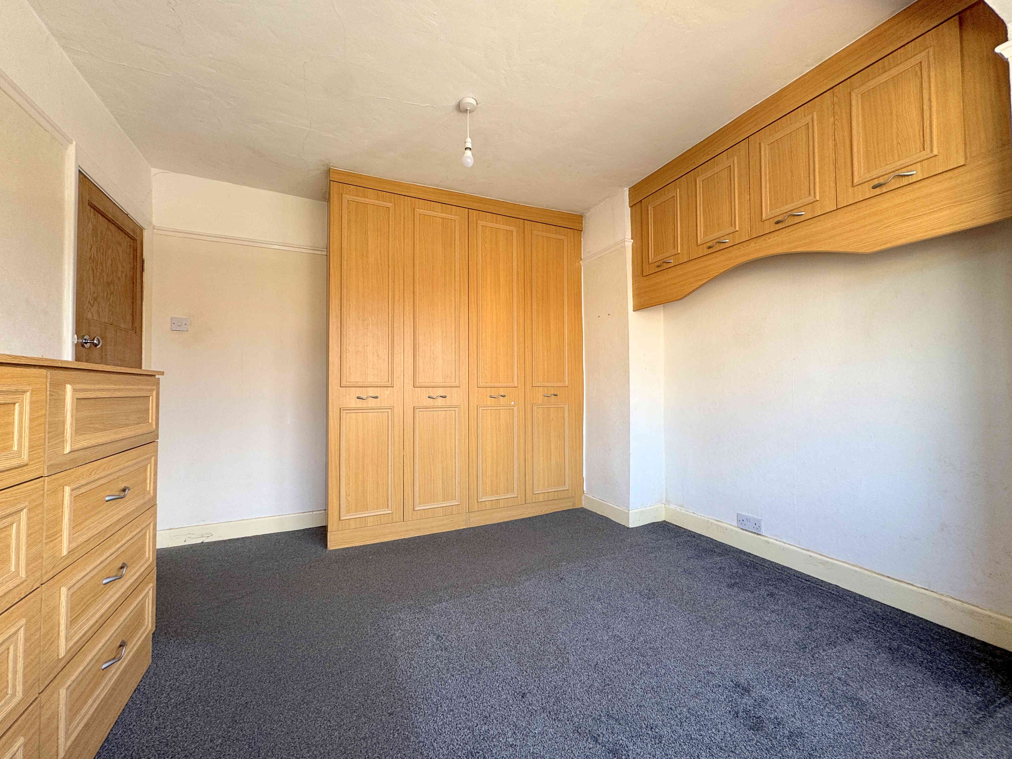 A spacious double bedroom with a fitted suite including full ceiling-height wardrobes and chest of drawers, a radiator, and a UPVC bay window.
