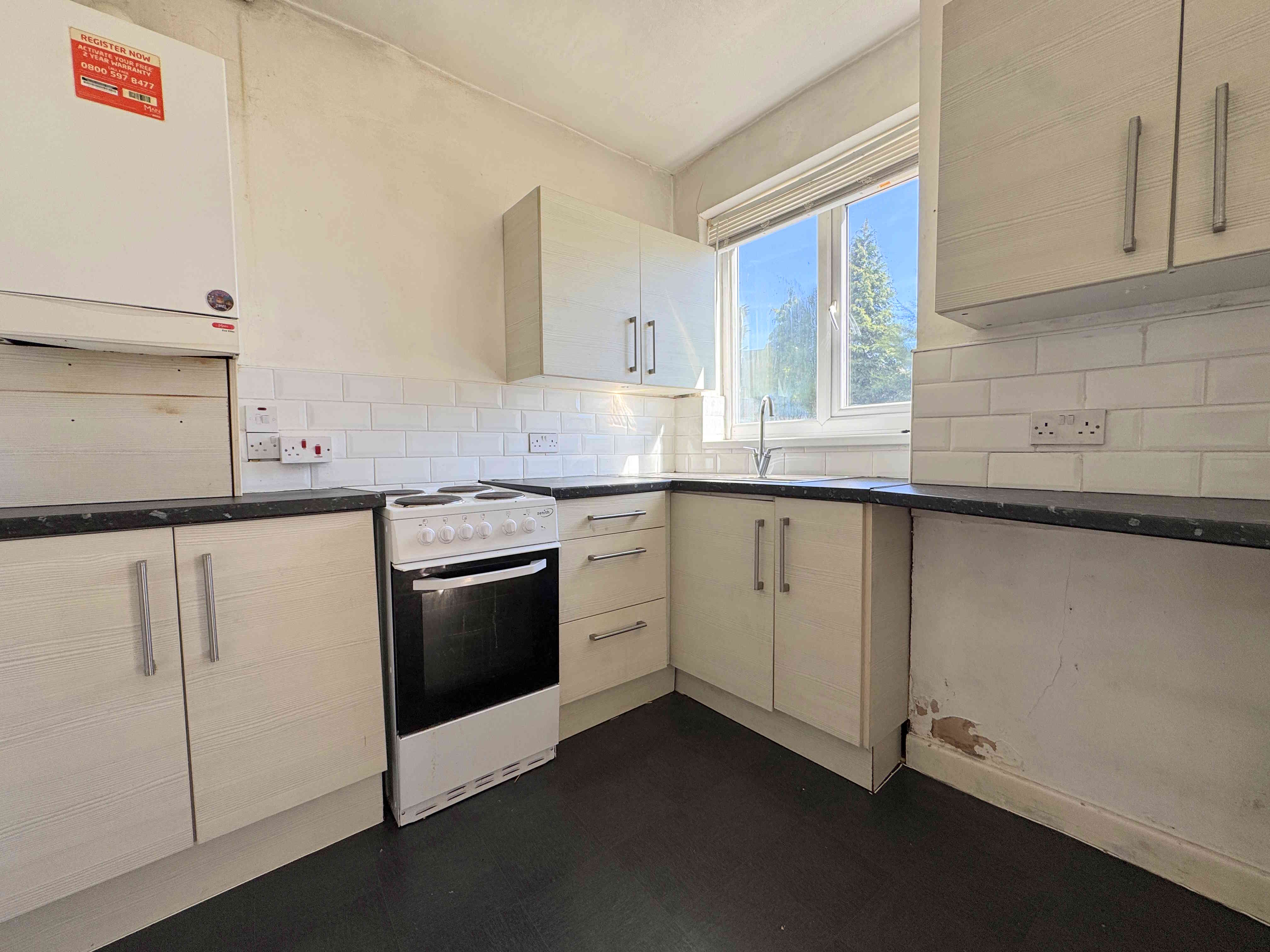 The kitchen is fitted with wall and base units and includes a sink with chrome mixer tap and tiled splashbacks. There is space for an oven, and the room also houses the combination boiler. A radiator and UPVC window complete the space.