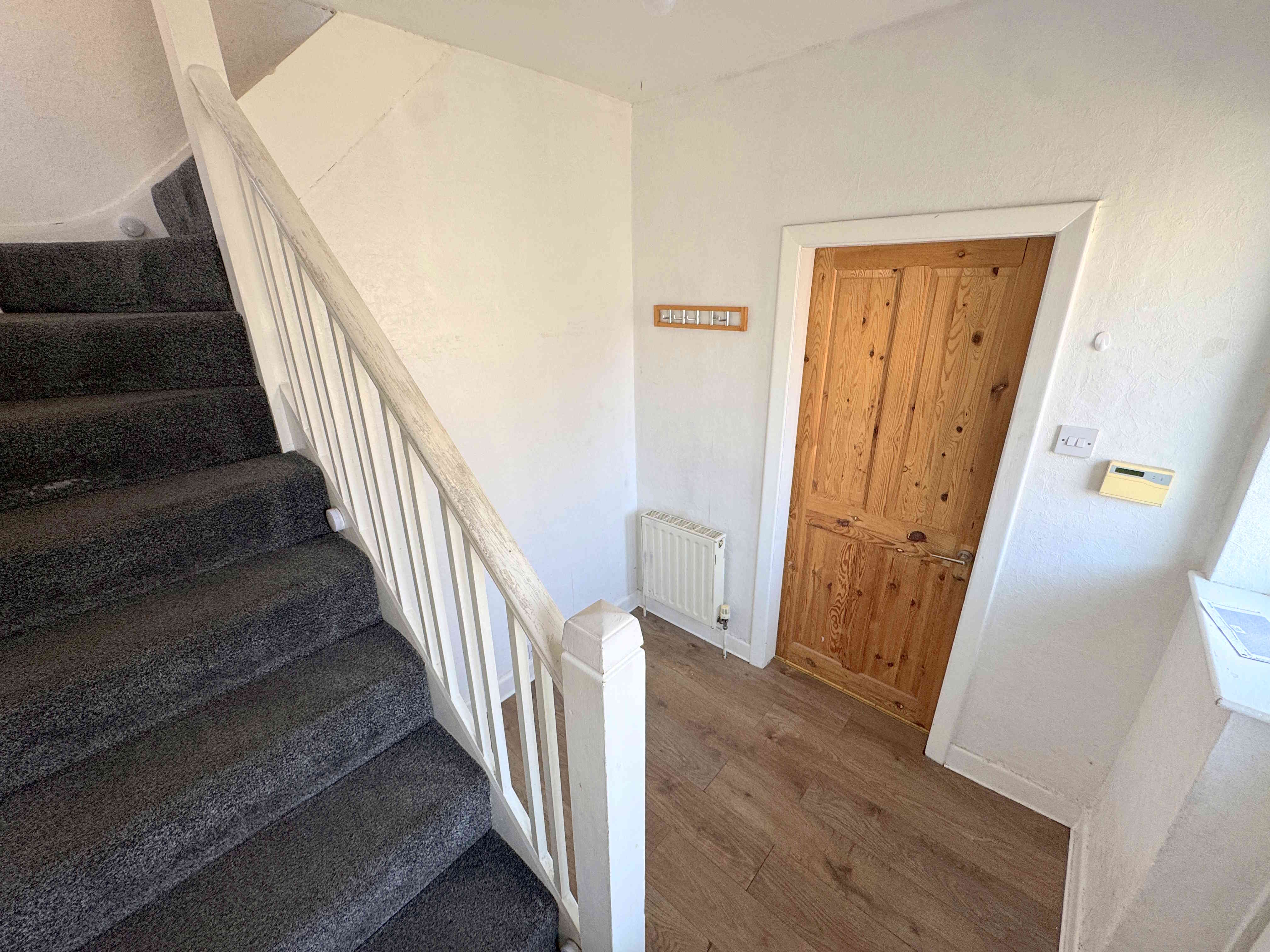 A welcoming entrance hall with an open staircase, wood-effect laminate flooring, a radiator, a UPVC front door, and UPVC windows.