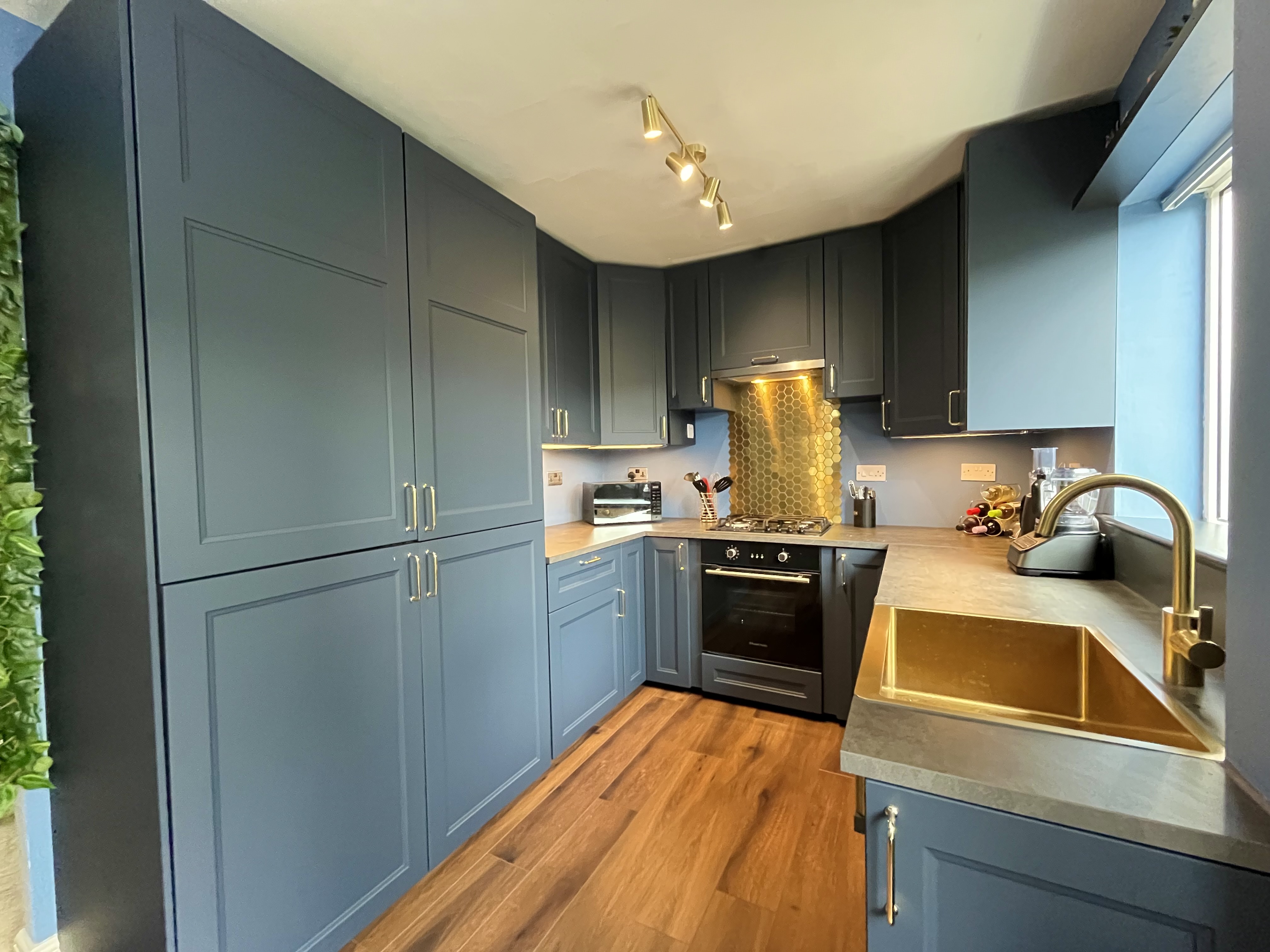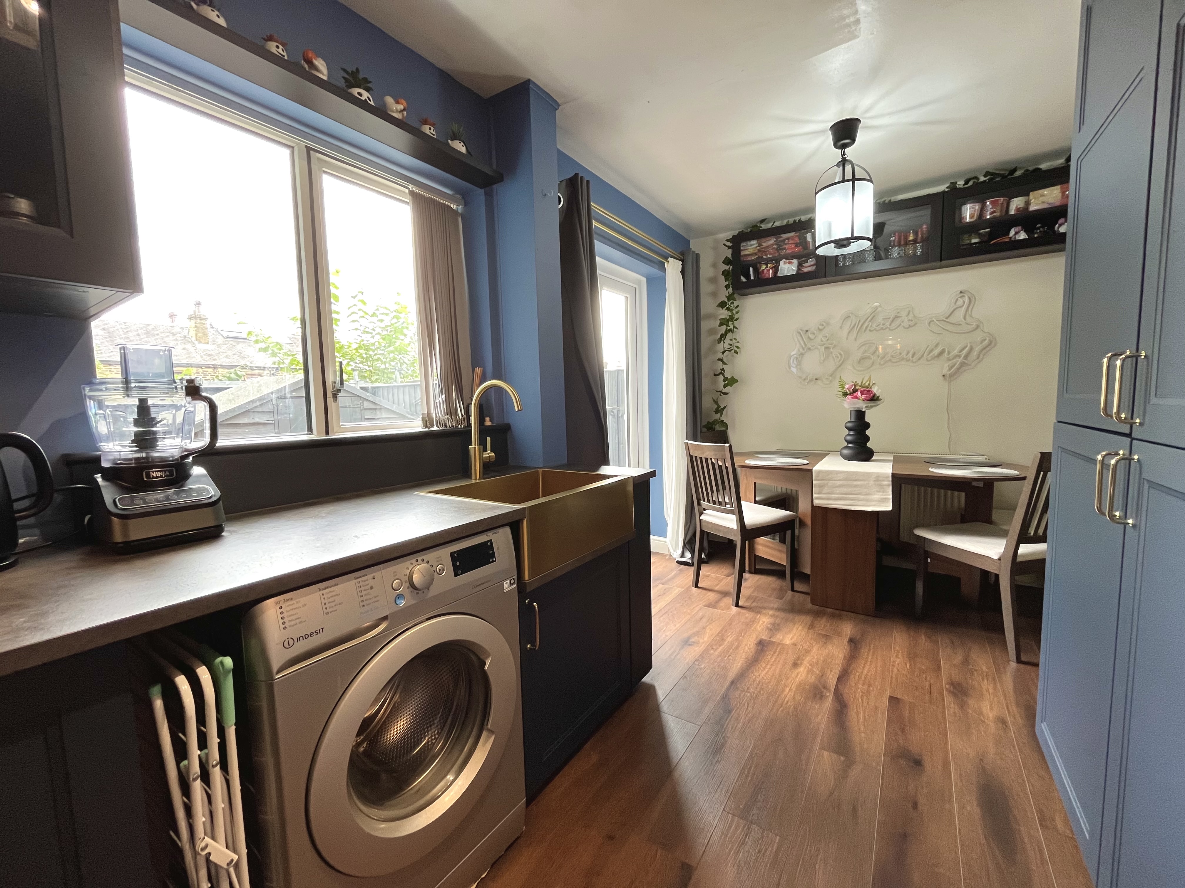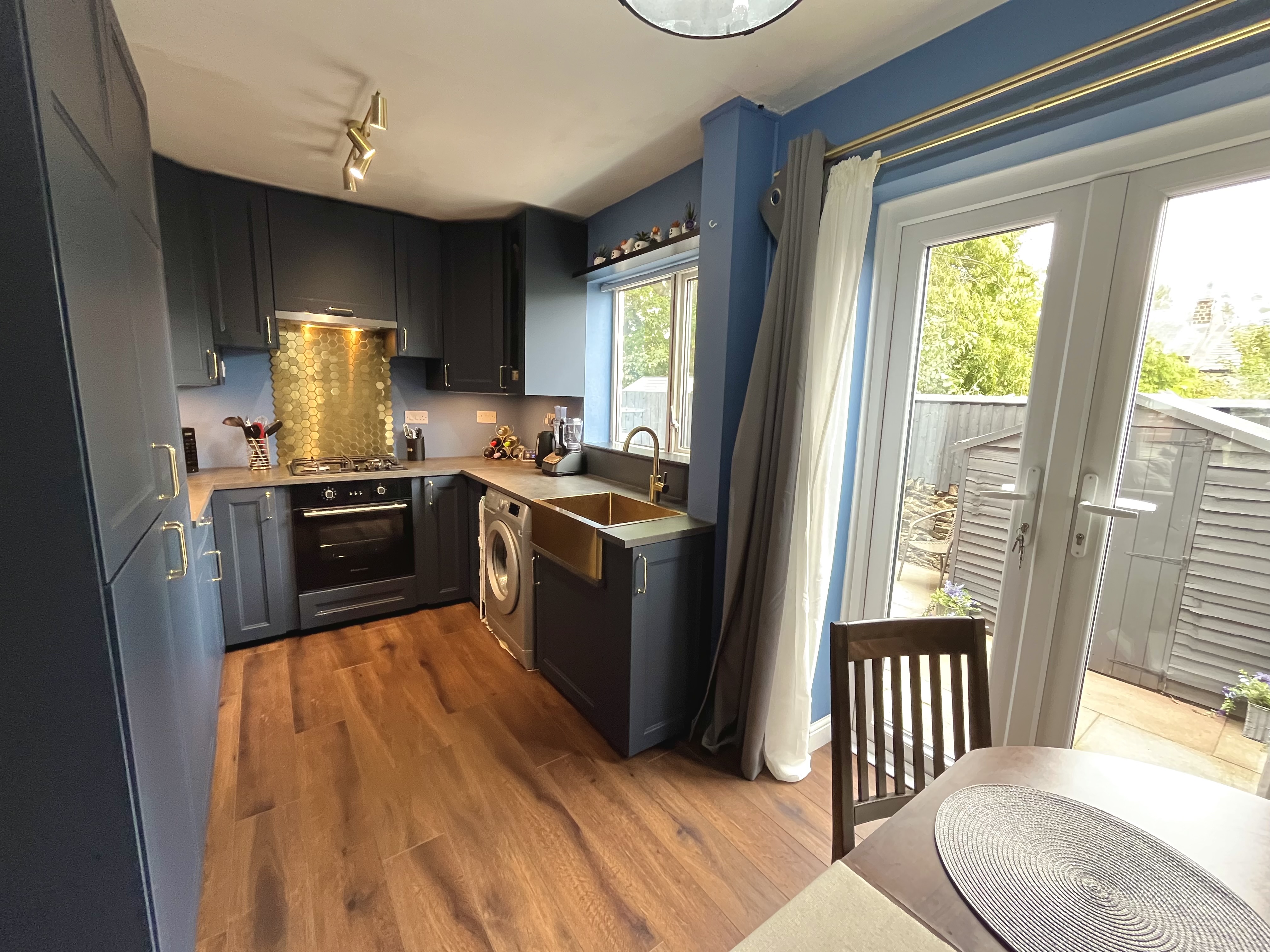 A stylish and newly renovated fitted kitchen with under-cabinet lighting and a brushed chrome sink with matching mixer tap. Integrated appliances include a fridge freezer, built-in oven, hob with brushed gold splashback, and extractor fan. There is also space and plumbing for a washing machine. The room is completed by a radiator, a UPVC window, and UPVC patio doors that open onto the rear garden.