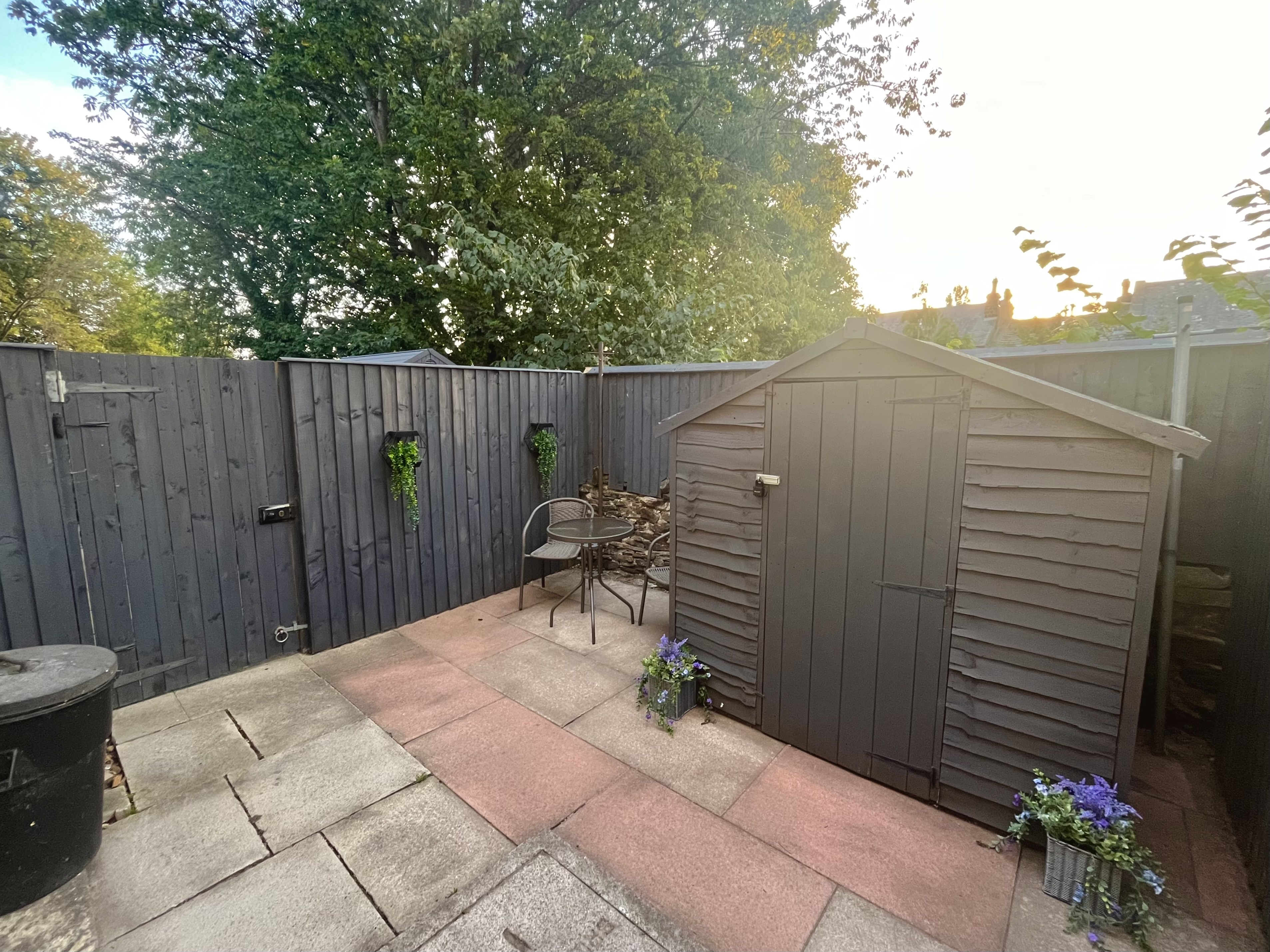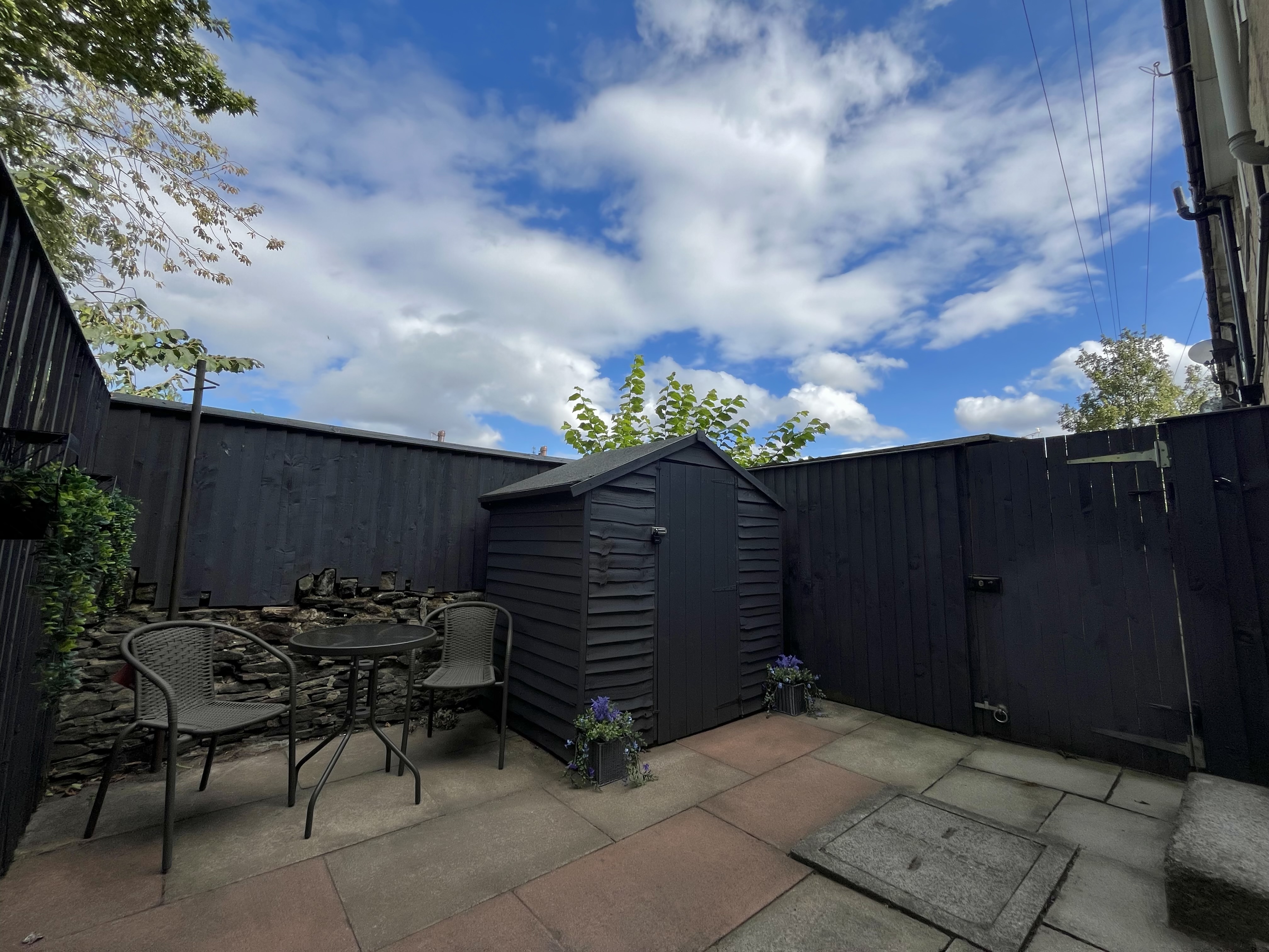To the front of the property is an enclosed garden with a lawn and a flagged path, along with a private, resident’s only forecourt parking. The rear of the property features a fully enclosed flagged garden with a shed, offering a private and low-maintenance outdoor space.