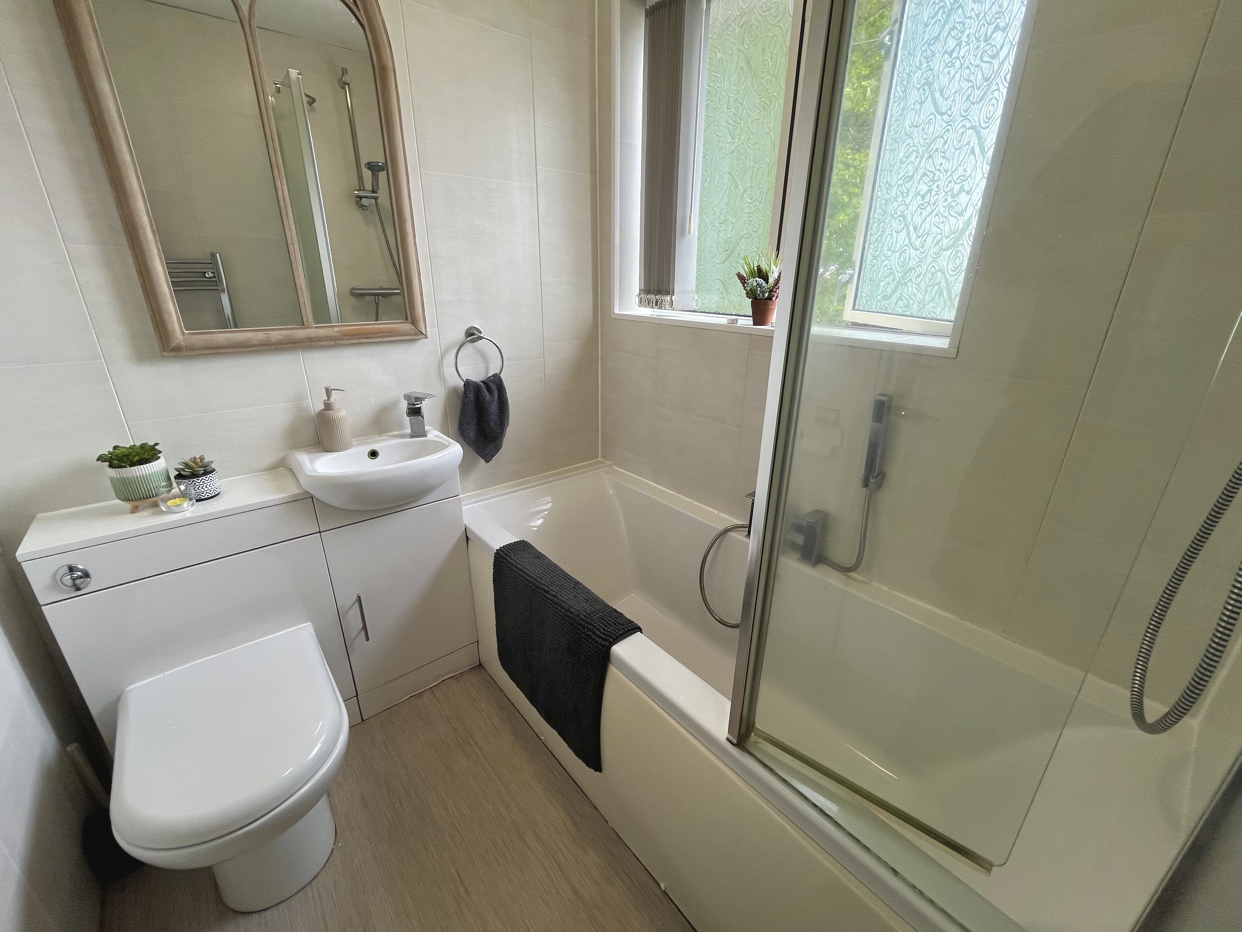 A modern bathroom suite comprising a bathtub with handheld power shower above, a low flush toilet, and a vanity sink unit. Additional features include a chrome towel radiator and a UPVC window.