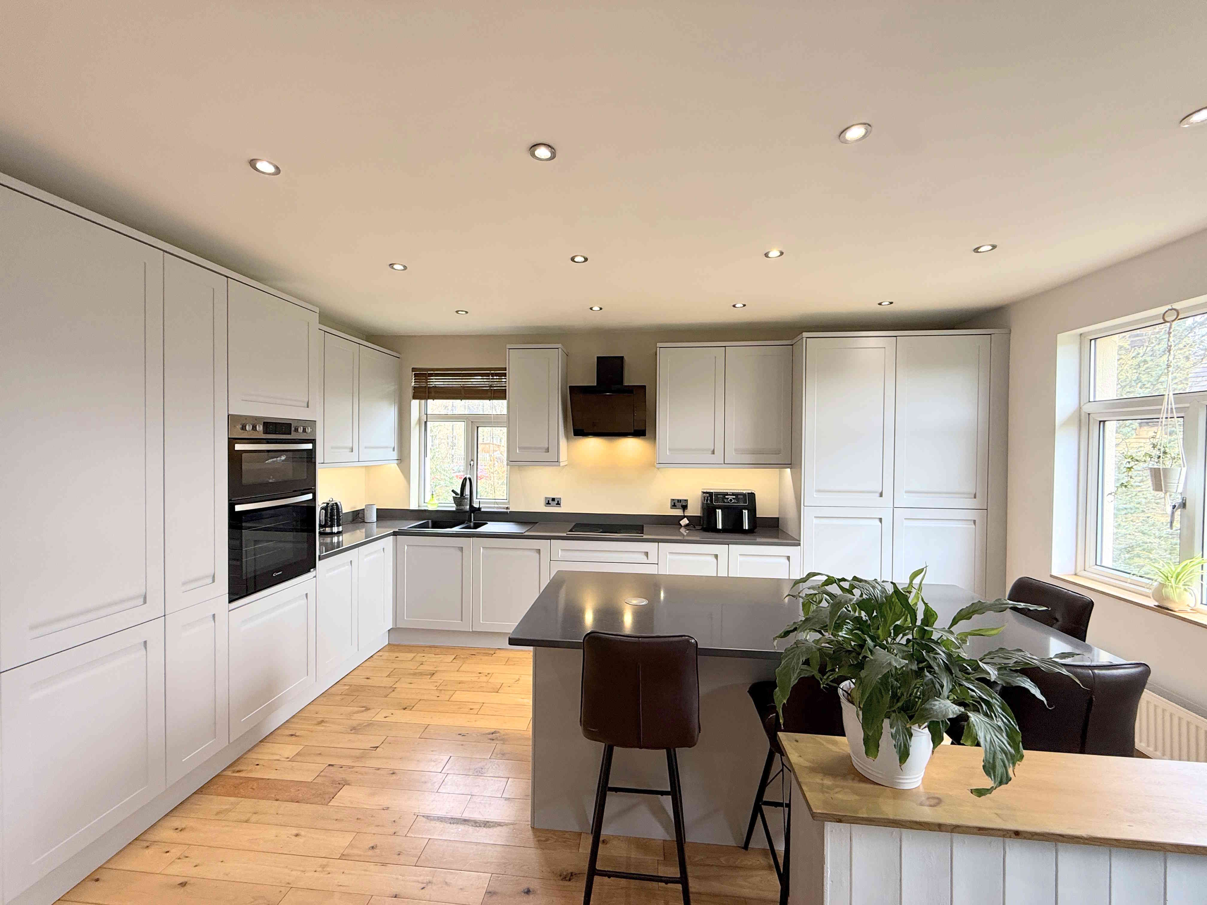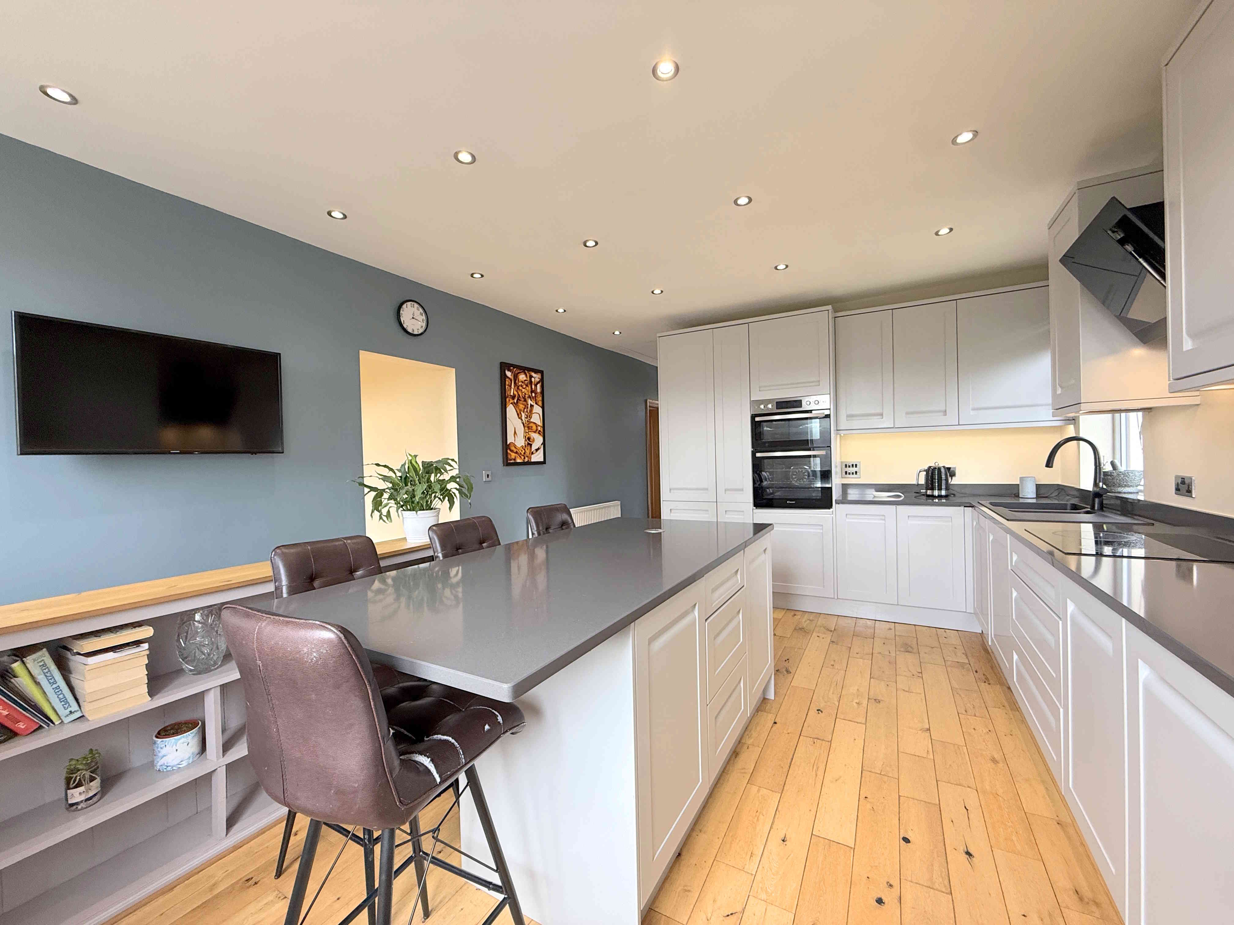 A superb dining kitchen designed for both everyday living and entertaining. It features a one-and-a-half bowl sink with mixer tap, integrated dishwasher, fridge freezer, and a built-in induction hob, extractor fan, oven, and grill. The impressive kitchen island provides additional storage, seating for four, and a discreet pop-up socket, all set against solid oak flooring and illuminated by ceiling spotlights. UPVC windows frame the hillside outlook, while steps with sensor lighting lead neatly to the lower level.