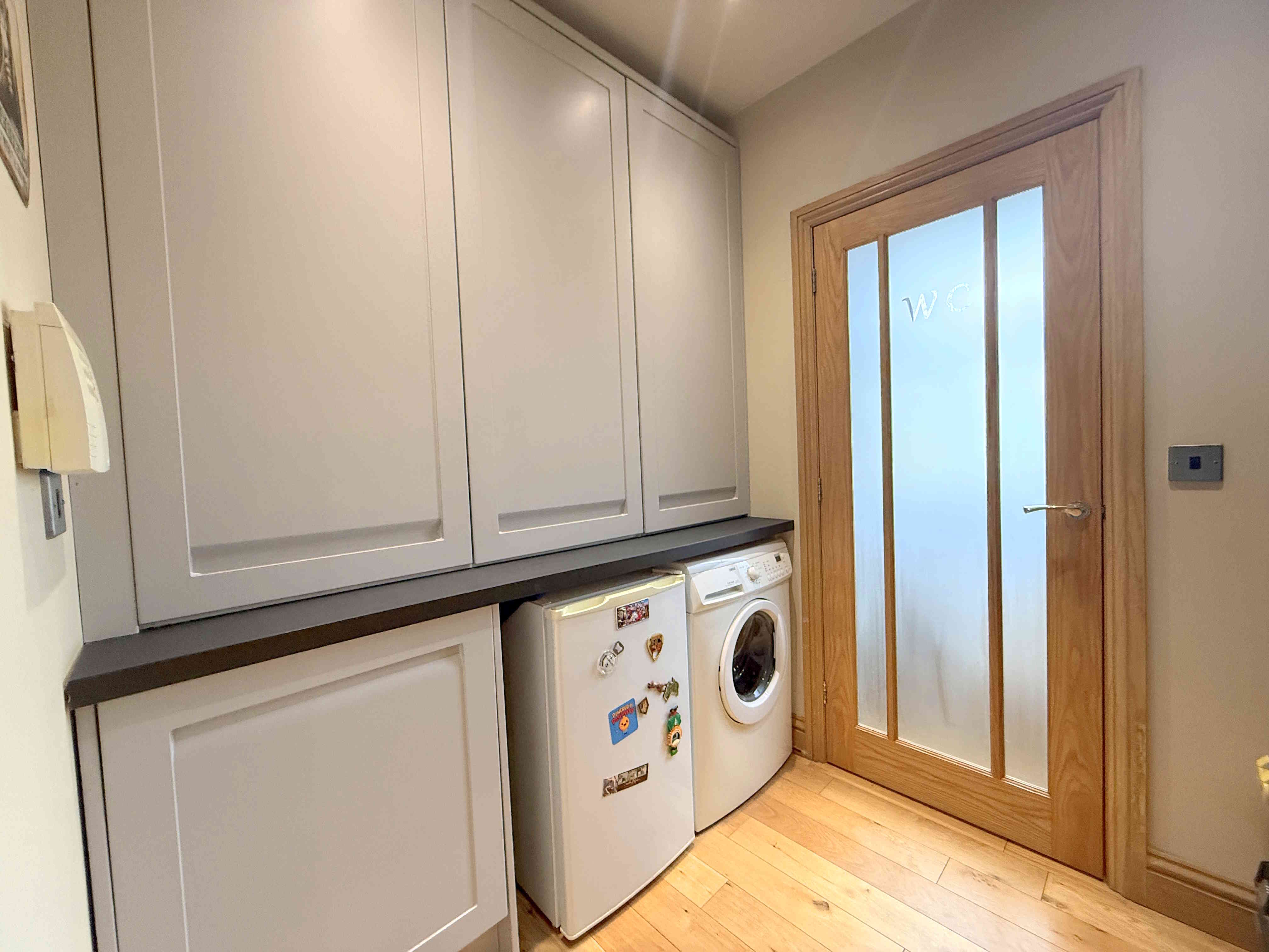 A practical and well-organised utility room fitted with cabinets housing the combination boiler and offering space for a washing machine. Finished with solid oak flooring, ceiling spotlights, and a radiator, it provides an ideal functional extension to the kitchen.