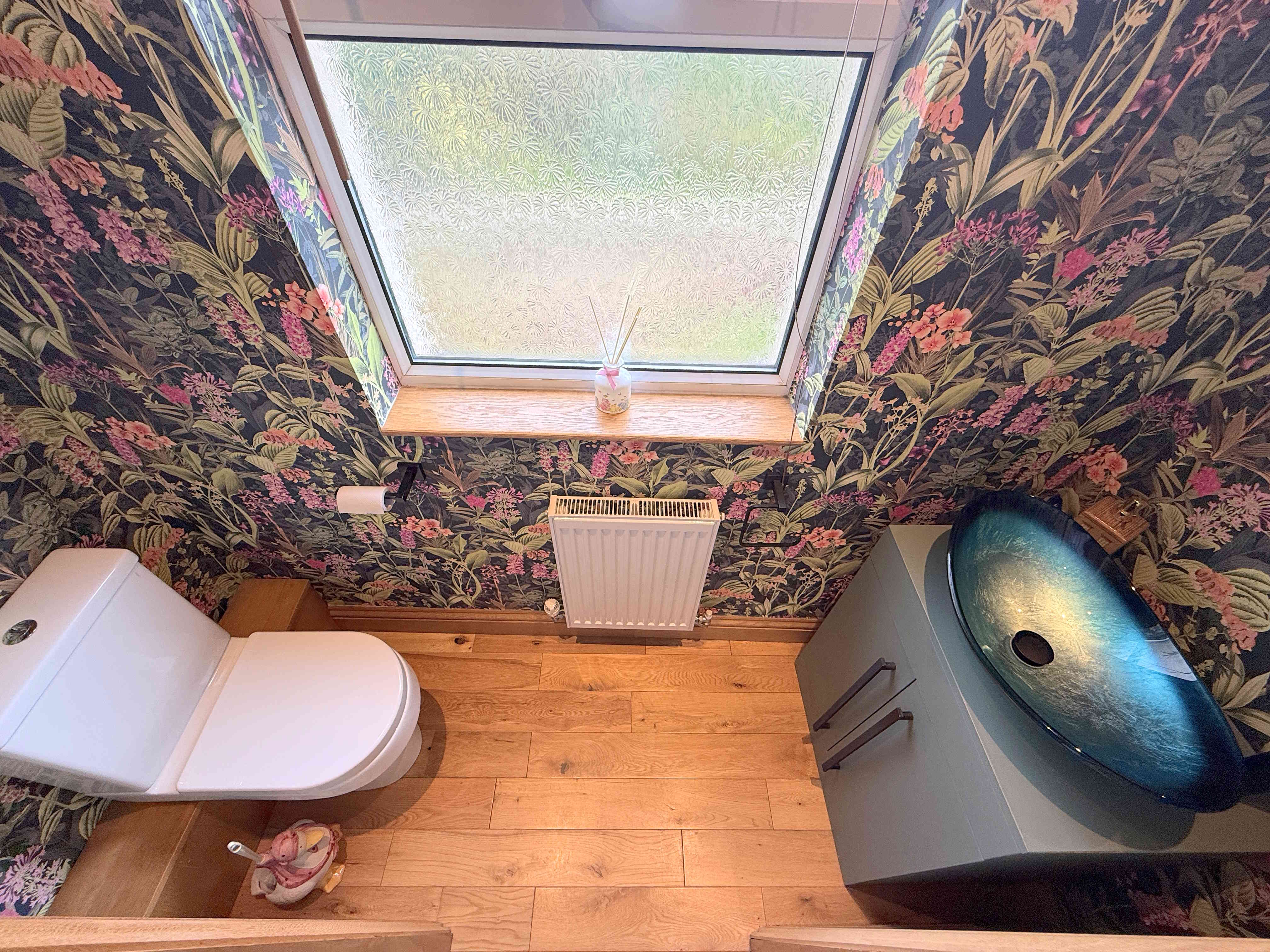 A stylish cloakroom featuring tasteful décor, ceiling spotlights, solid oak flooring, a radiator, and a UPVC window—an attractive and convenient addition to the home.