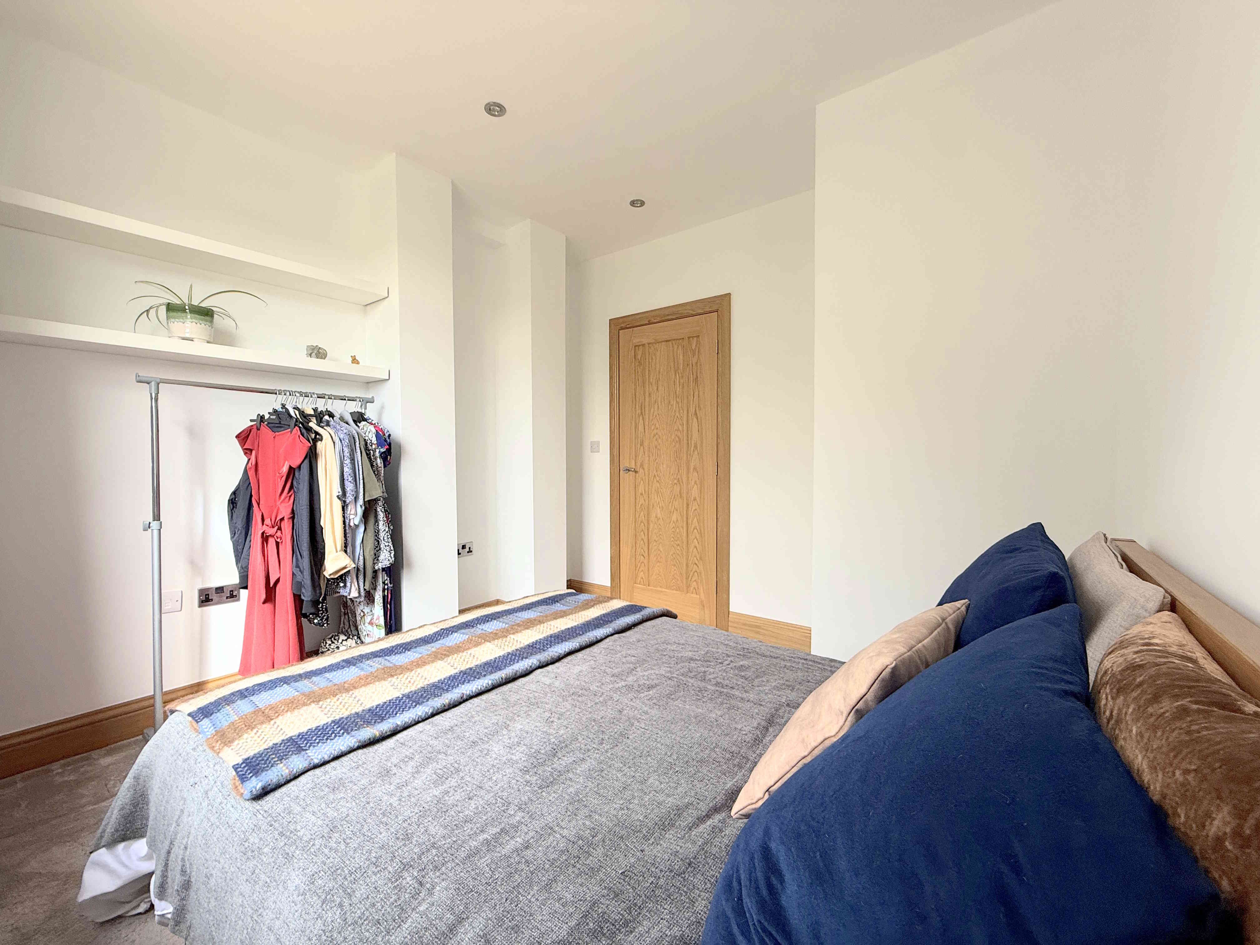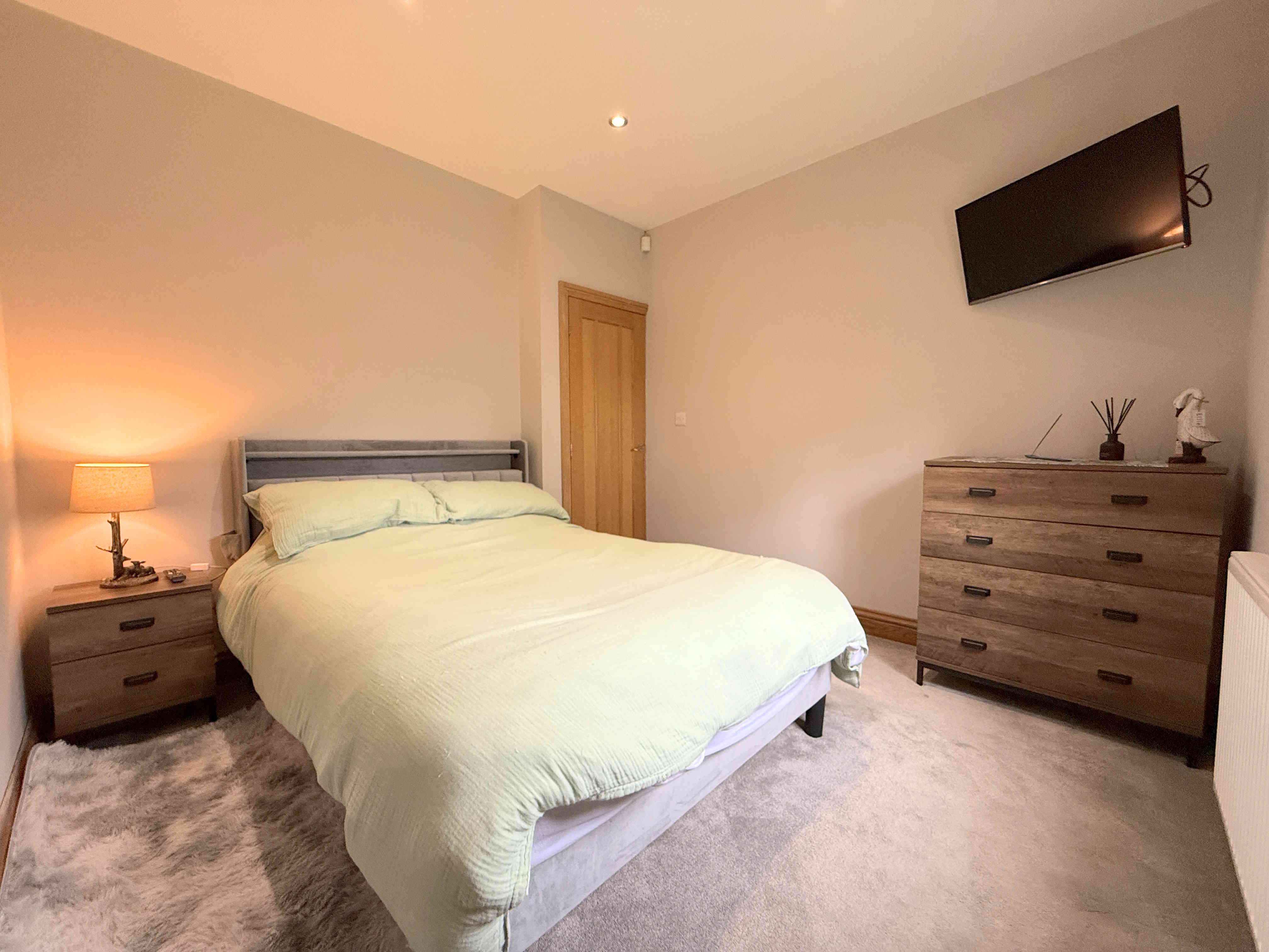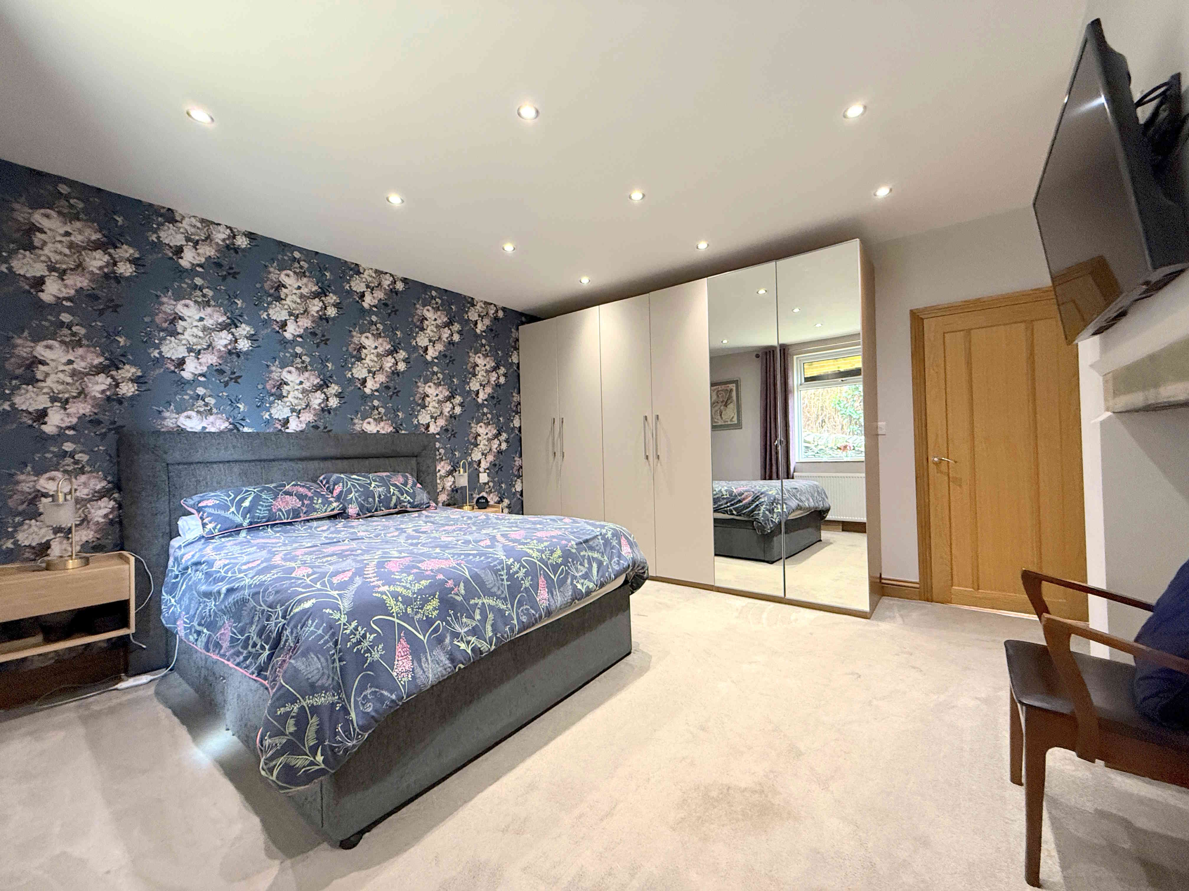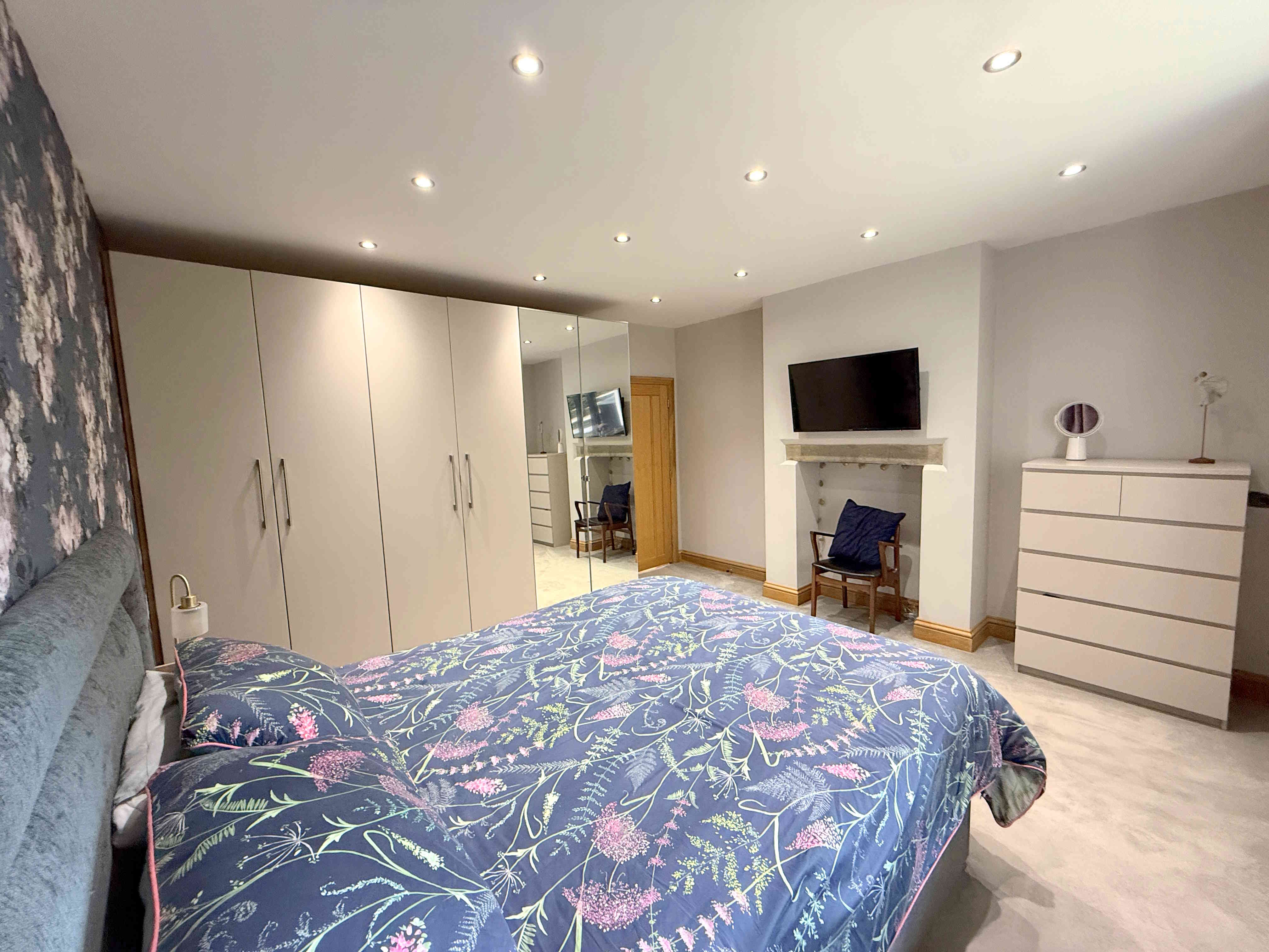 A generously sized double bedroom complete with full-length fitted wardrobes offering ample storage. A UPVC window, ceiling spotlights and a radiator contribute to a well-presented room.