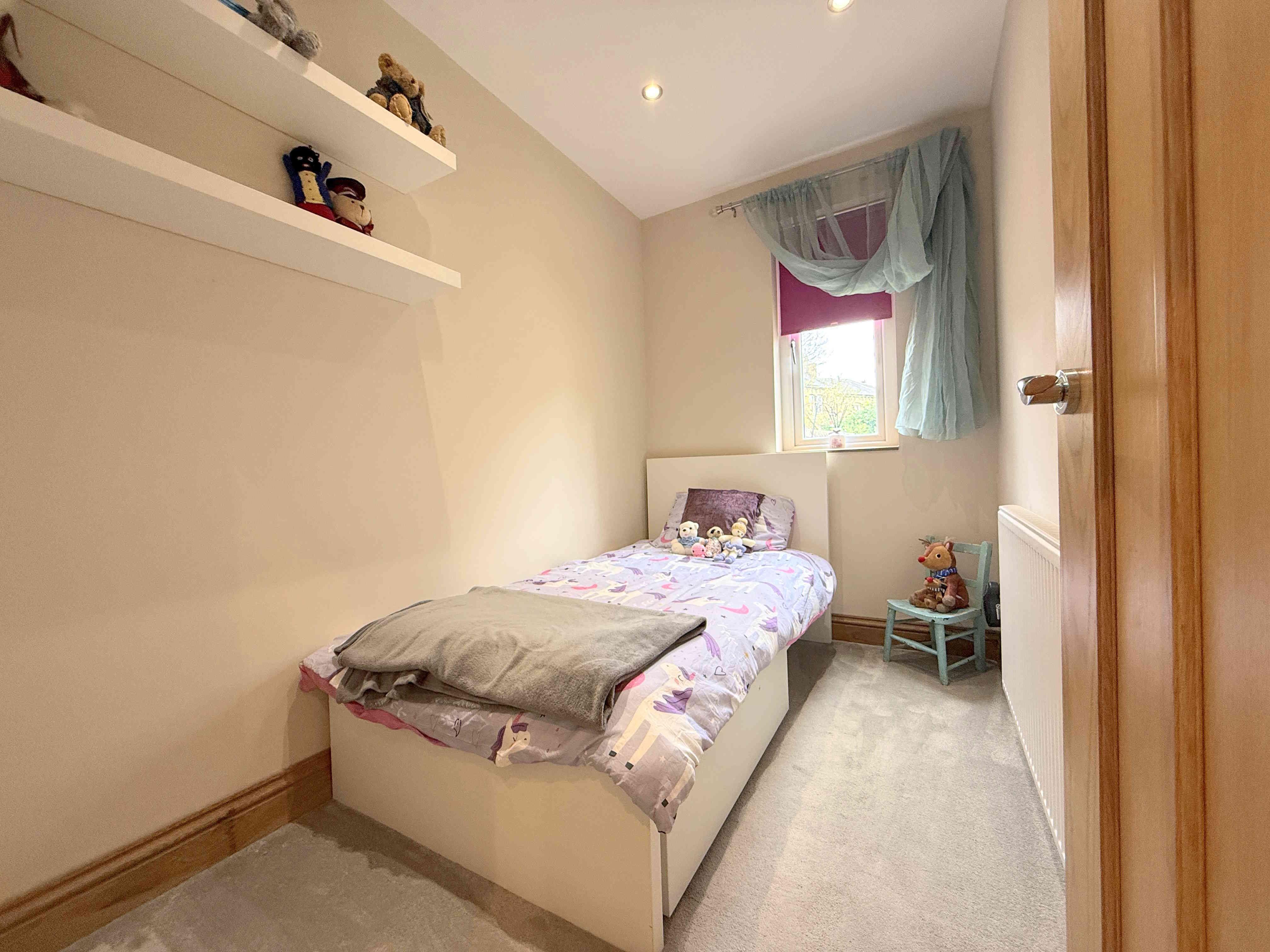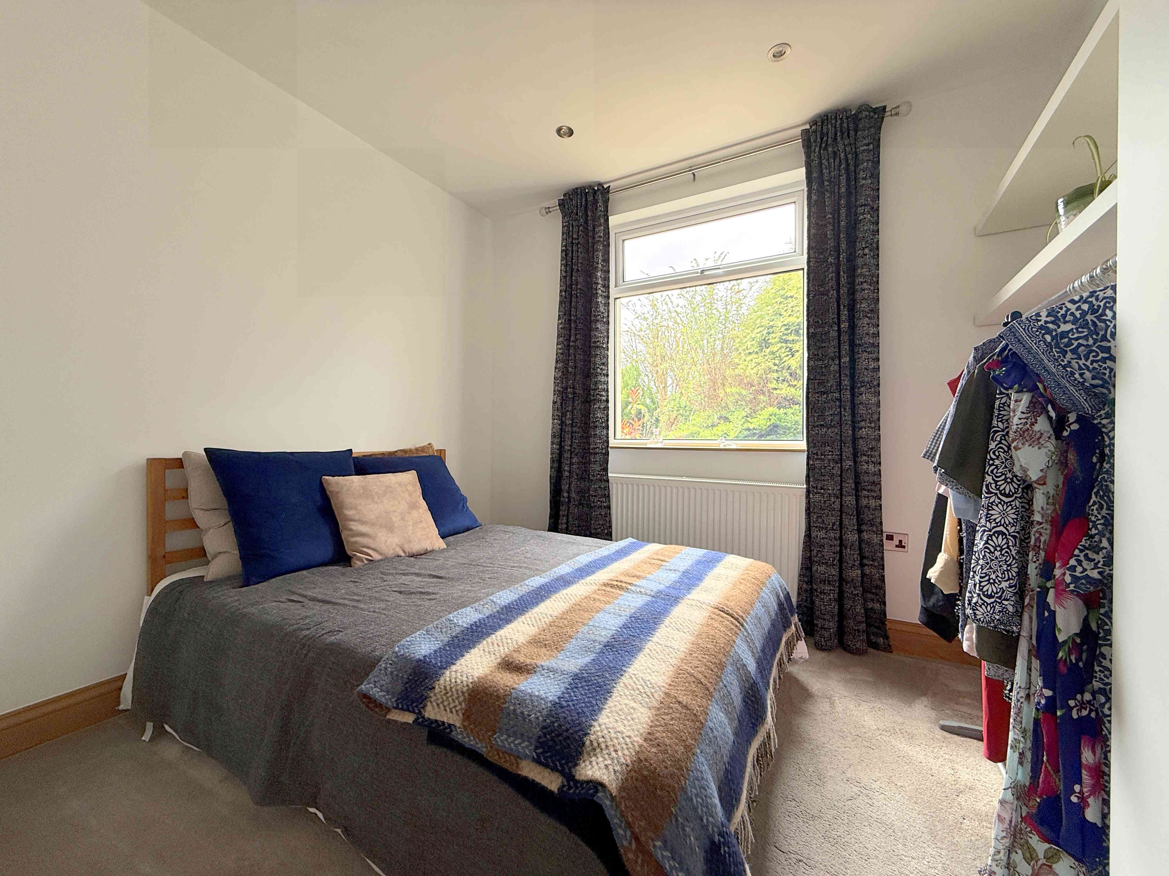 A single bedroom with a radiator and ceiling spotlights, and a UPVC window, providing flexibility for use as a bedroom, nursery, or office.