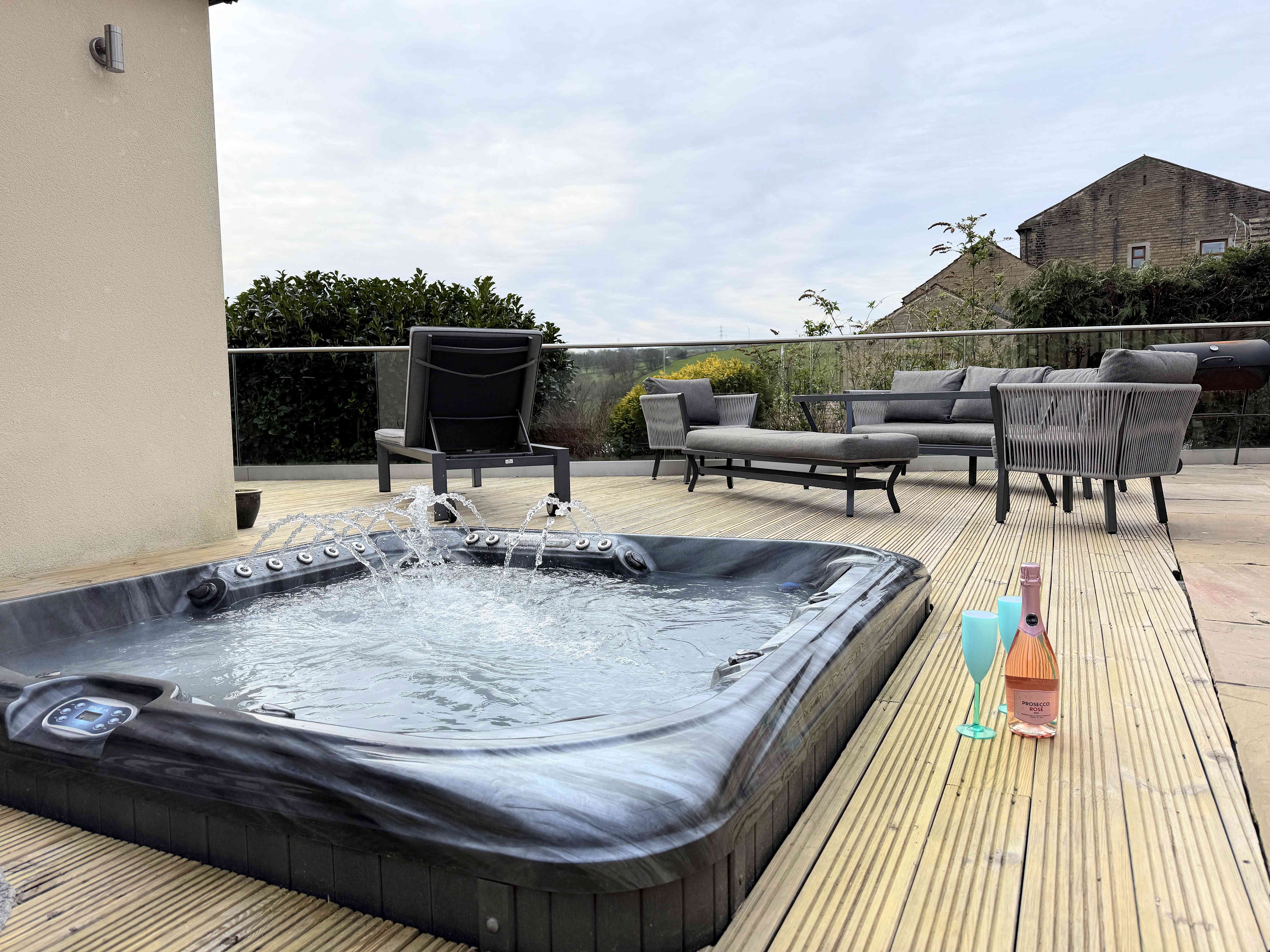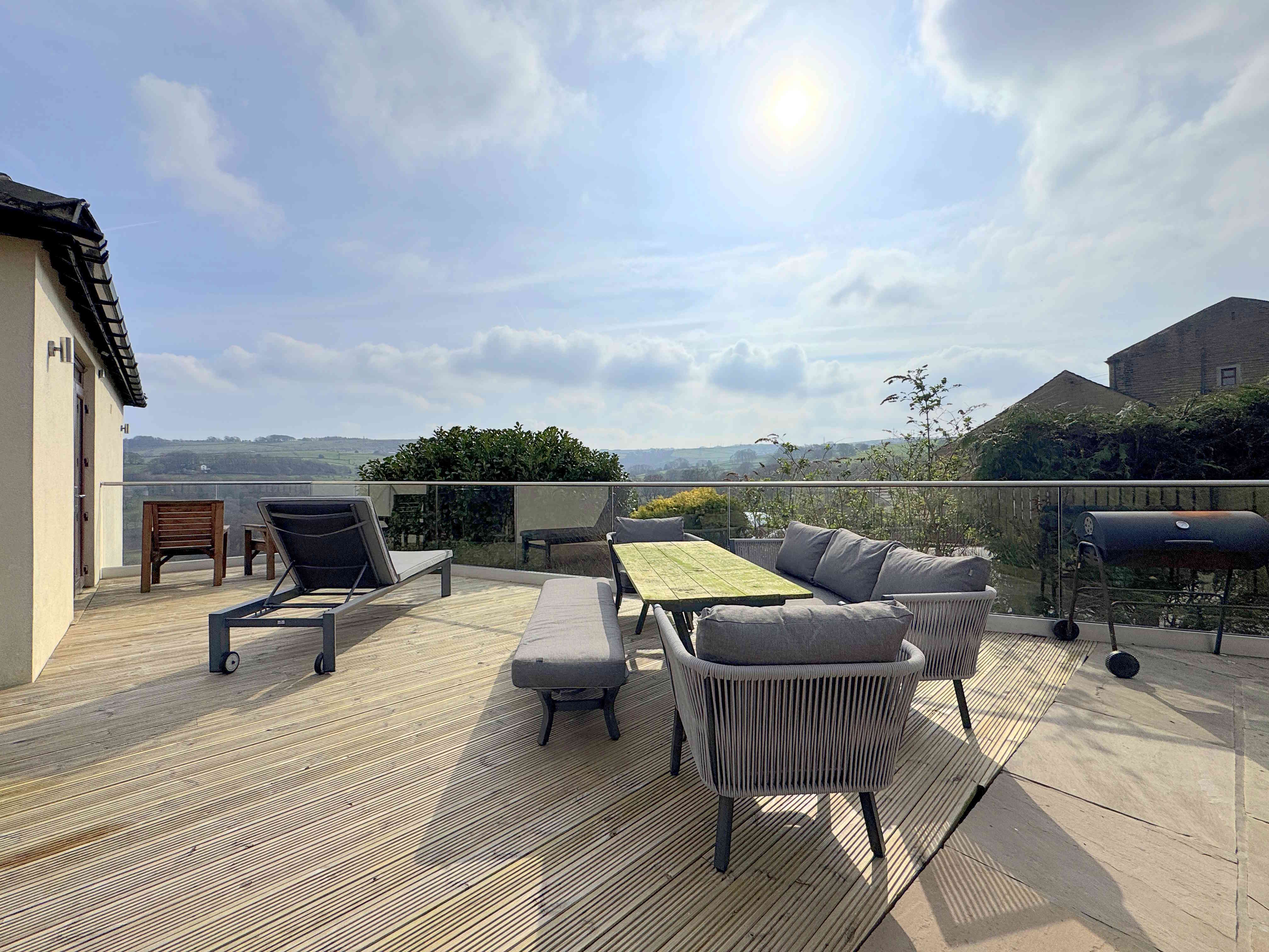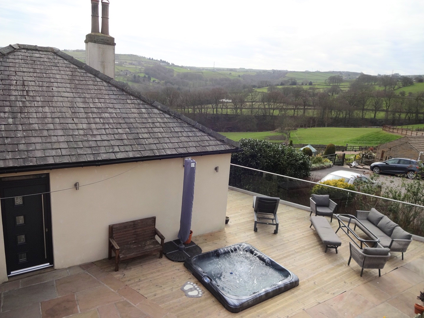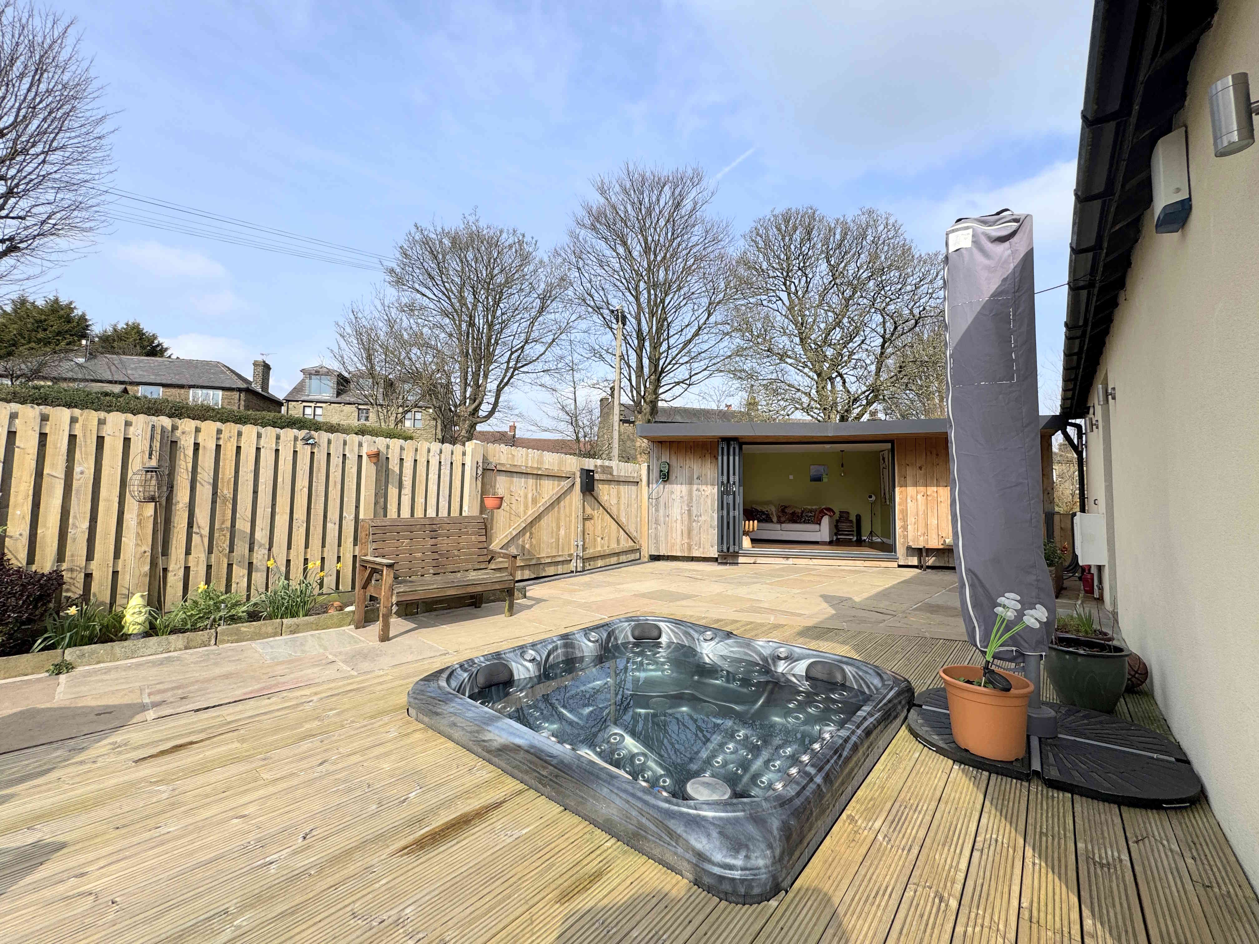 The rear of the property offers an enclosed lawned garden with well-kept bedding borders, complemented by a Yorkshire stone patio enjoying far-reaching hillside views. The patio extends to the side of the property, where there is practical storage beneath the decking. Steps lead up to a raised patio and decking area with glass balustrade, additional bedding areas, and a sunken hot tub—an ideal setting for peaceful relaxation. To the front, a generous driveway provides parking for multiple vehicles and includes an EV charging point.