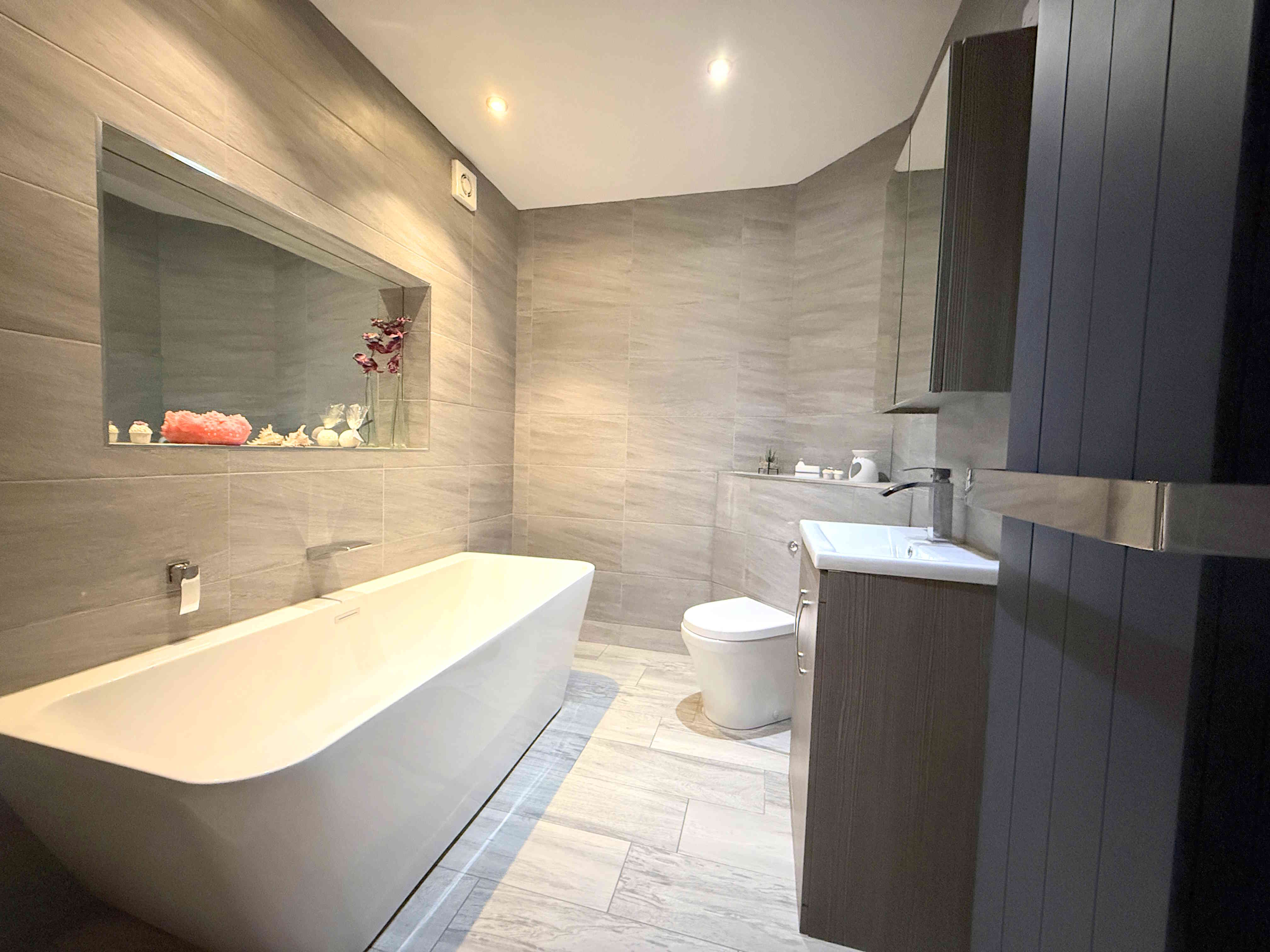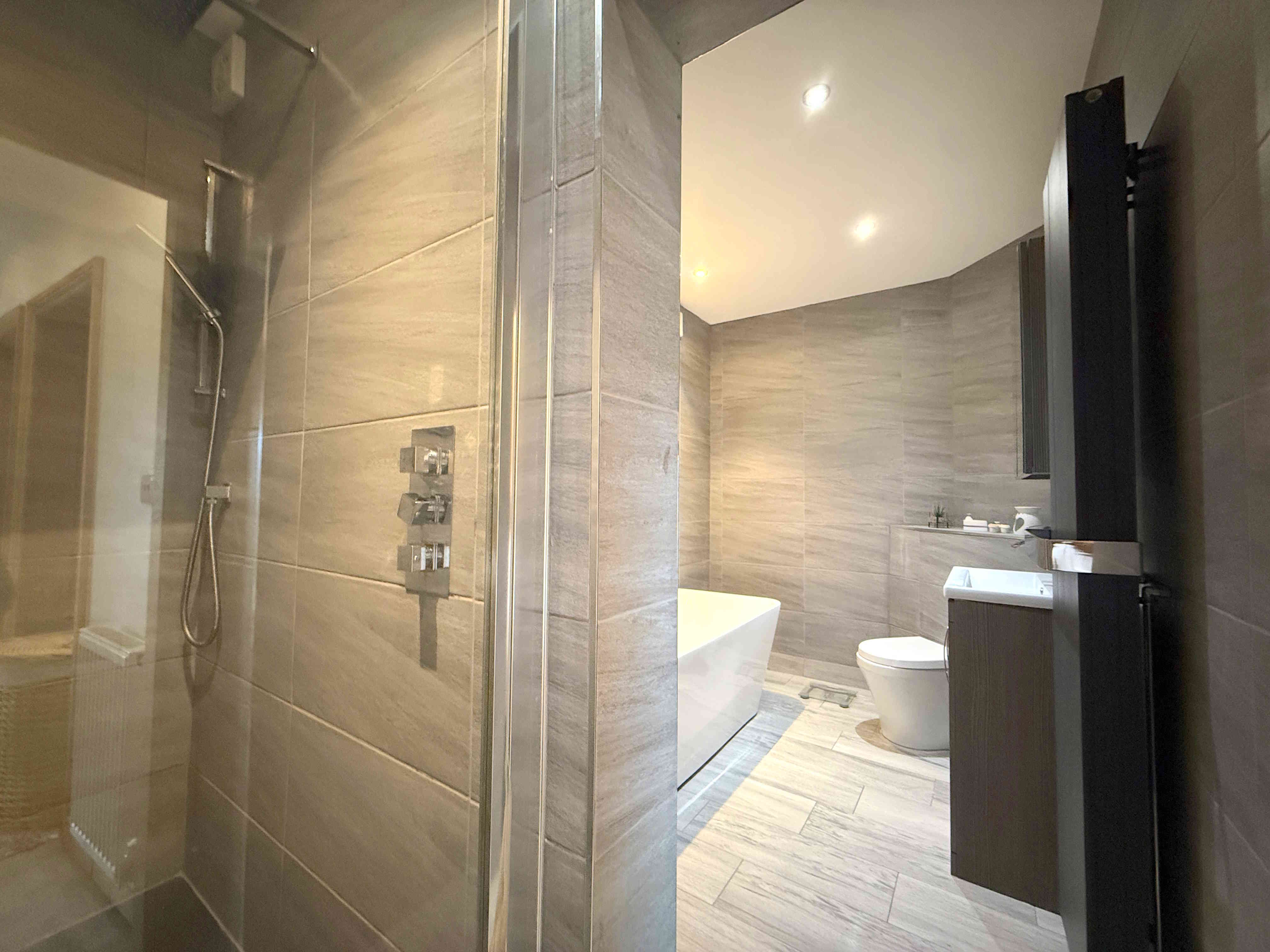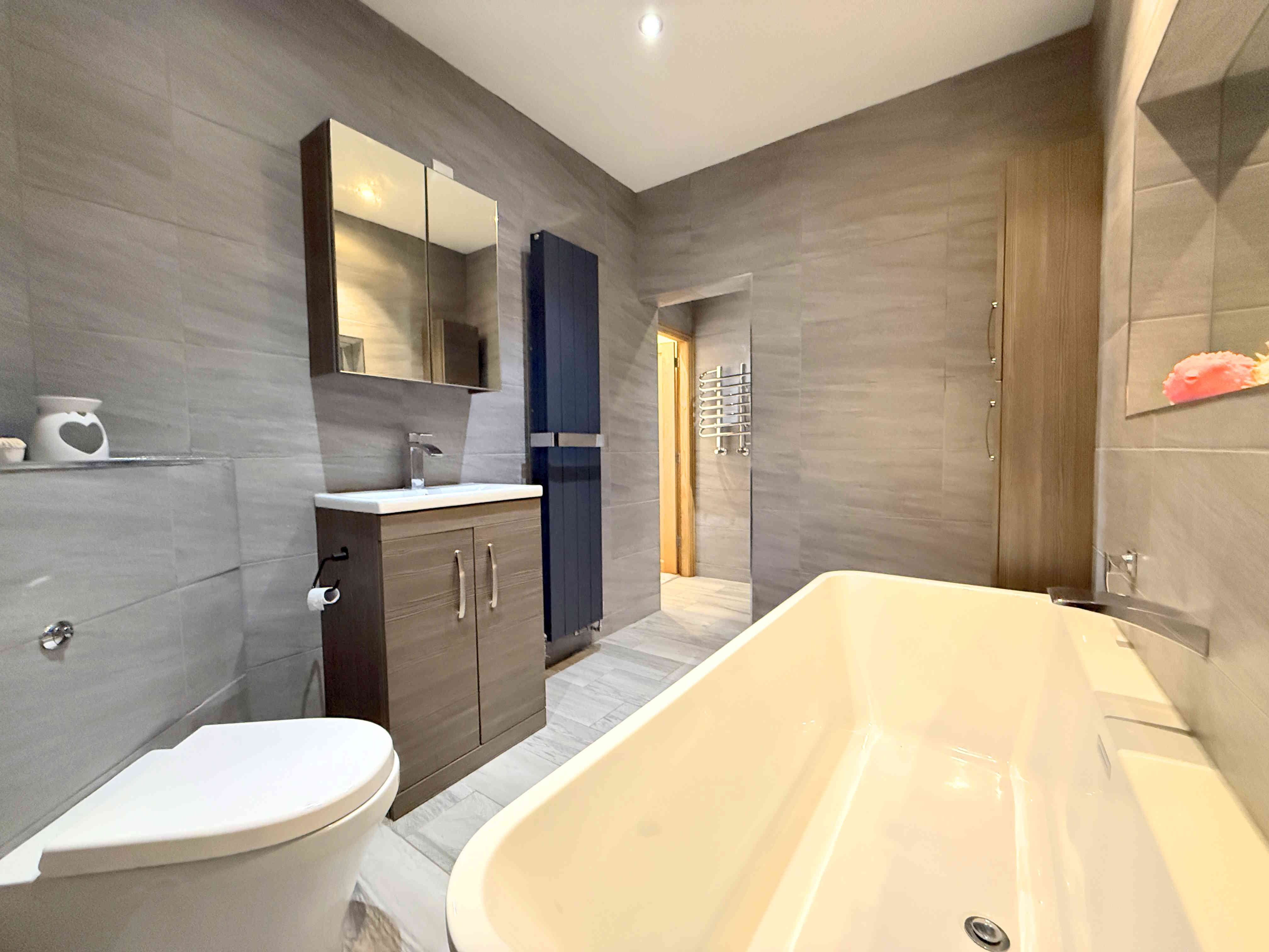 A beautifully appointed four-piece bathroom comprising a large bathtub, walk-in shower cubicle with glass screen, rainfall and handheld shower, low flush toilet and vanity sink unit. The space is enhanced by tiled walls and flooring, modern radiators, a wall-mounted mirrored cabinet, ceiling spotlights, and an extractor fan, creating a luxurious finish.