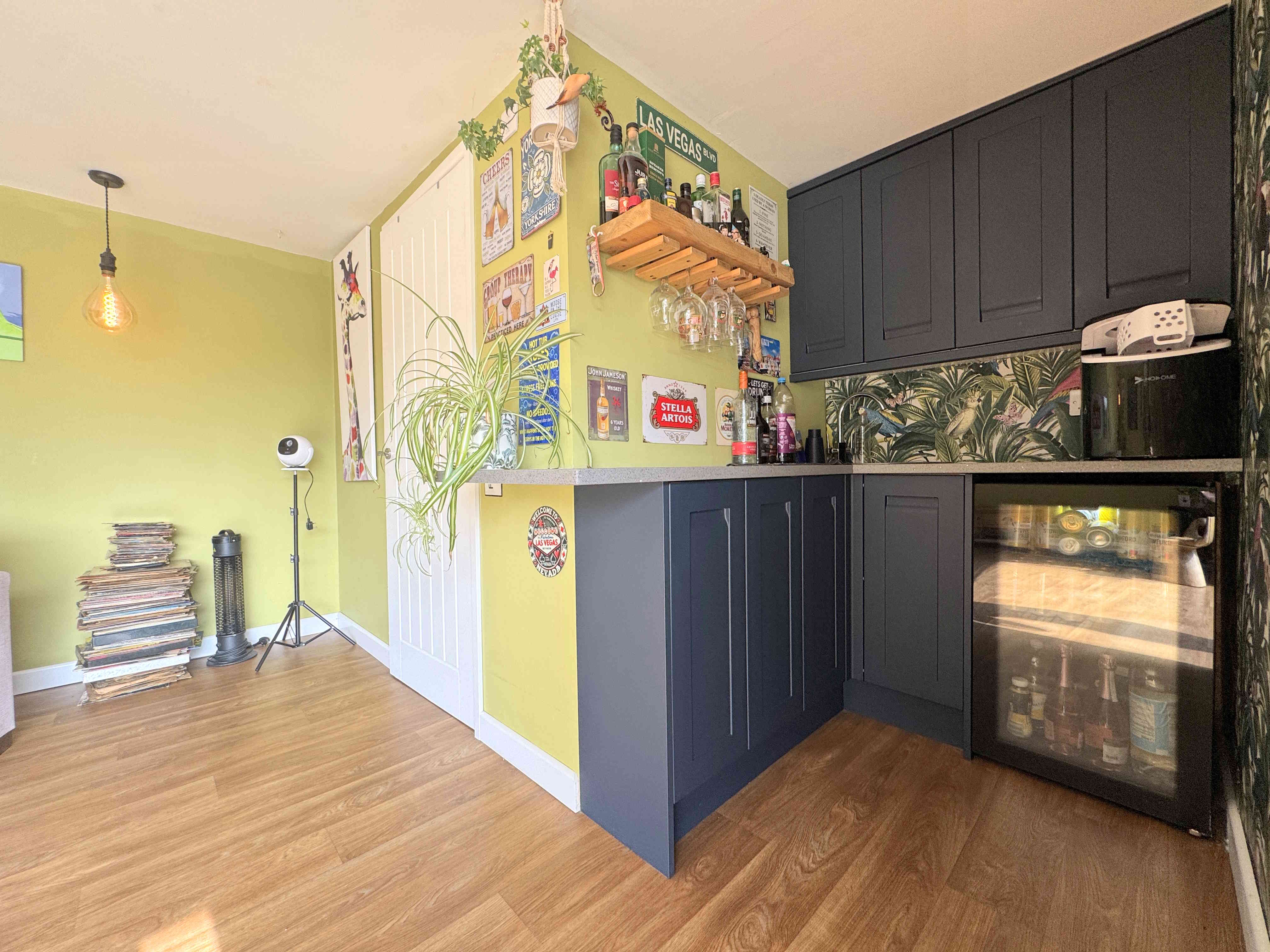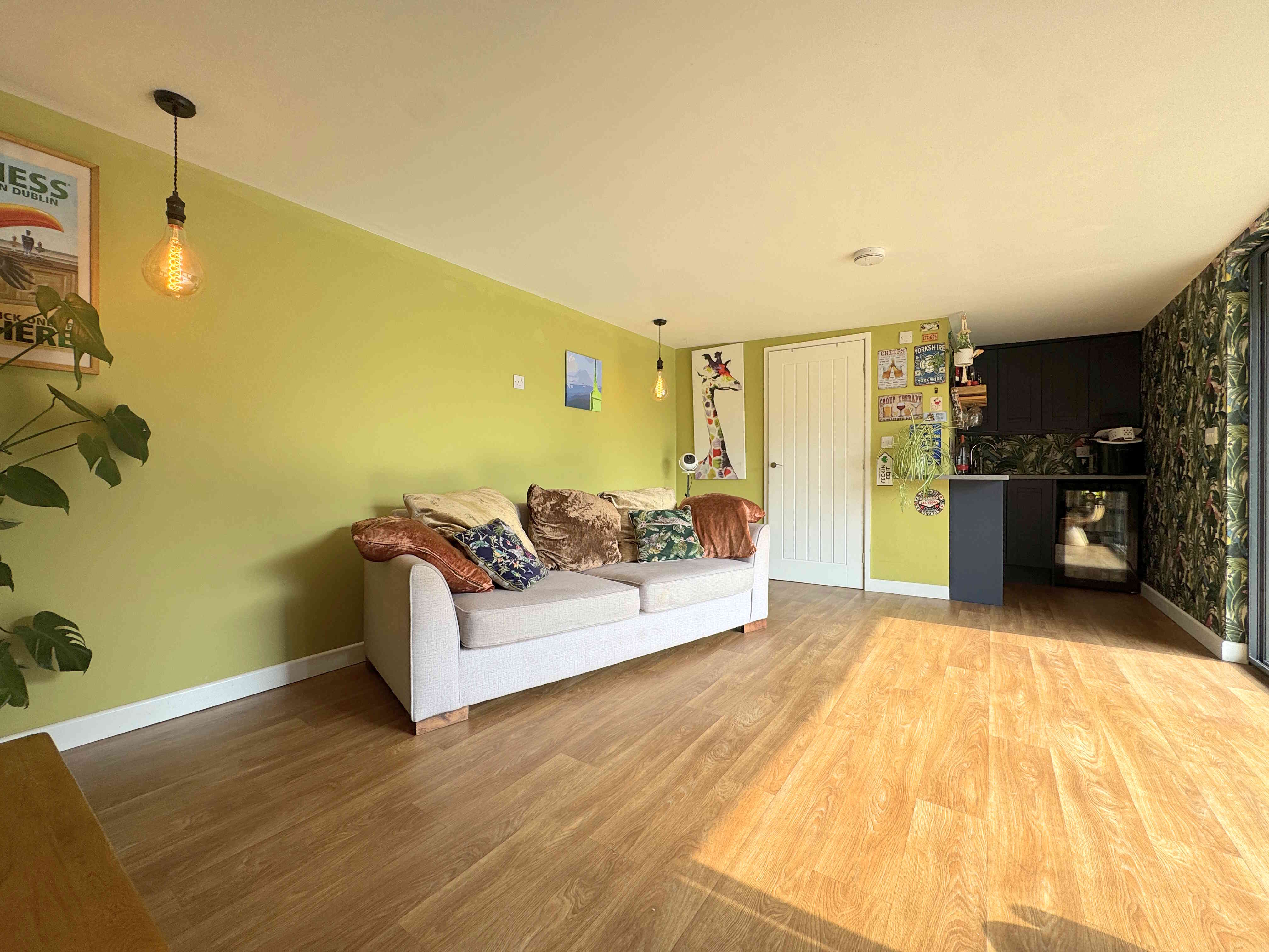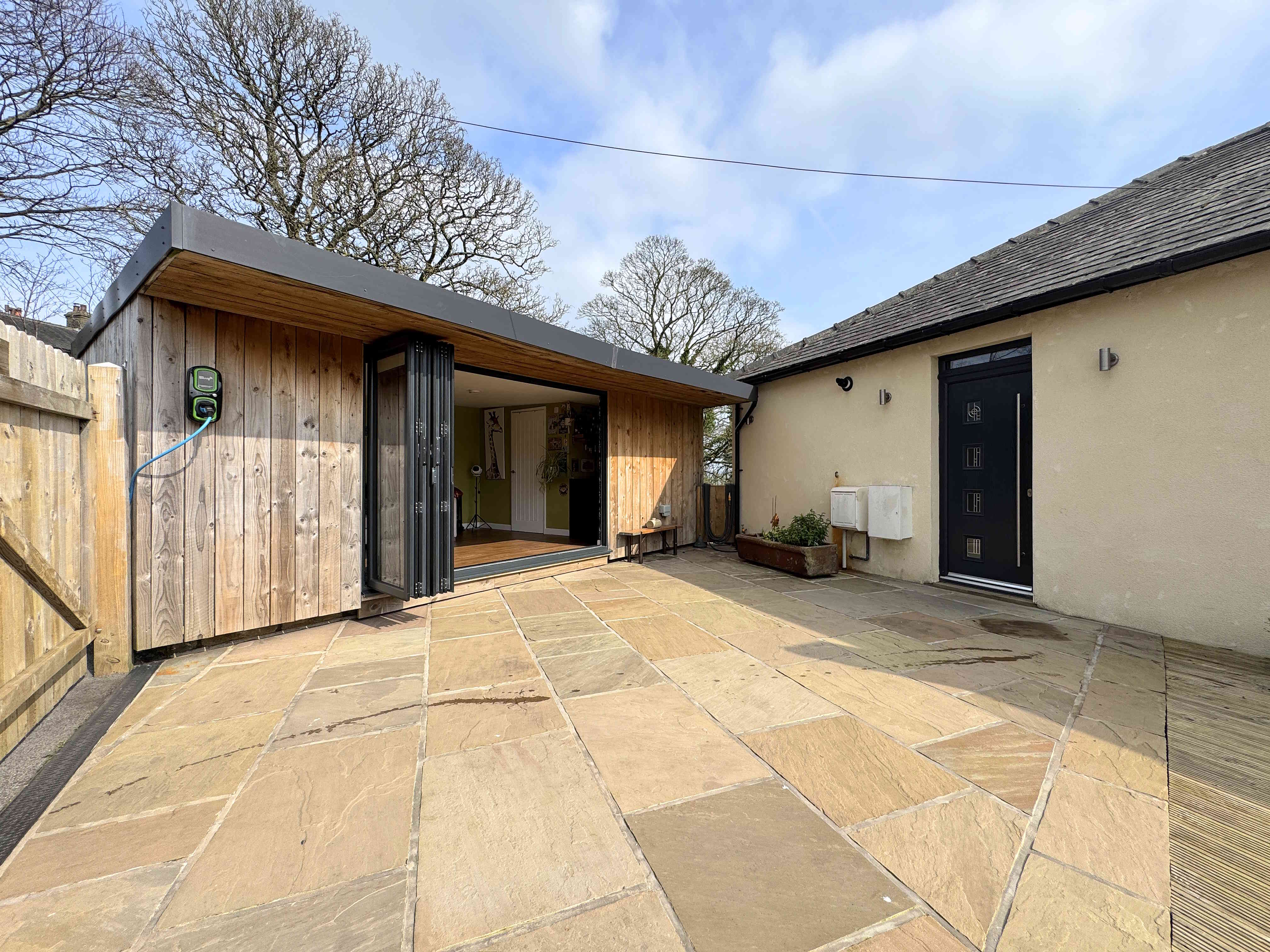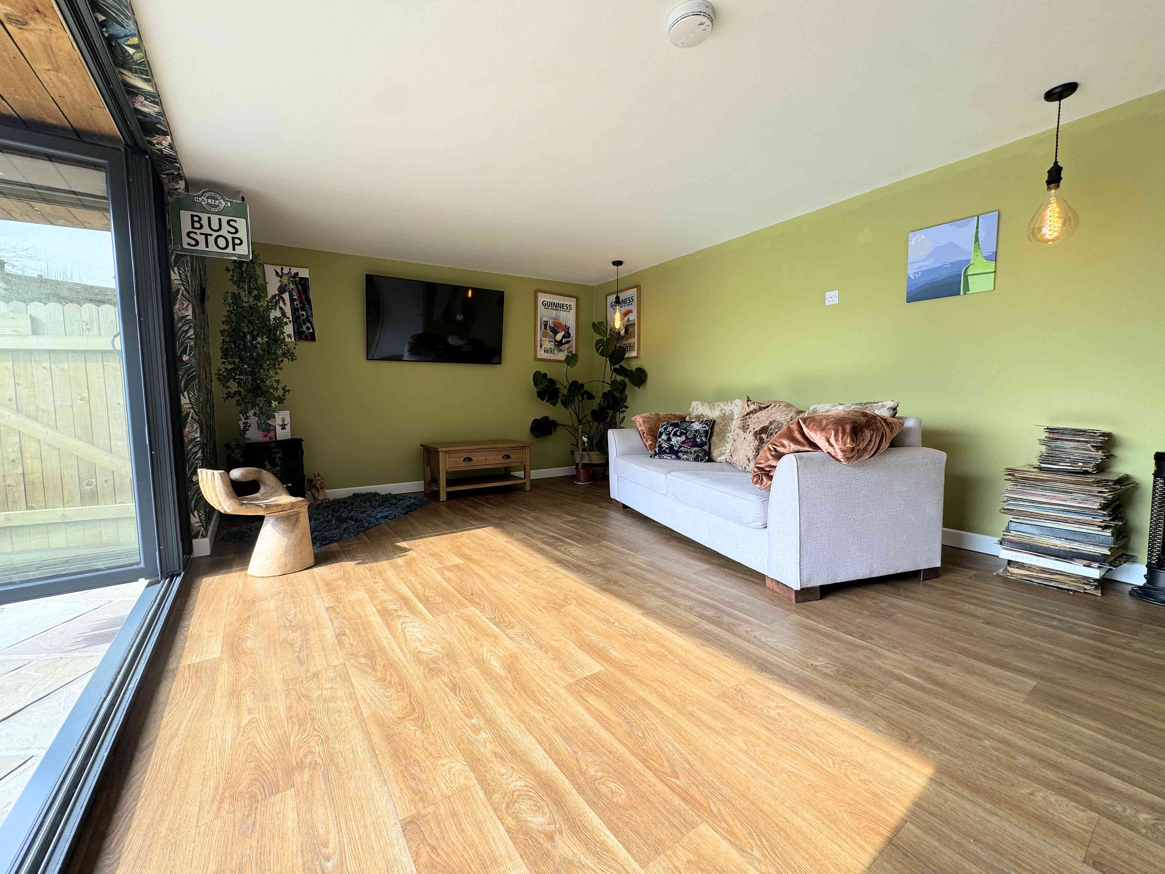 A superb, detached garden room, perfect as a studio, home office, or guest space. It features a kitchenette with wall and base units, sink with mixer tap, built-in fridge, bi-folding doors, and wood-effect laminate flooring, offering both comfort and versatility.