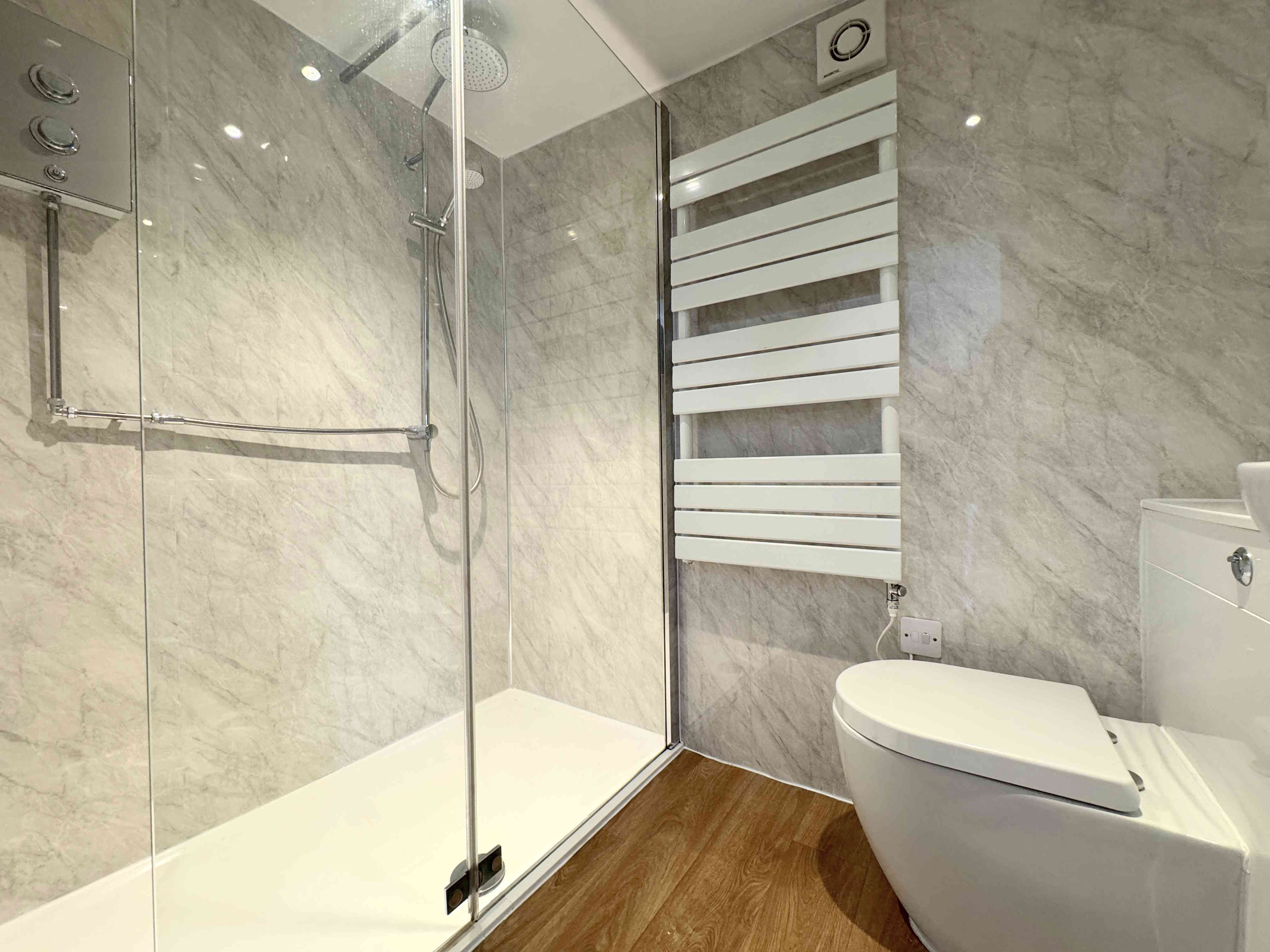 A modern shower room with a walk-in shower cubicle, rainfall and handheld shower, low flush toilet and vanity sink unit. Finished with wall cladding, wood-effect laminate flooring, ceiling spotlights, and an extractor fan, it provides a sleek and practical self-contained facility.