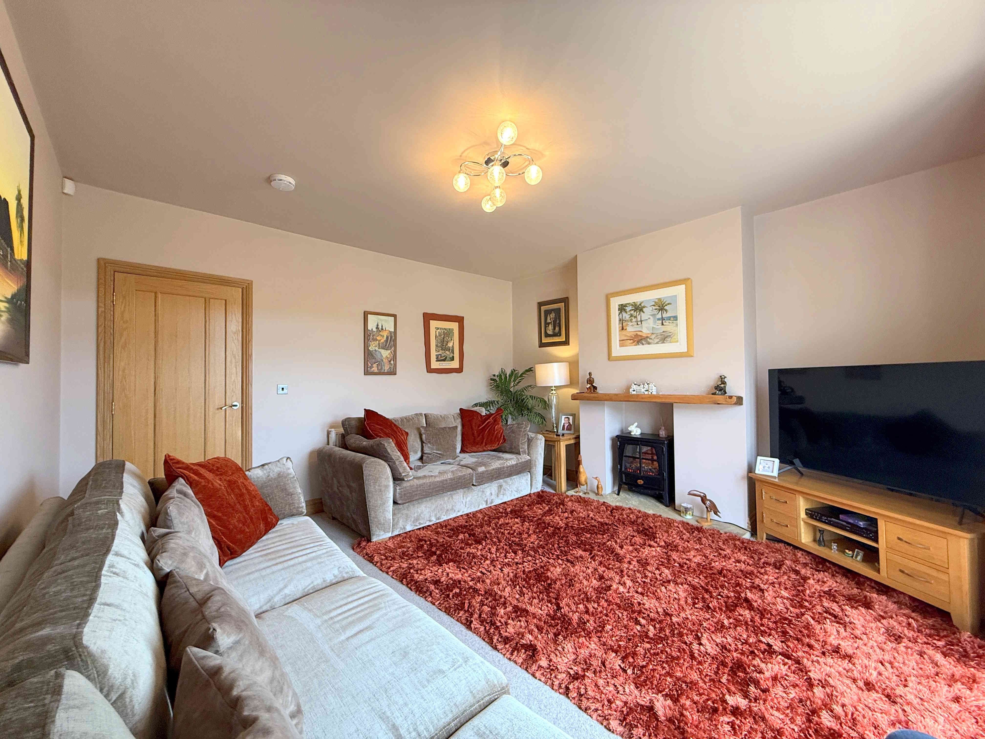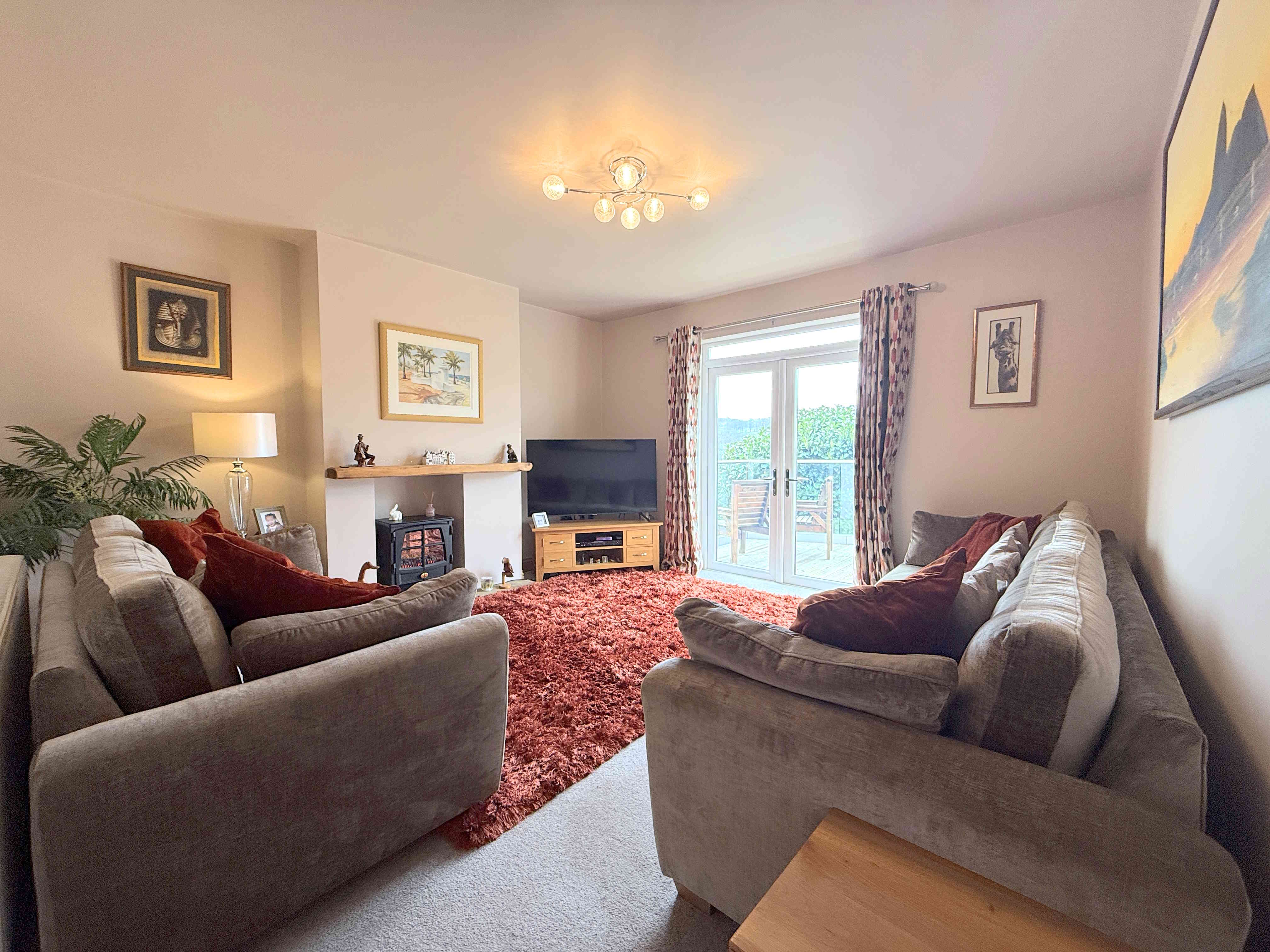 A bright and welcoming lounge featuring an electric fire set on a stone base with an oak mantle, creating a warm focal point to the room. UPVC patio doors open directly onto the decking, allowing natural light to flood the space and offering attractive hillside views. A radiator and well-presented décor complete this comfortable living area.