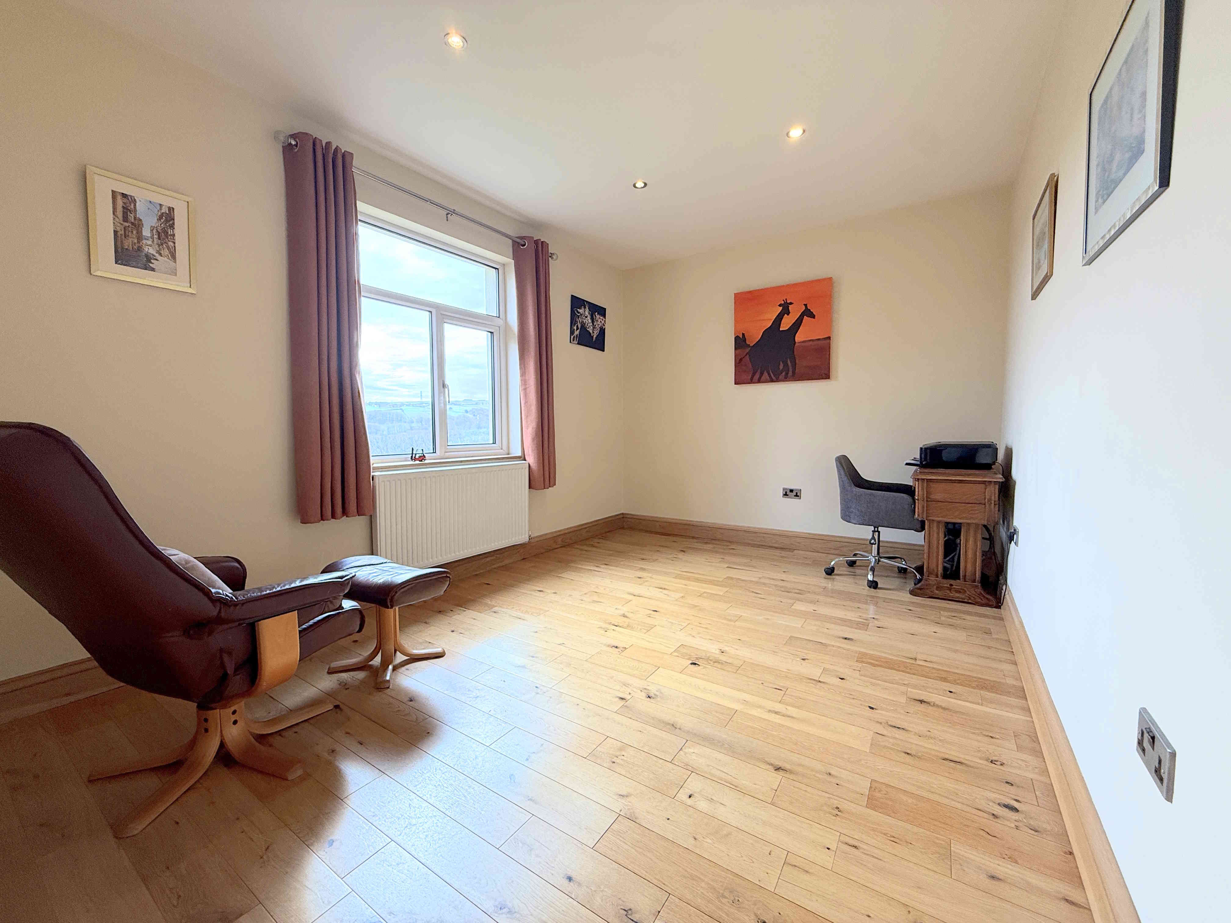 Currently used as a dining room, this flexible room could also serve perfectly as a second reception room and was formerly a bedroom, with potential to reinstate if this suits your requirements. Solid oak flooring continues seamlessly from the kitchen, accompanied by a radiator and a UPVC window capturing beautiful hillside views.