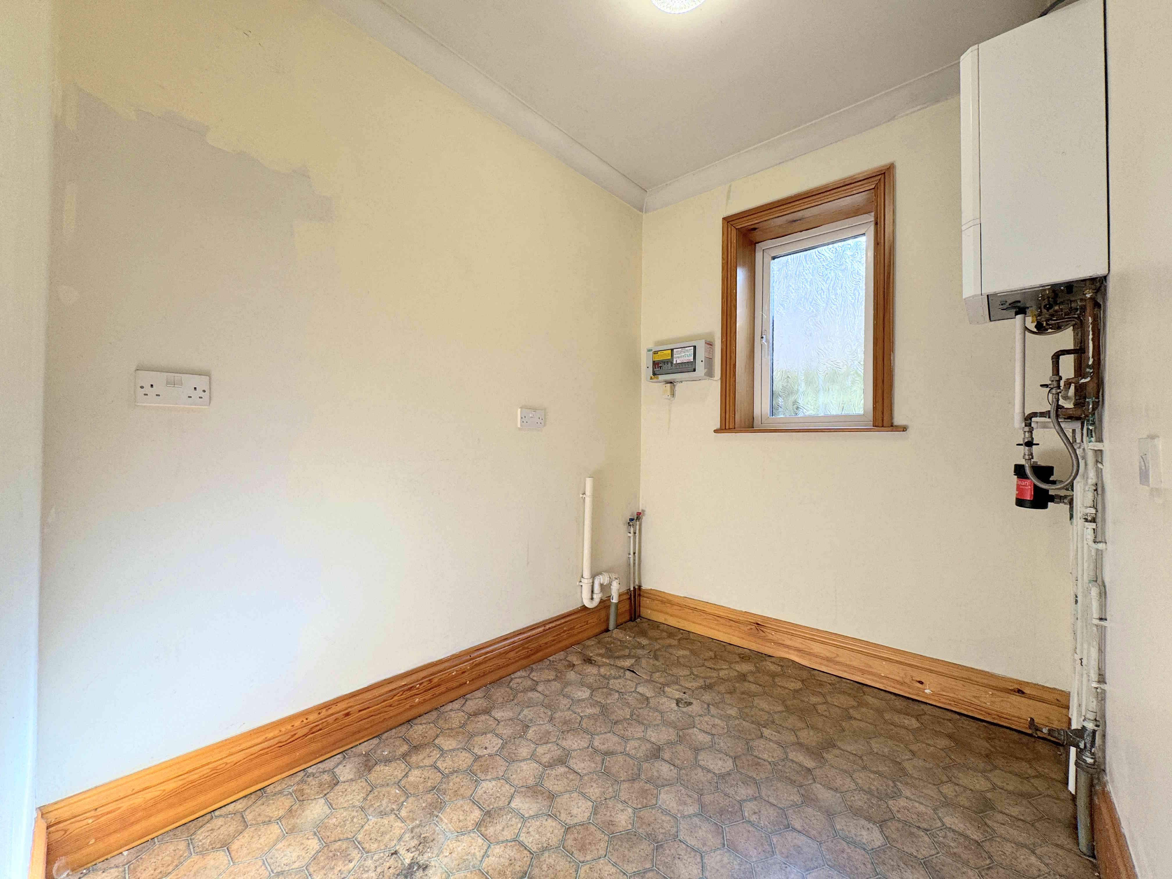 A useful utility room with plumbing for a washing machine, housing the combination boiler. Additional features include ceiling coving and a UPVC window.