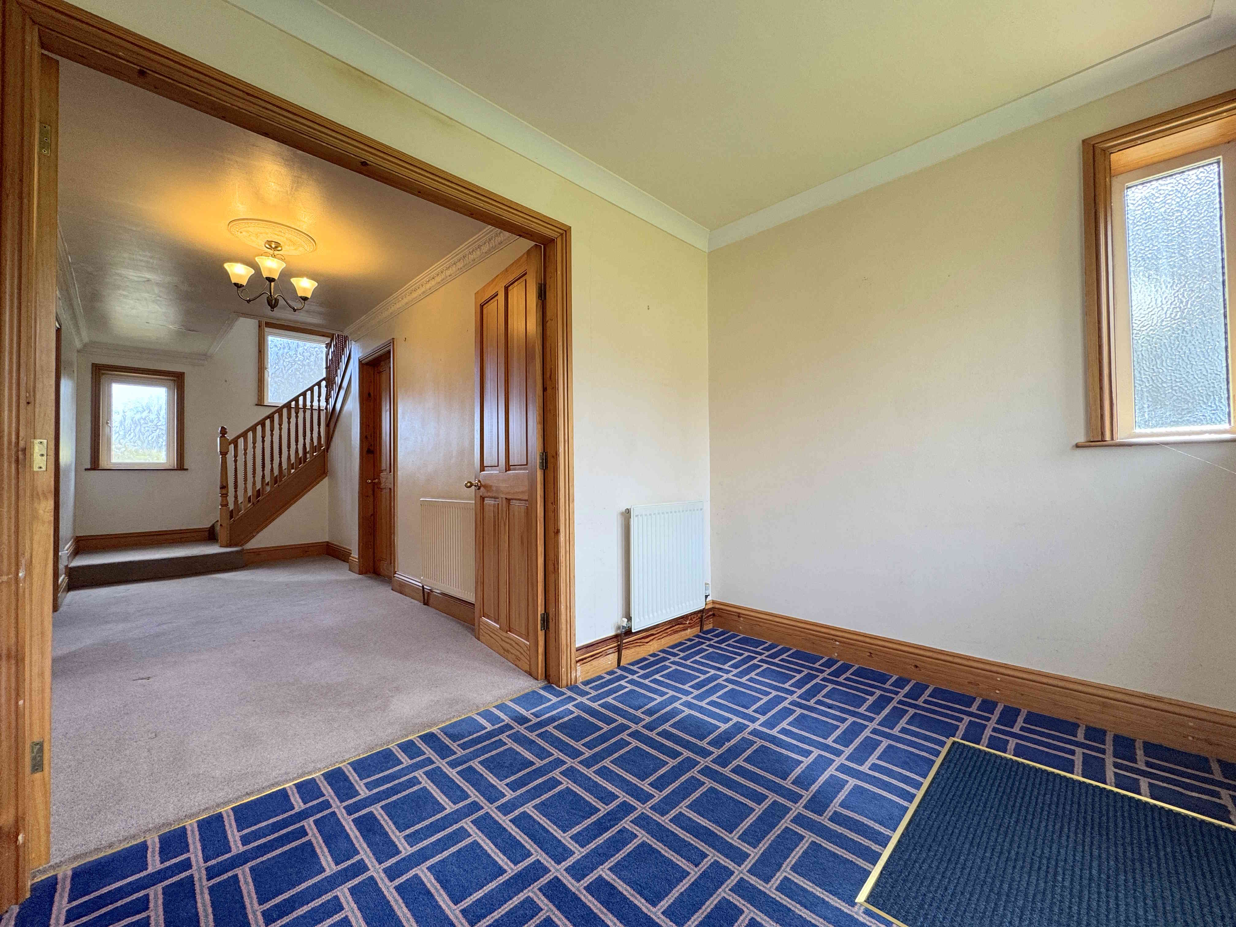 This main entrance features a front door with stained glass detailing, a radiator, decorative ceiling coving, French doors leading into the lobby, and UPVC windows allowing natural light to fill the space.