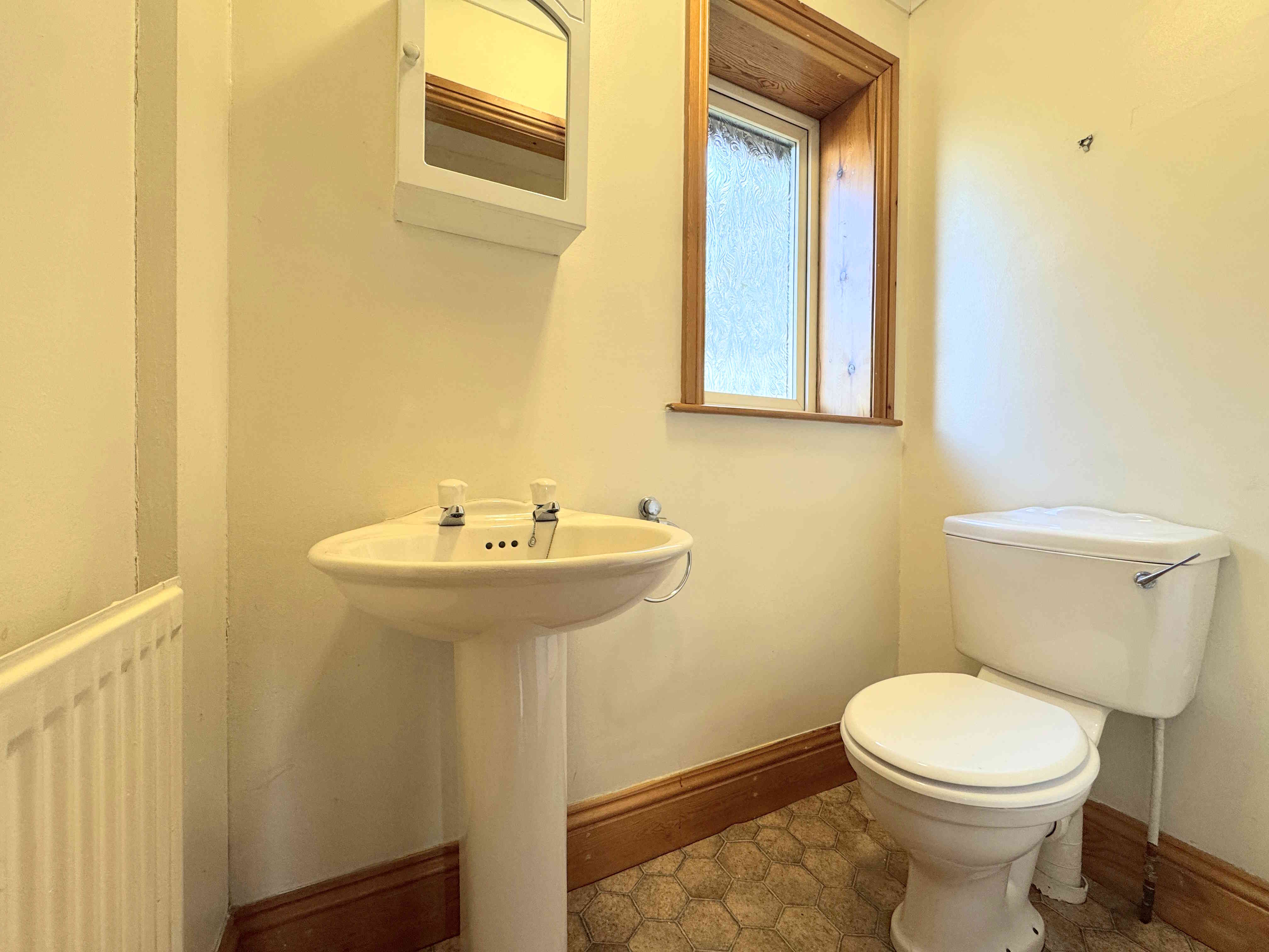 A cloakroom fitted with a low flush toilet and pedestal sink. Additional features include a radiator, ceiling coving, and a UPVC window.