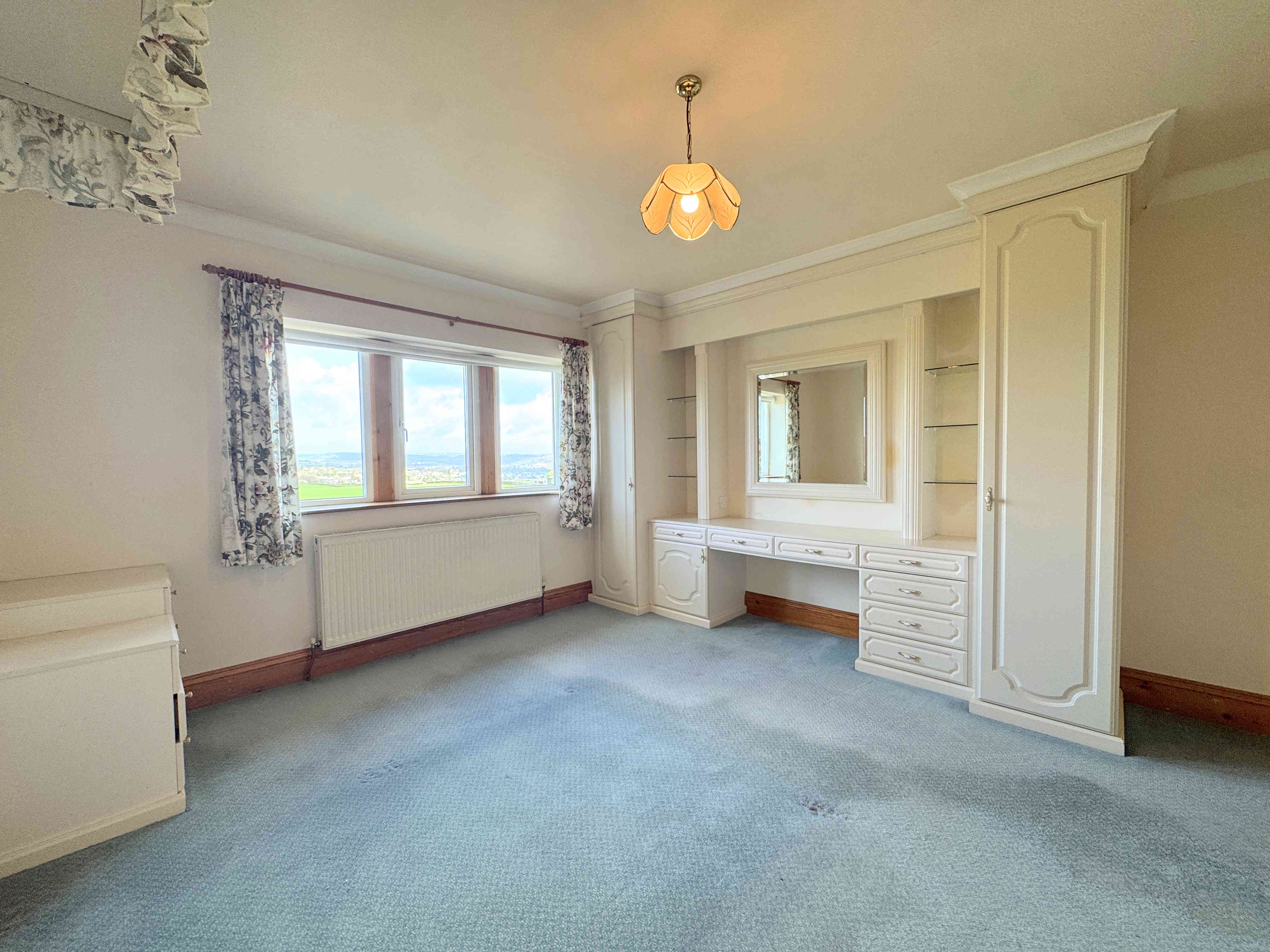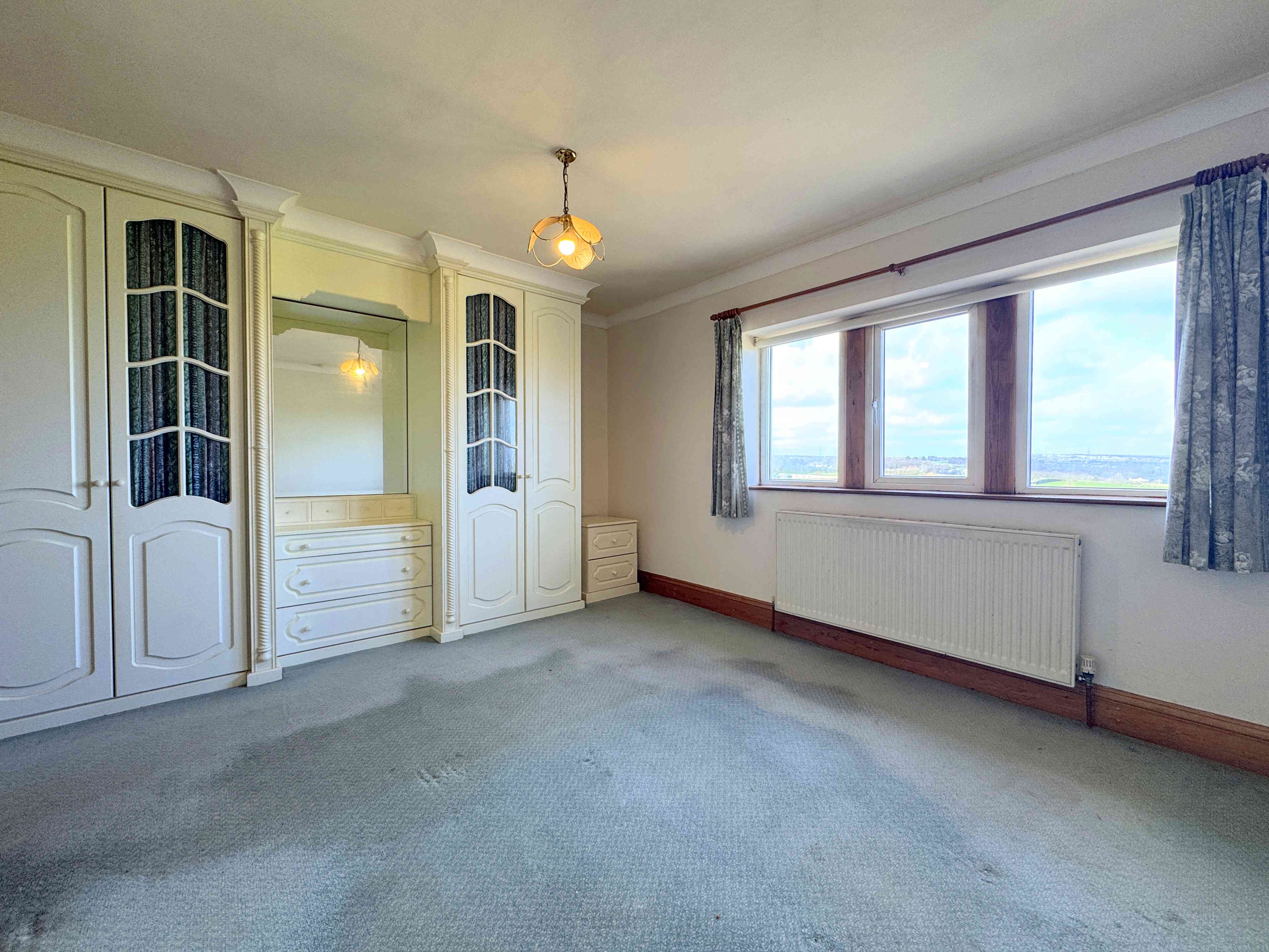 A large double bedroom with fitted bedroom furniture including bedside tables, wardrobes, drawers, and a dressing table. Additional features include a radiator, ceiling coving and UPVC windows with far-reaching views including Wainhouse Tower.