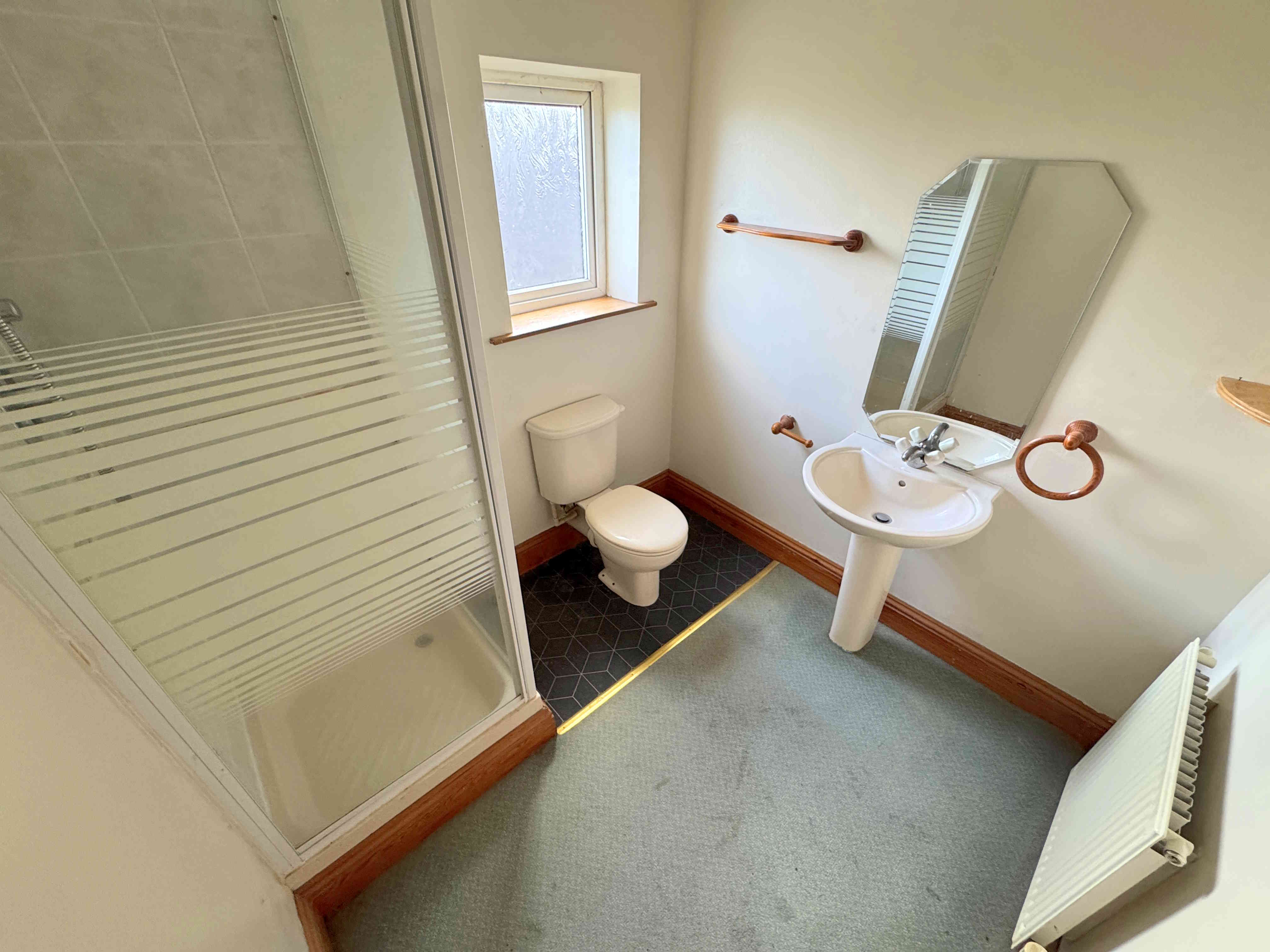 A three-piece en-suite comprising a tiled shower cubicle with handheld shower above, low flush toilet and pedestal sink. Additional features include a radiator, ceiling coving, extractor fan, and a UPVC window.