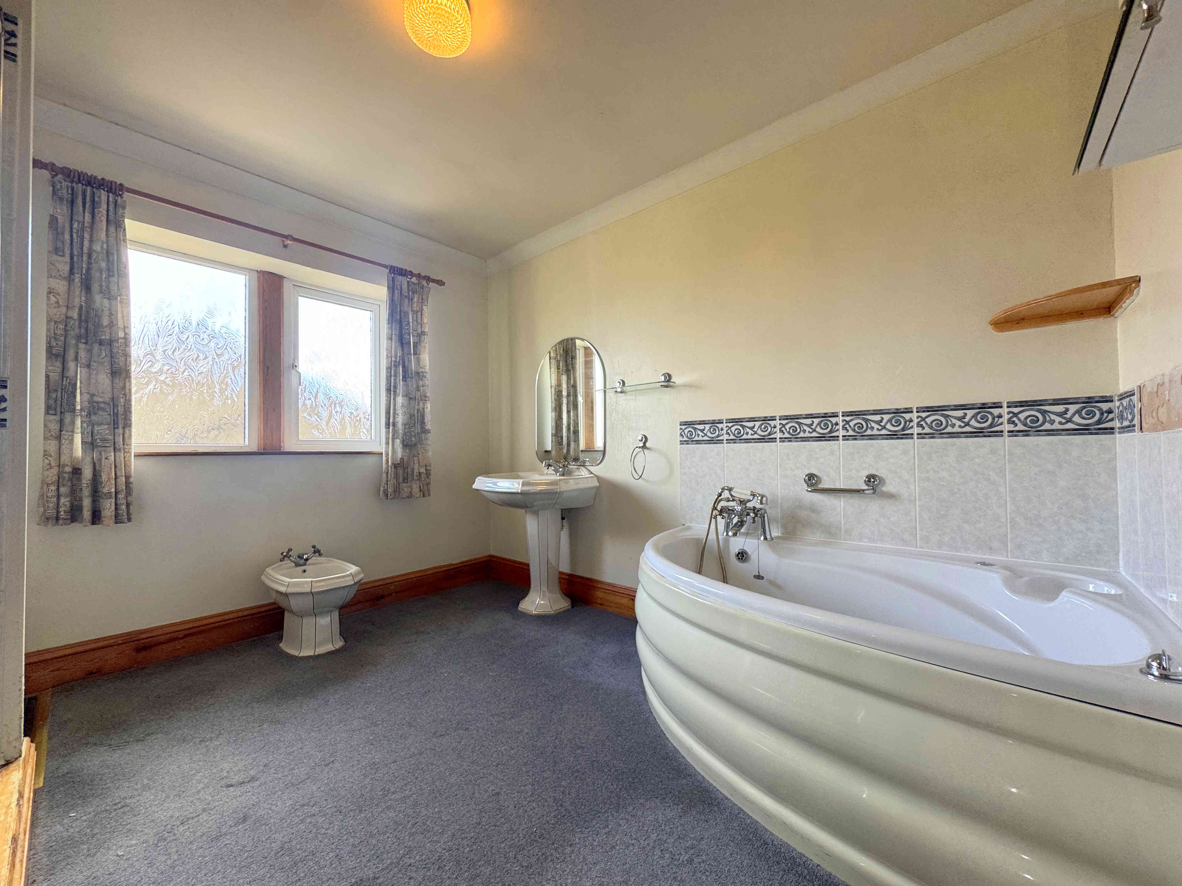 A spacious five-piece bathroom suite comprising a corner bathtub with splashback tiling, a large walk-in tiled shower cubicle with handheld shower, a low flush toilet, a large pedestal sink and a bidet. Additional features include ceiling coving, a radiator, extractor fan, and a UPVC window.