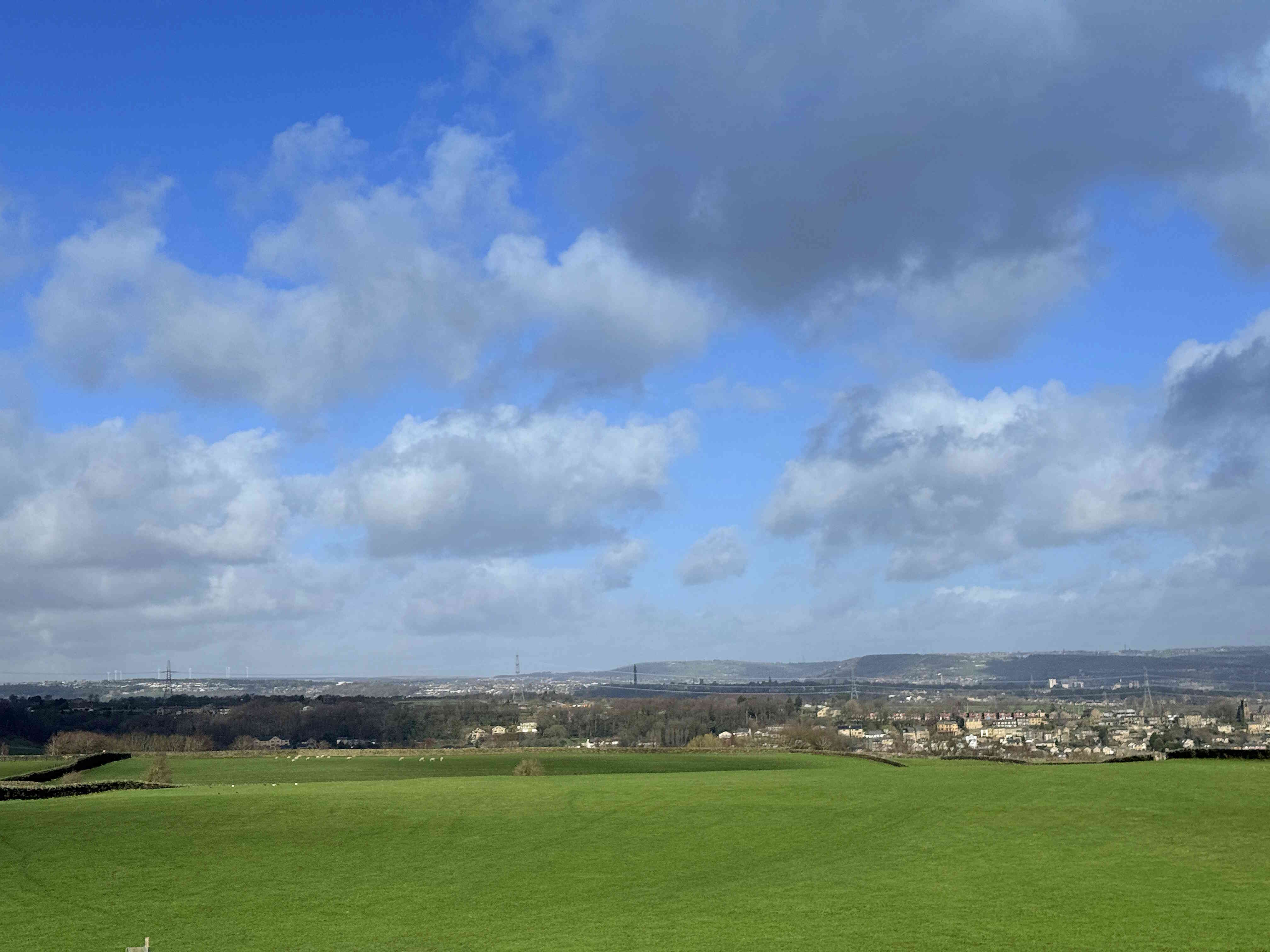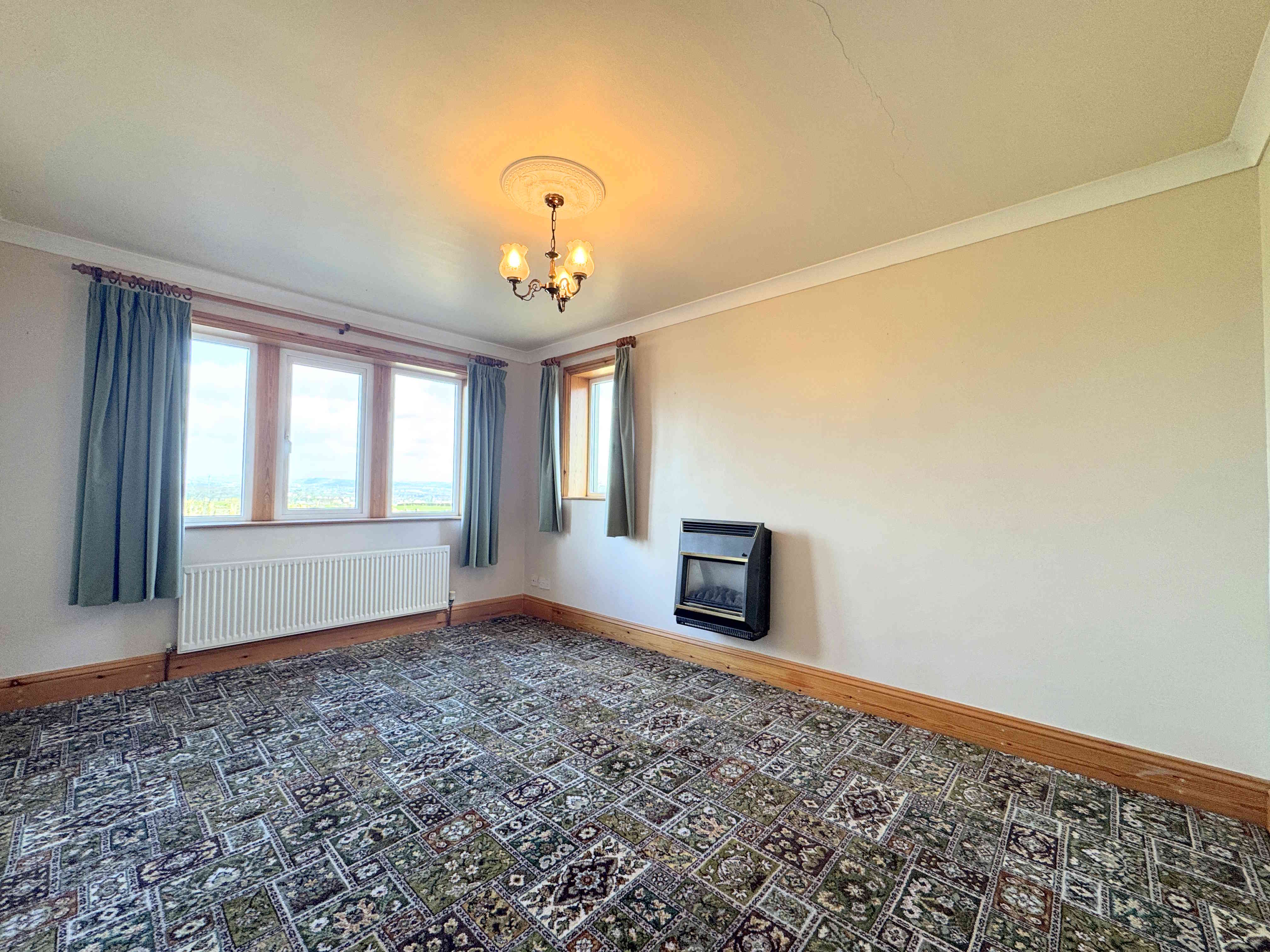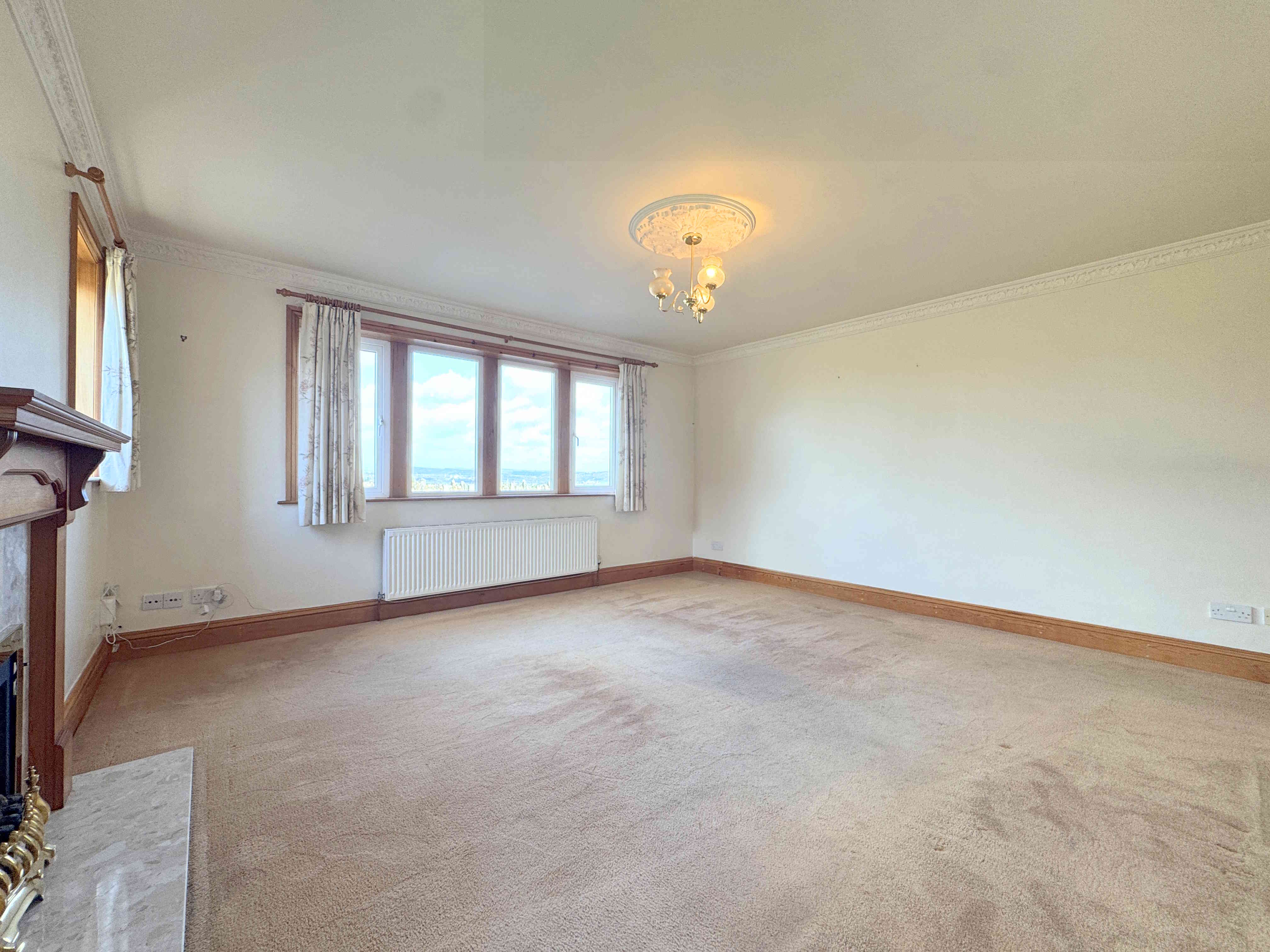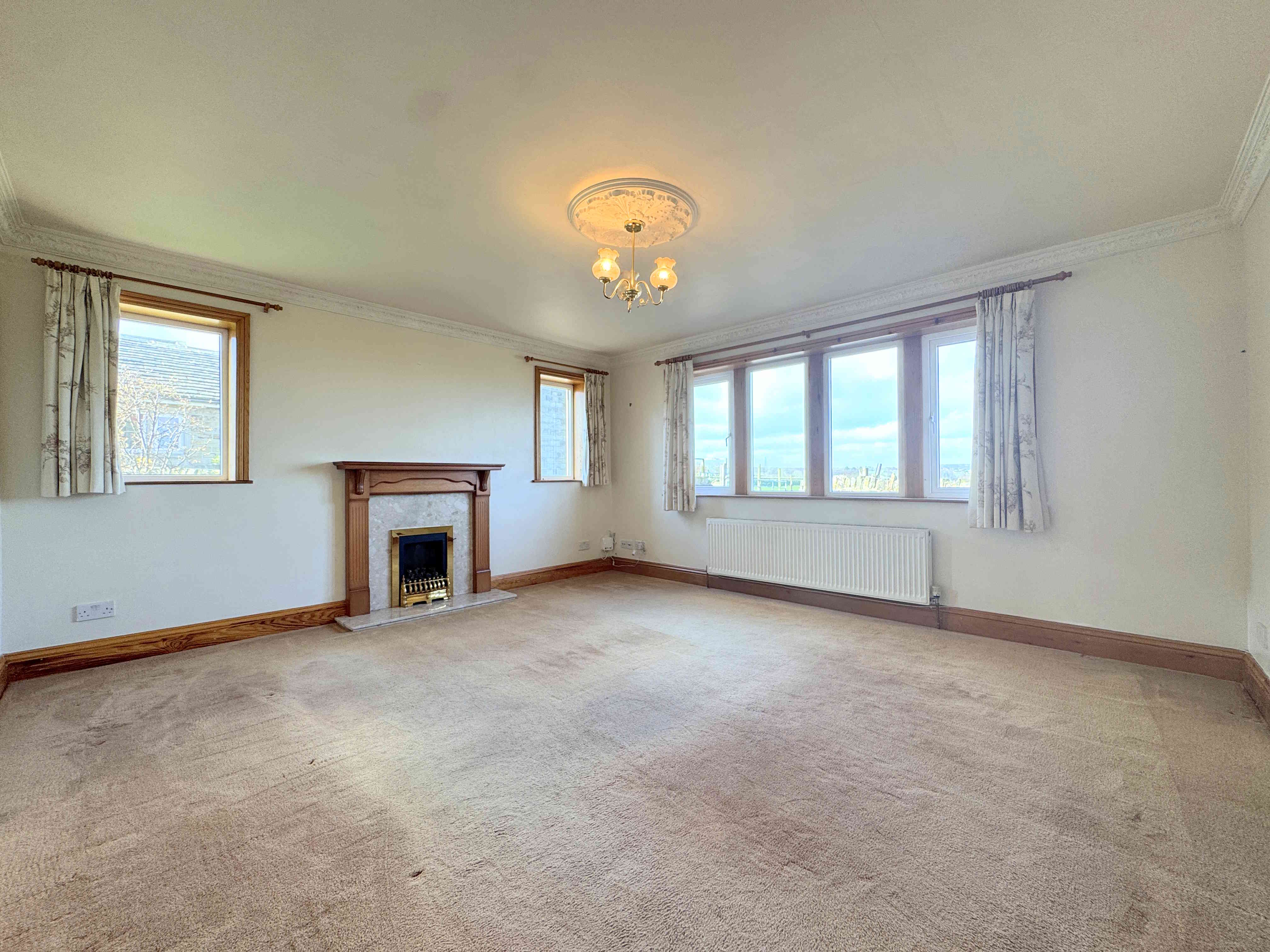A spacious lounge featuring a gas fire creating a focal point to the room, decorative ceiling coving, a radiator, and UPVC windows offering far-reaching views including Wainhouse Tower.