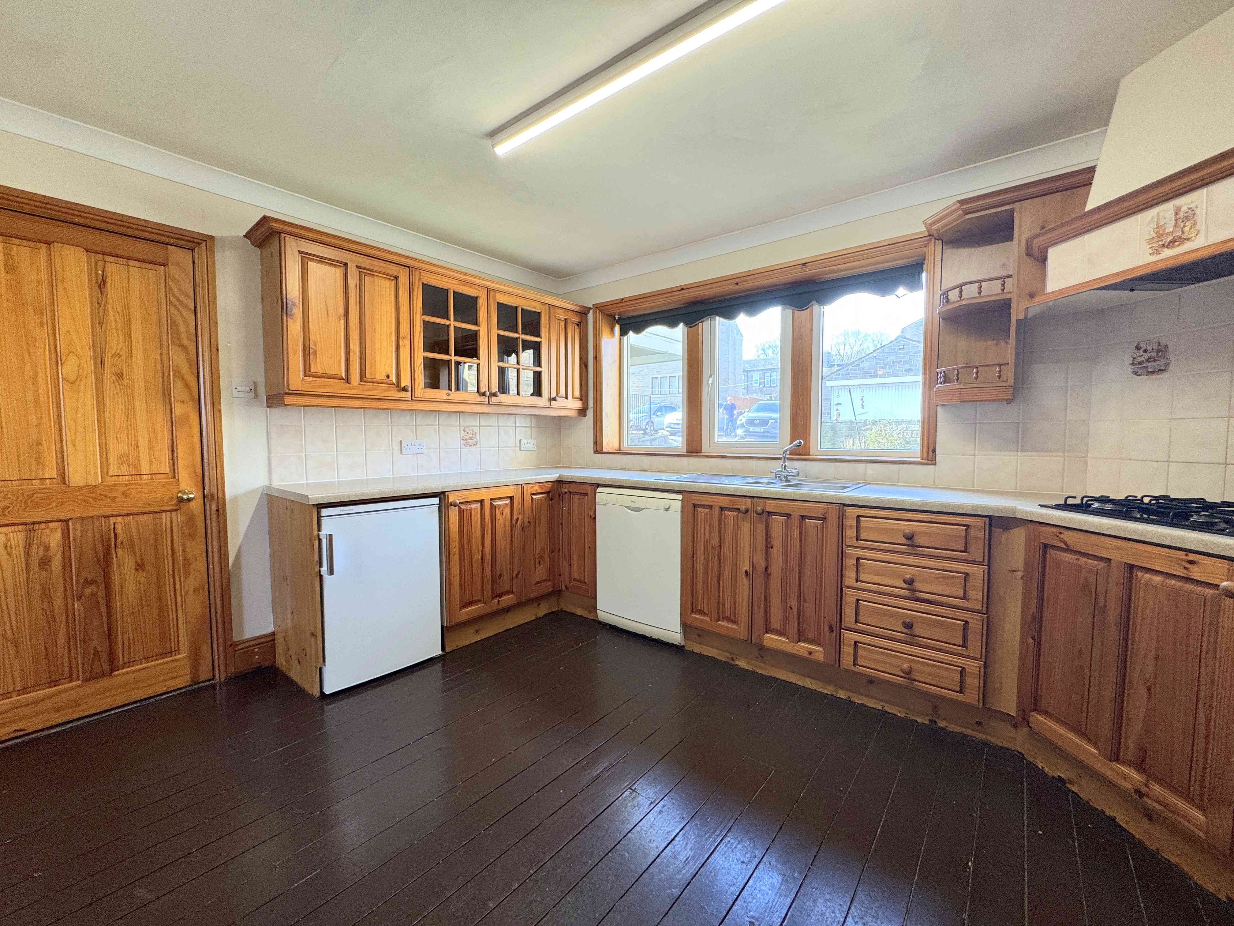 A dining kitchen fitted with wall and base units including a one and a half bowl sink with chrome mixer tap and splashback tiles. Appliances include a built-in double oven, hob, and extractor fan, along with space and plumbing for a dishwasher and fridge. Additional features include a large under-stair storage cupboard, wooden flooring, a radiator, ceiling coving, and UPVC windows.