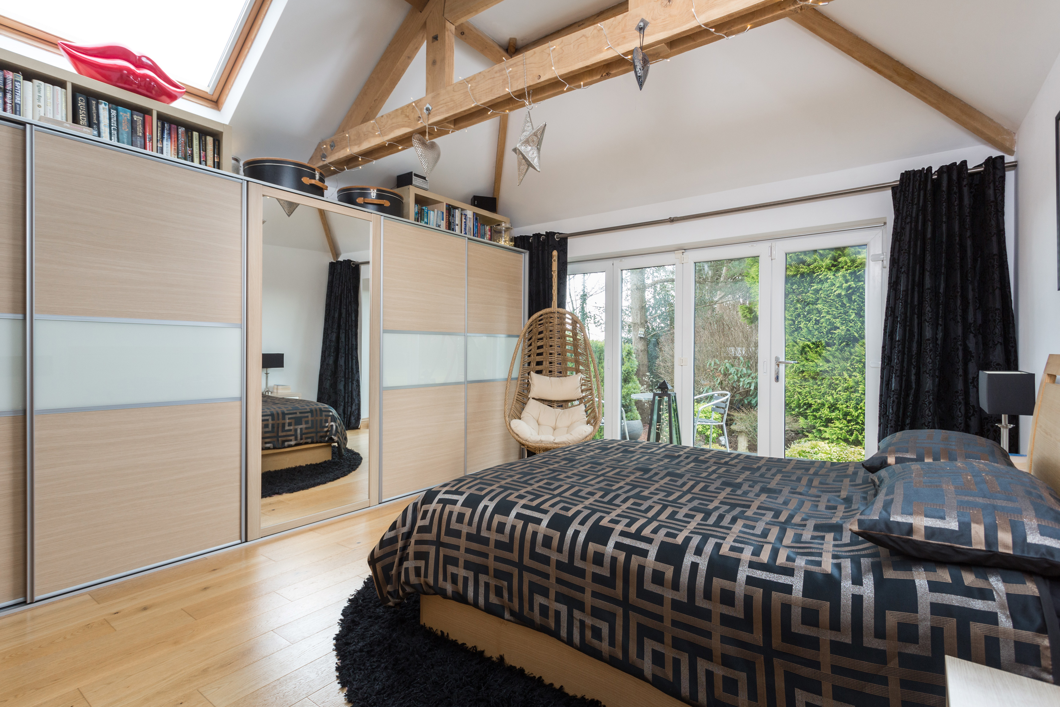 Currently used as an office space with an engineered oak floor and exposed ceiling beams. Aluminium patio doors open out to a balcony which overlooks the rear gardens and beyond with far reaching views.