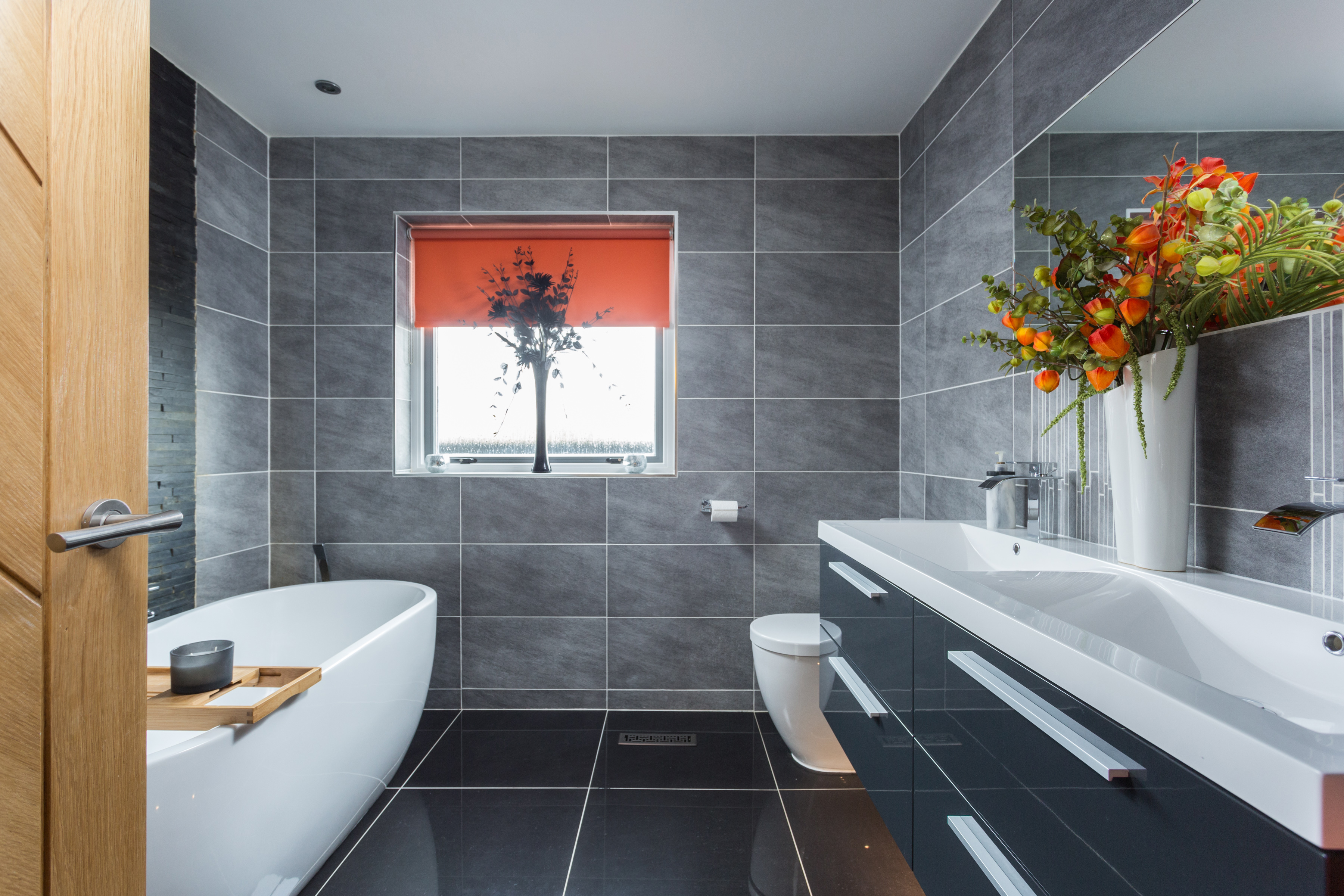 Tasteful wall and floor tiles compliment this modern and stylish bathroom suite that comprises of a freestanding double ended bathtub with a chrome waterfall mixer tap, a low flush toilet and a floating twin, vanity sink unit with matching waterfall mixer taps. To complete this room to a high spec are the ceiling spotlights, a chrome towel radiator, a large wall mirror and a double glazed window.