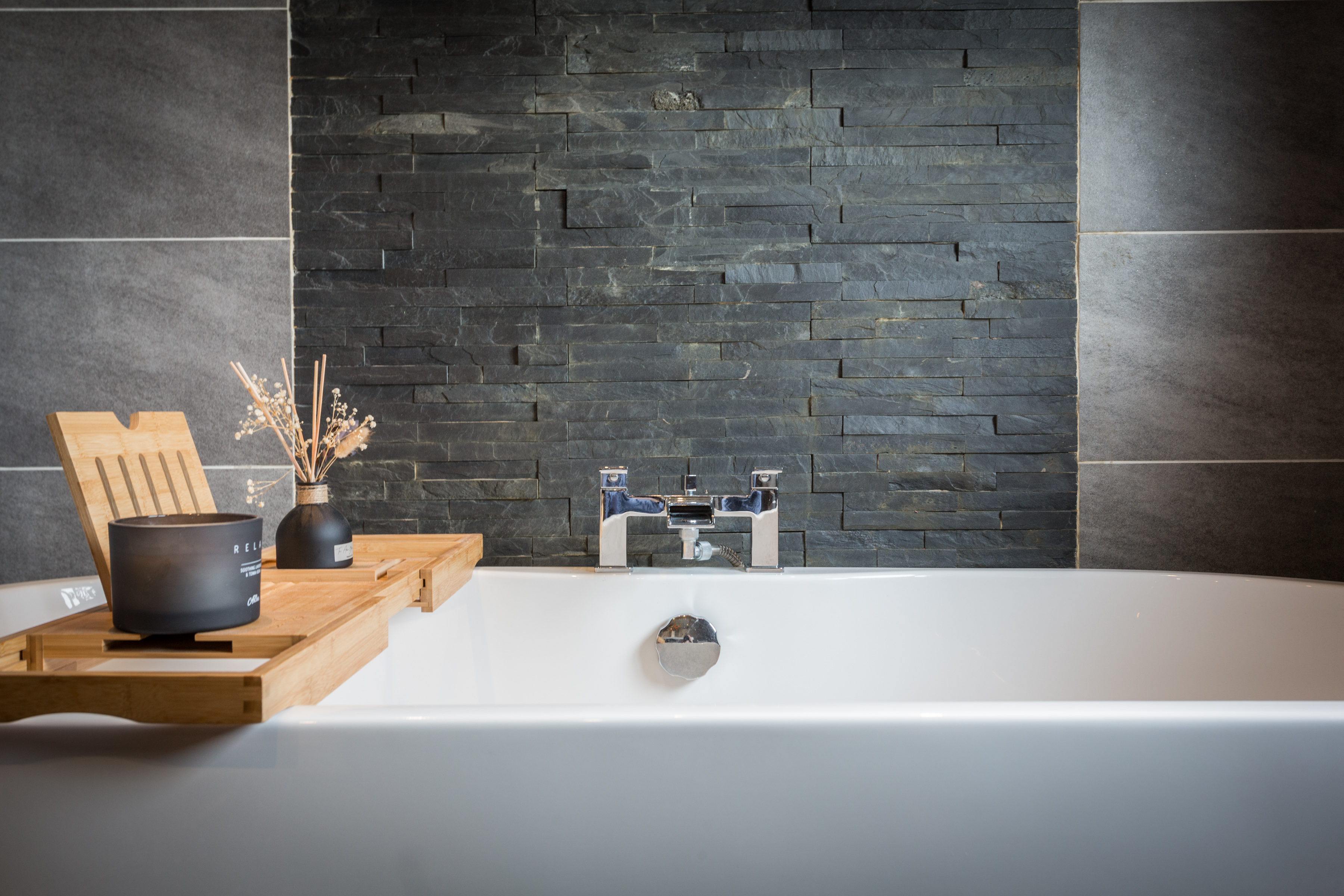 A range of modern wall and base units provide even more storage space to add to that of the main kitchen. A large Stoves cooker and a Baumatic fridge/freezer are included in the sale of the property. Completing this kitchen is a stainless steel sink with tasteful splash back tiles, space and plumbing for a washing machine, slate effect laminate flooring and an anthracite, aluminium double glazed window which overlooks the beautiful gardens.