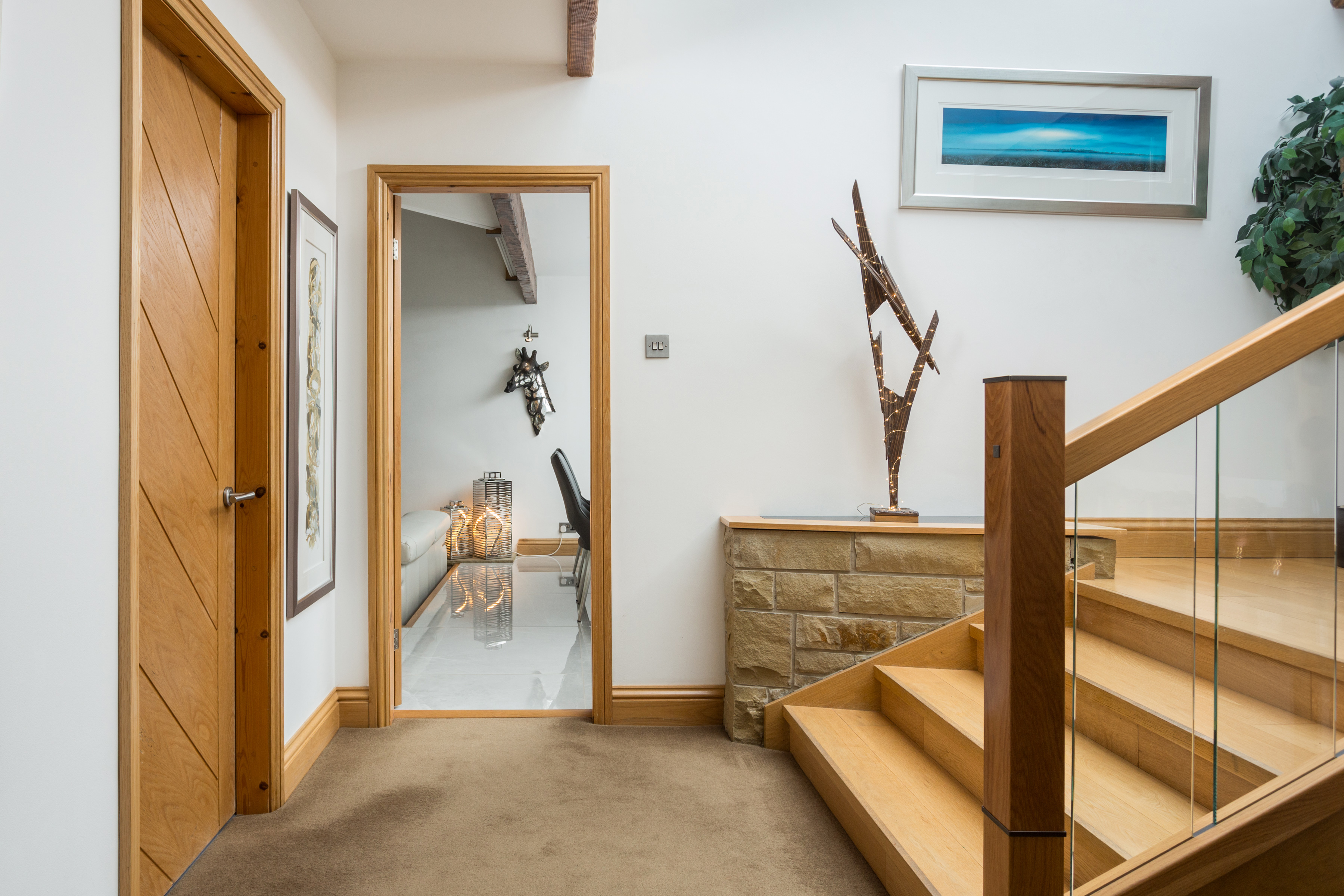 Overlooking the entrance hall with an oak and toughened glass balustrade.