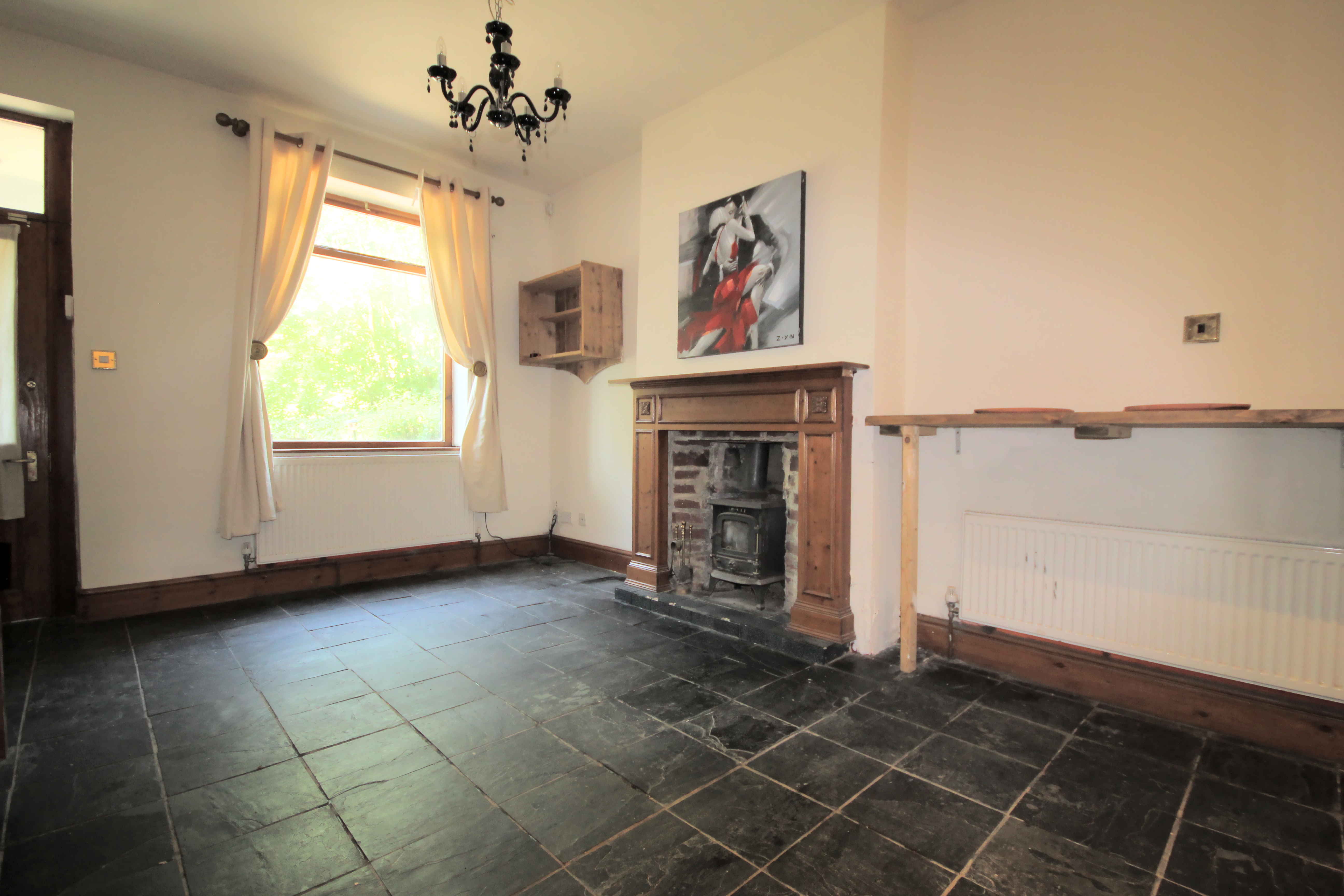 Centre stage is the multi-fuel stove which sits neatly within a redbrick fireplace with a wooden fire surround. The slate tiled floor continues from the entrance porch and through to the kitchen area. Open staircase, two radiators and a UPVC window.