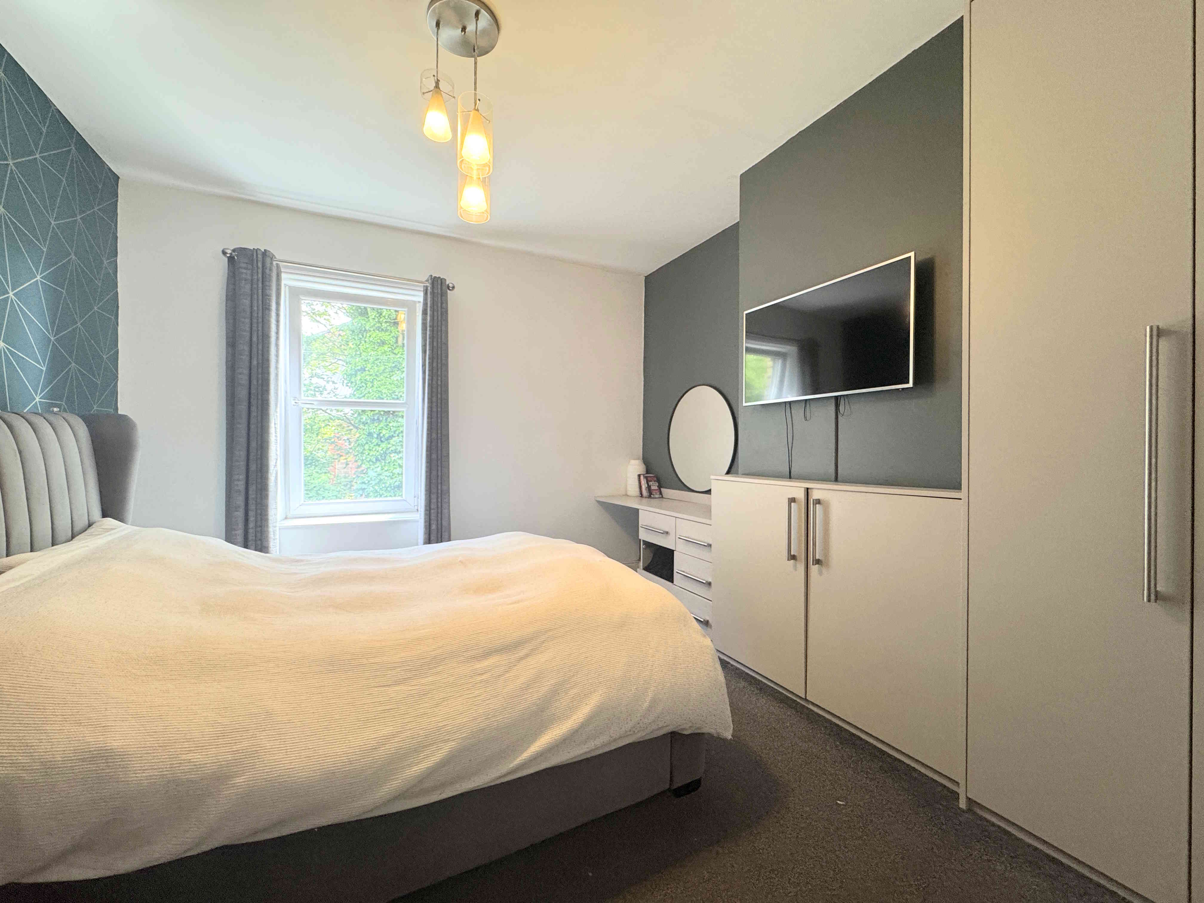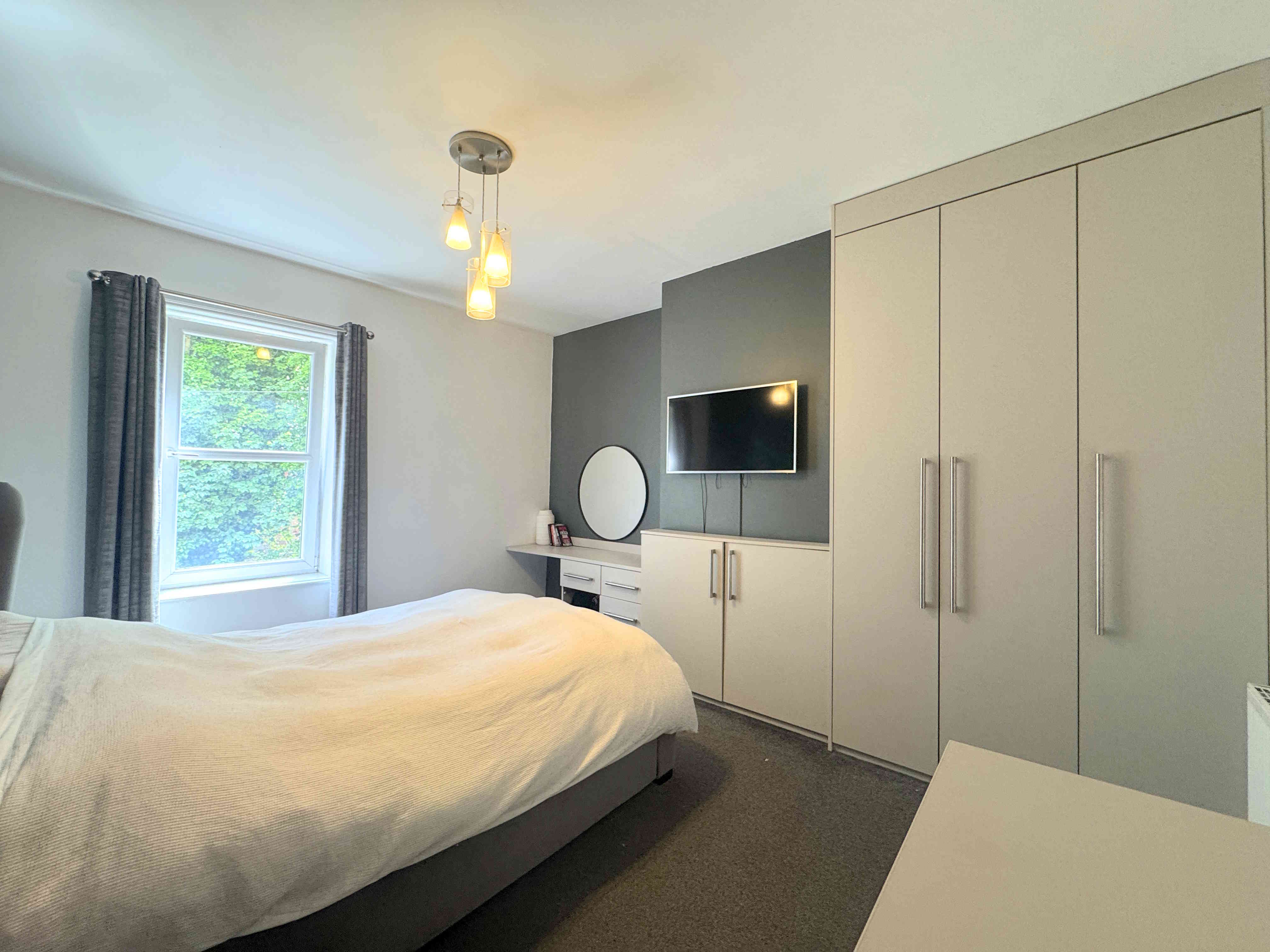 A generously sized double bedroom featuring fitted wardrobes, a built-in desk with drawers, a radiator, and a large UPVC window.