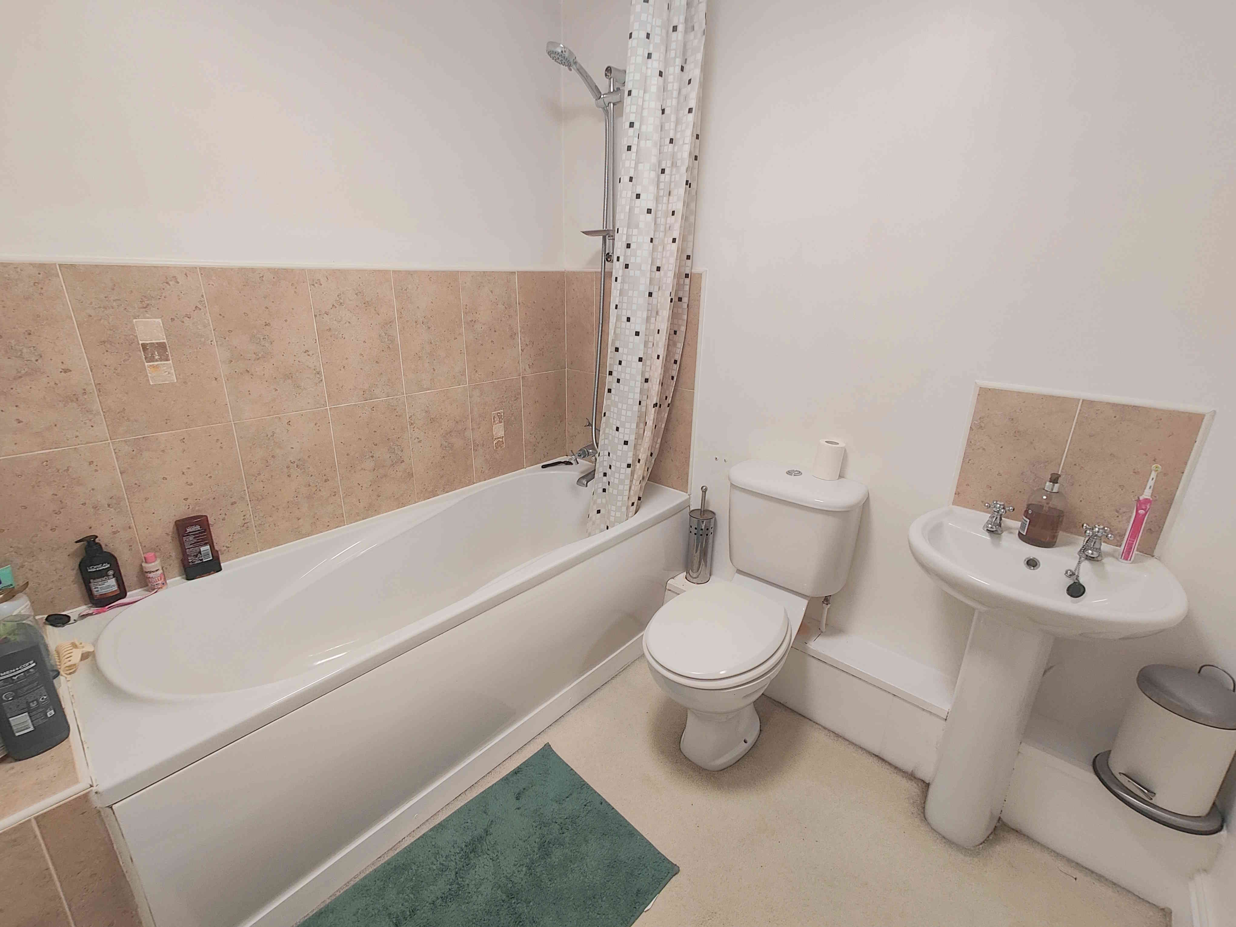 A neatly presented and laid out house bathroom with a panel bath, over bath shower, pedestal washbasin, close coupled toilet, carpeted floor, tiled splashbacks, single radiator, central light fitting and extractor fan.