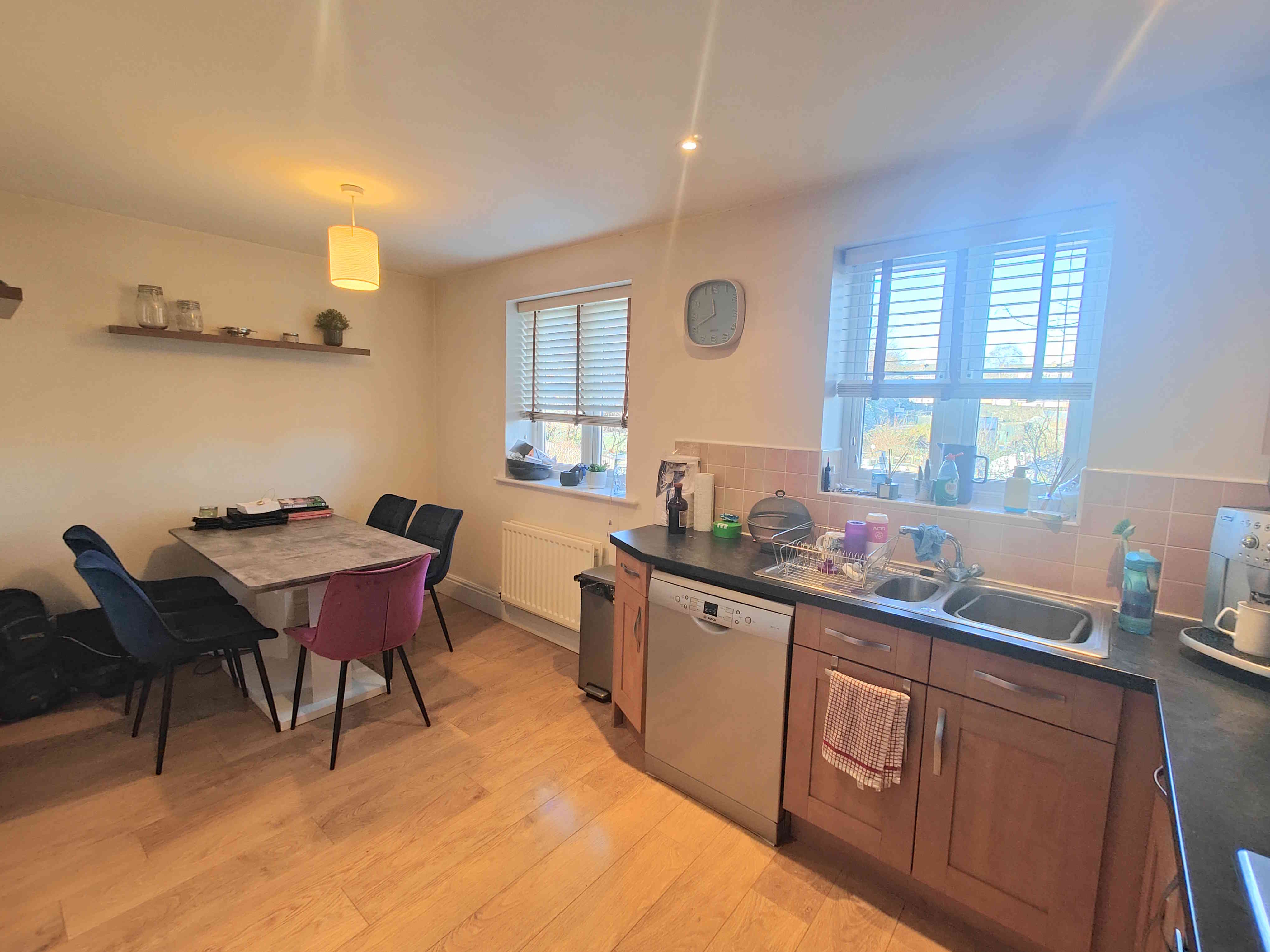 A charming and well-presented reception to the property, the hallway is light and bright and in a neutral colour scheme. With a wood laminate floor, two omni-directional light fittings, single radiator, alarm control panel and a storage cupboard.