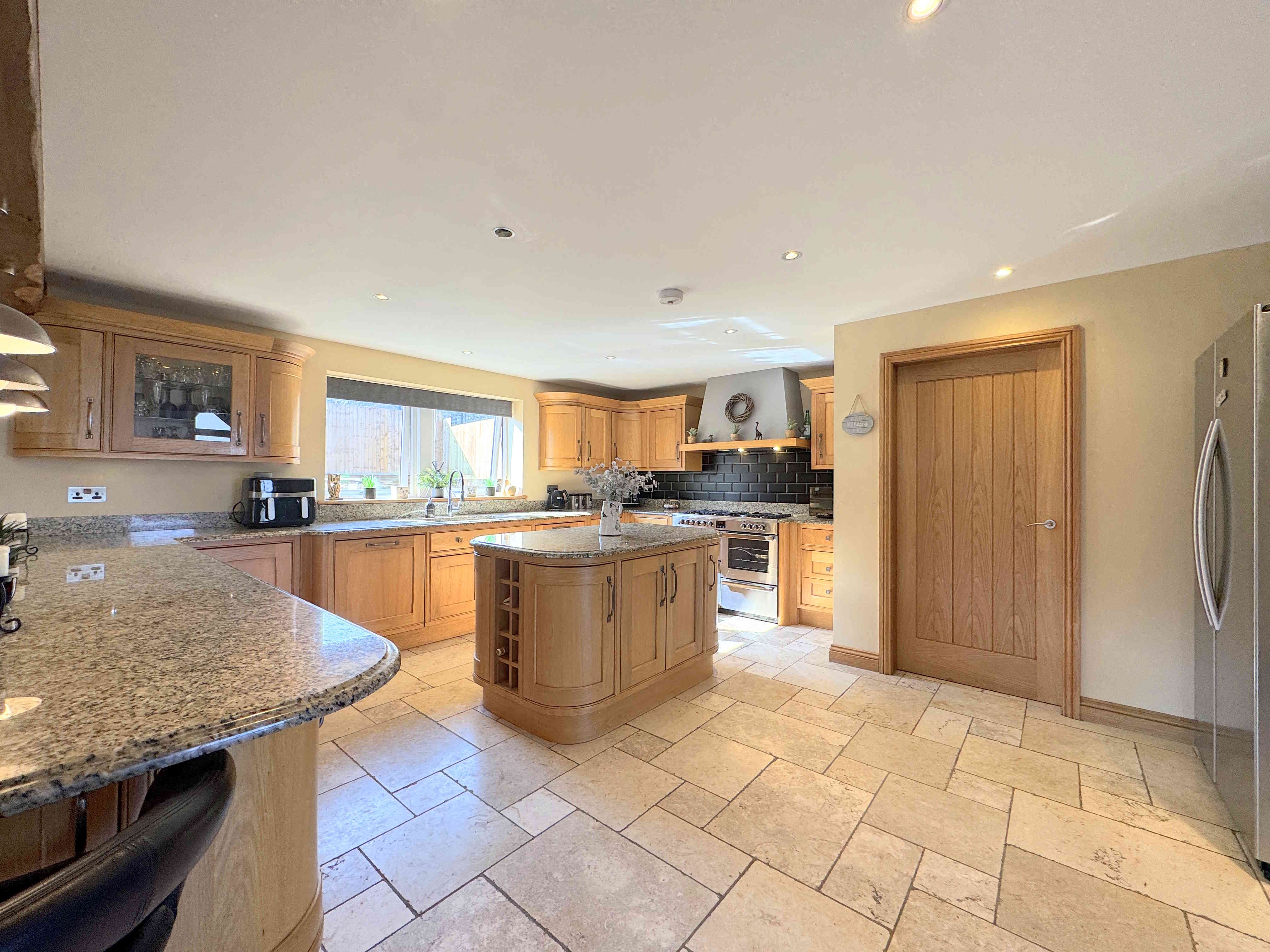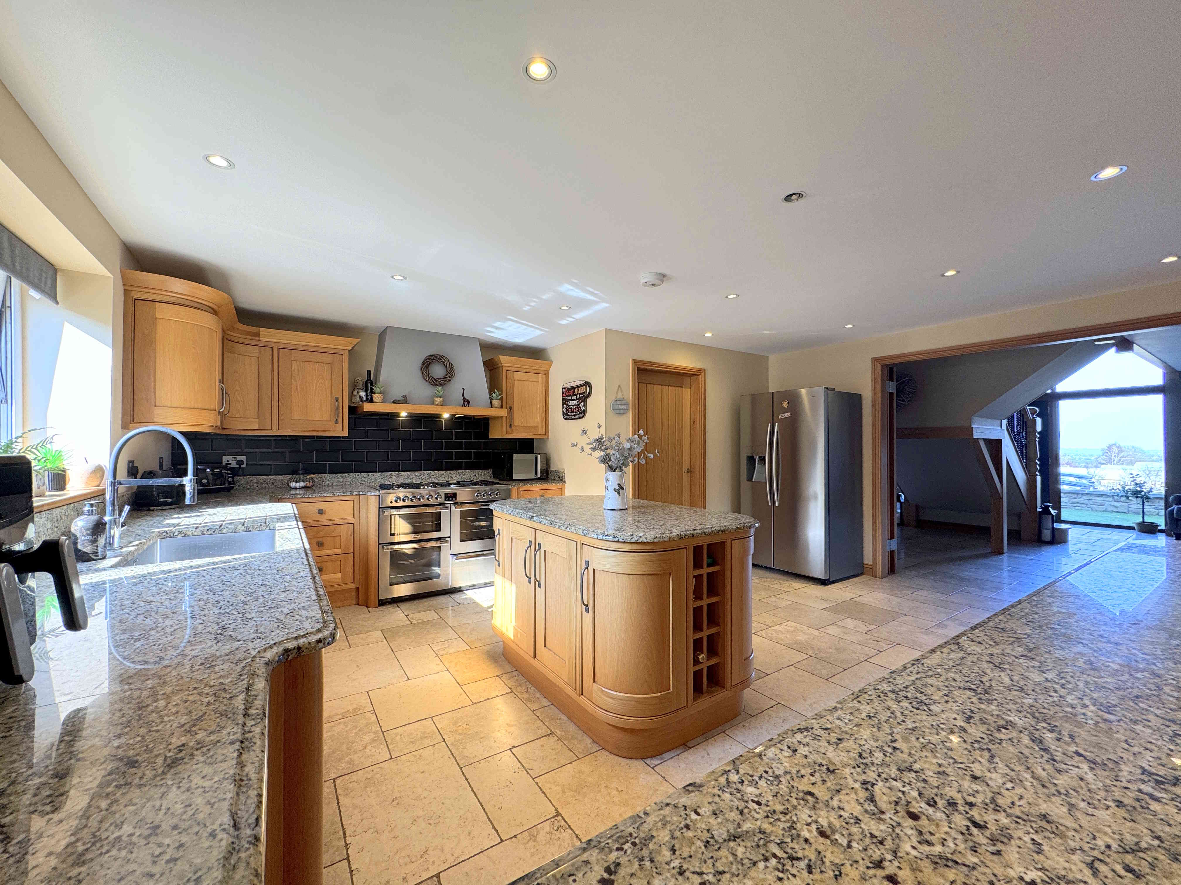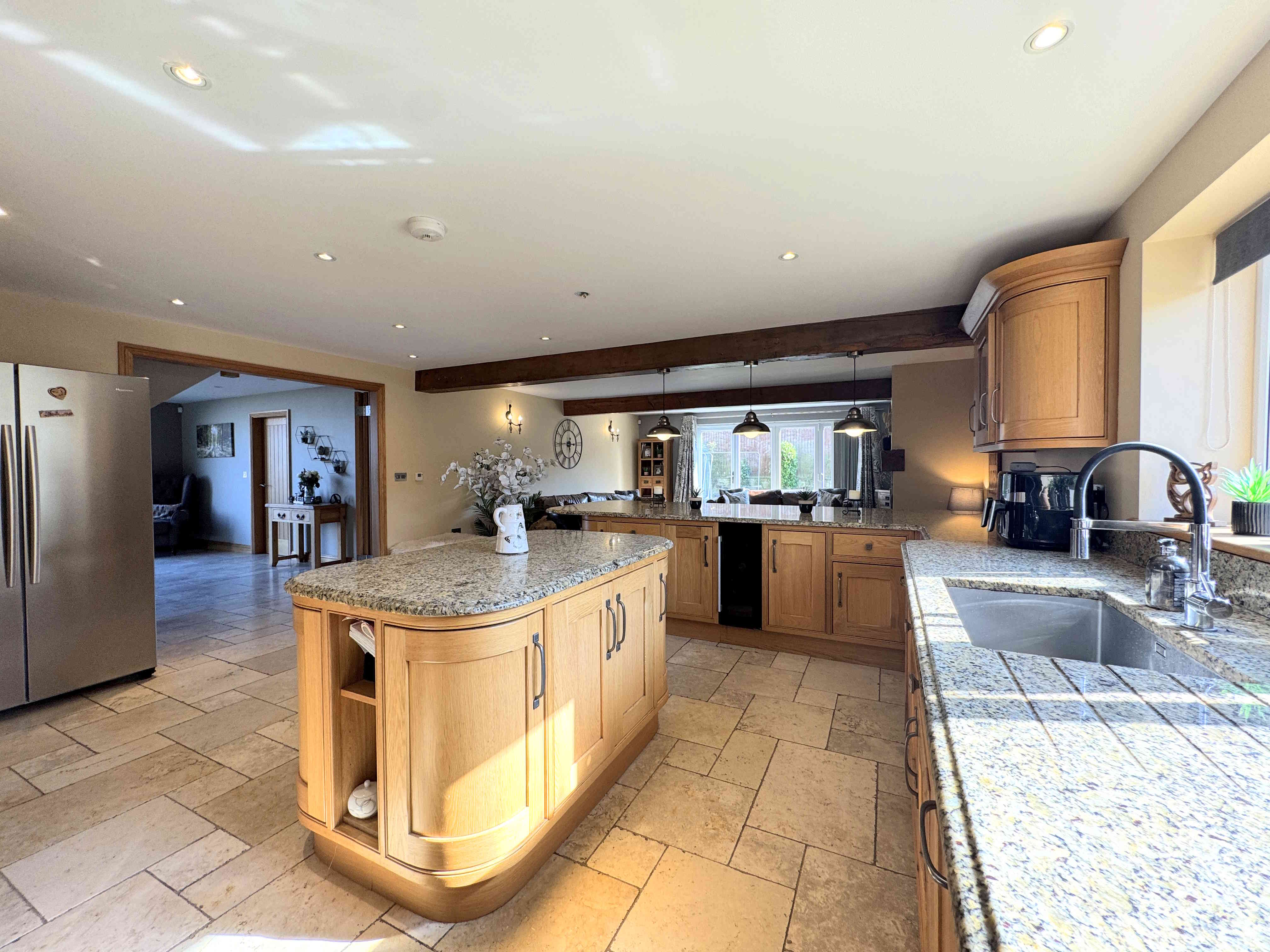 A stunning bespoke handmade 30mm in-frame oak kitchen, perfectly complemented by beautiful limestone tiling flowing from the entrance hall. The kitchen is equipped with a sink with a chrome mixer tap, granite worktops with matching upstands, and a coordinated kitchen island unit with additional storage. Cooking and dining are a pleasure with a built-in Belling range-style gas cooker with an extractor fan, wine fridge, two integrated Hisense dishwashers, and a breakfast bar with seating for five.
