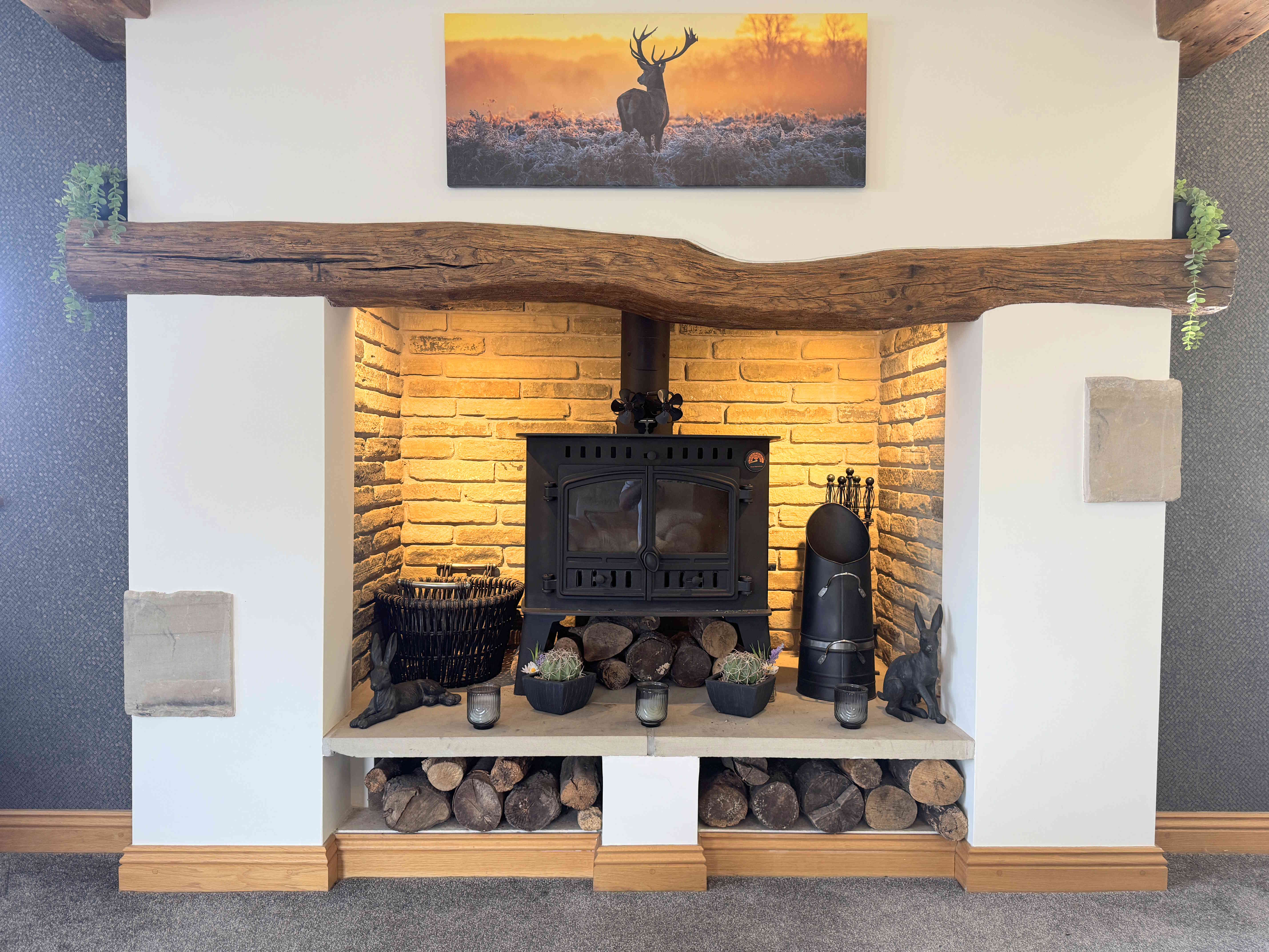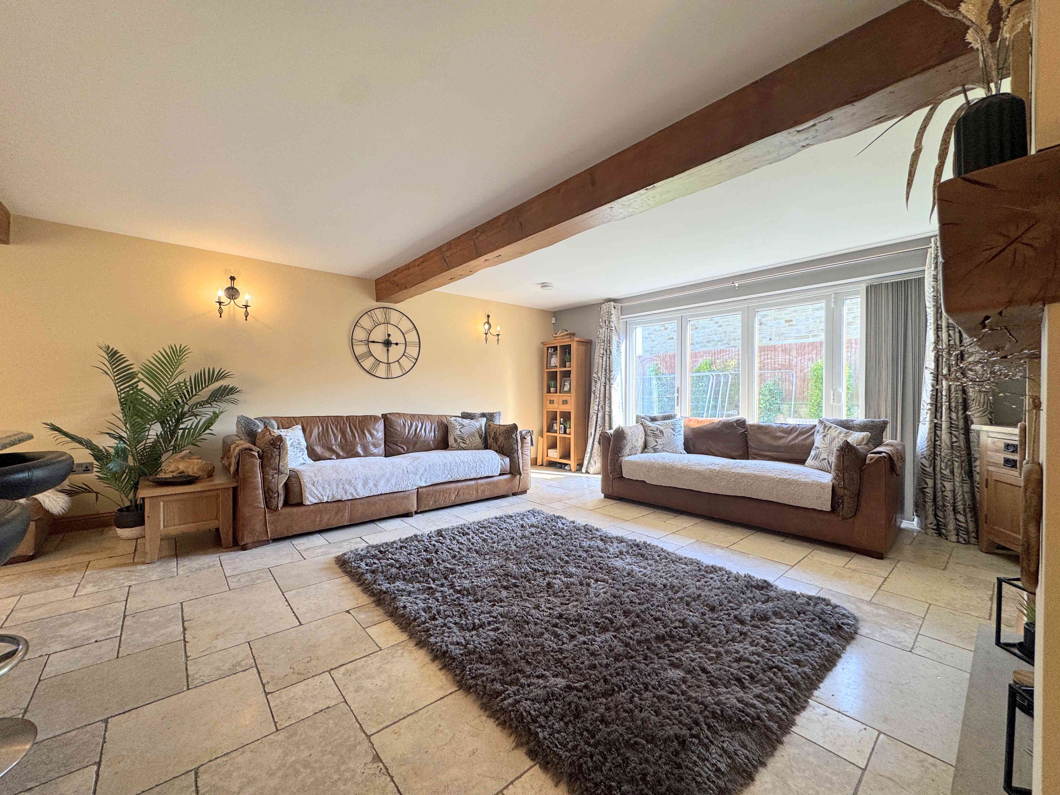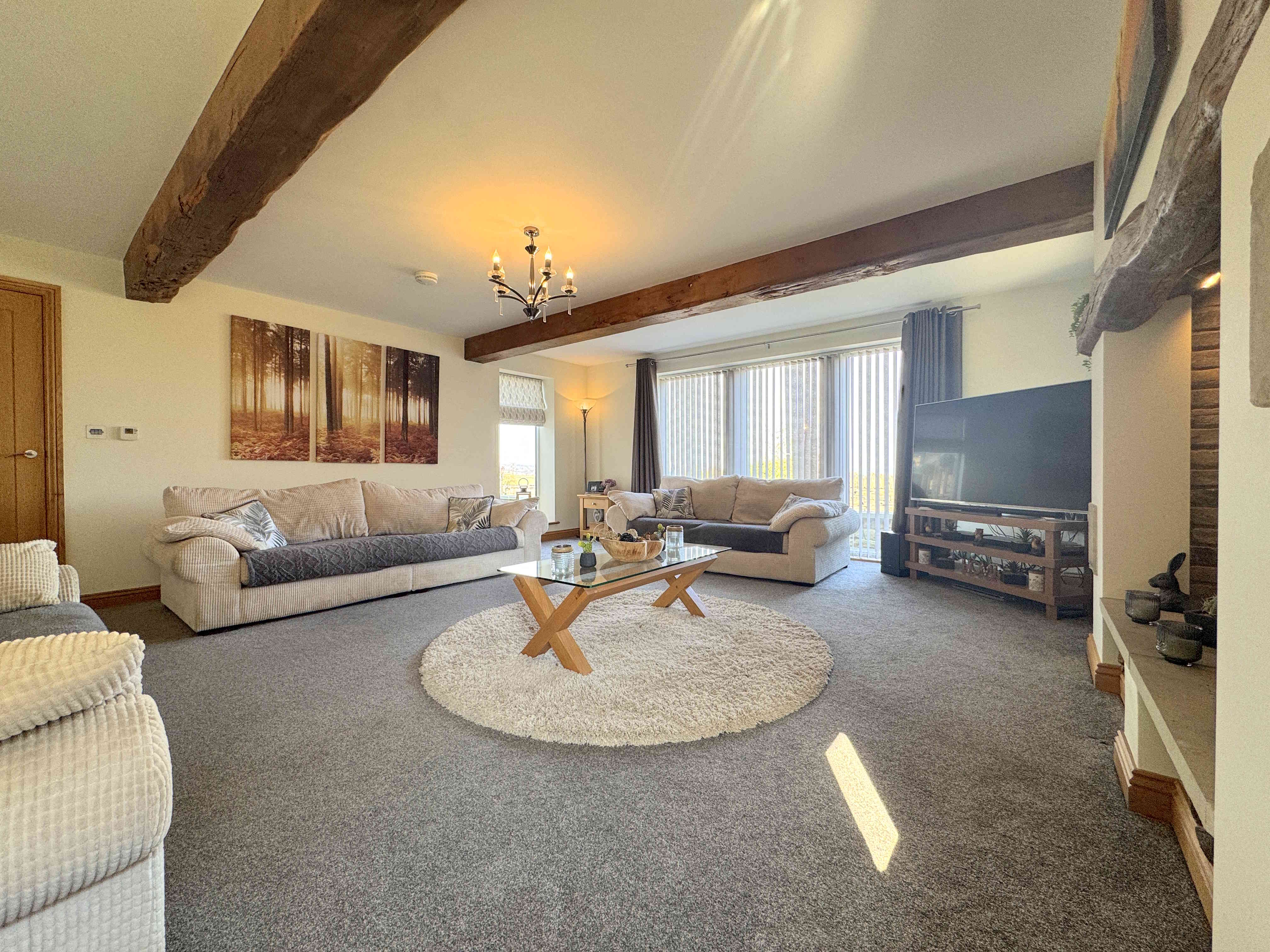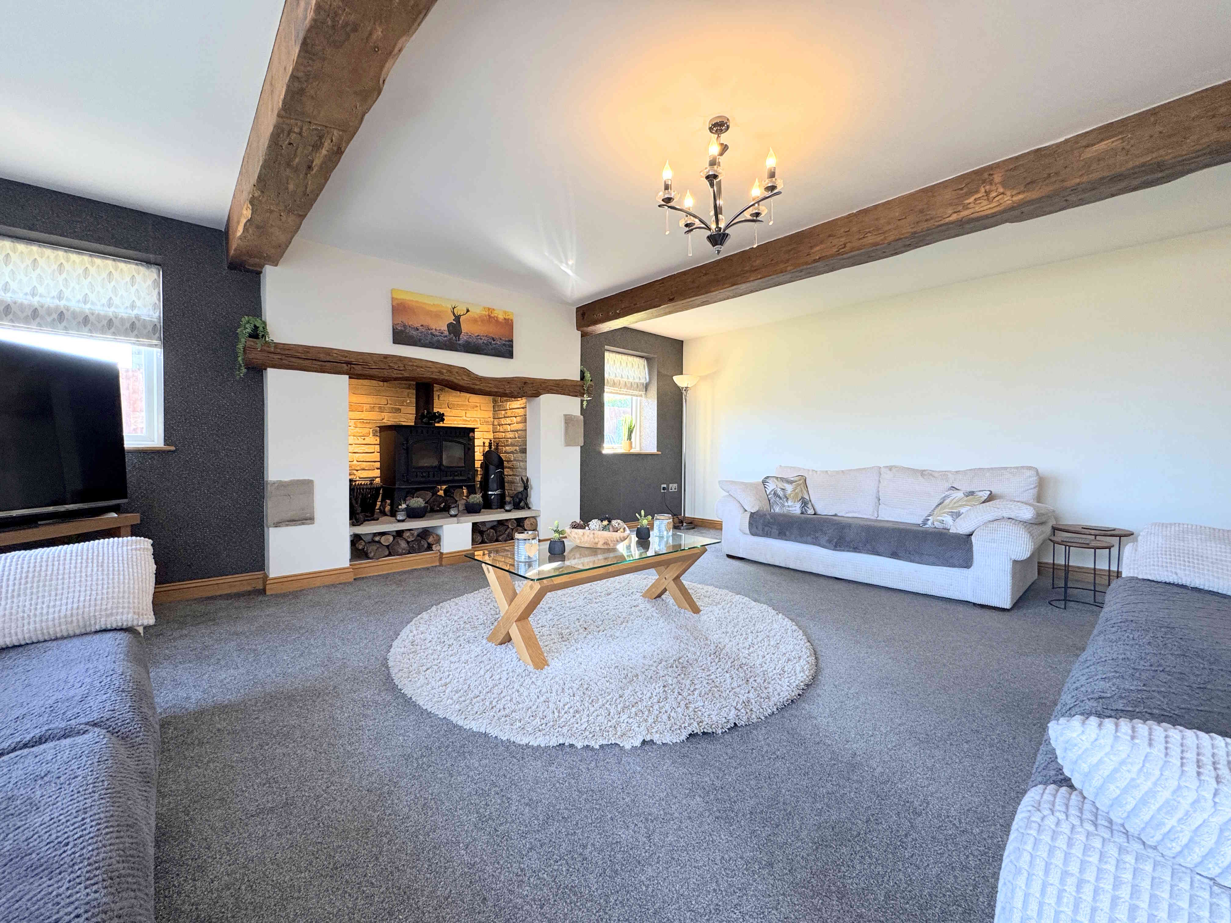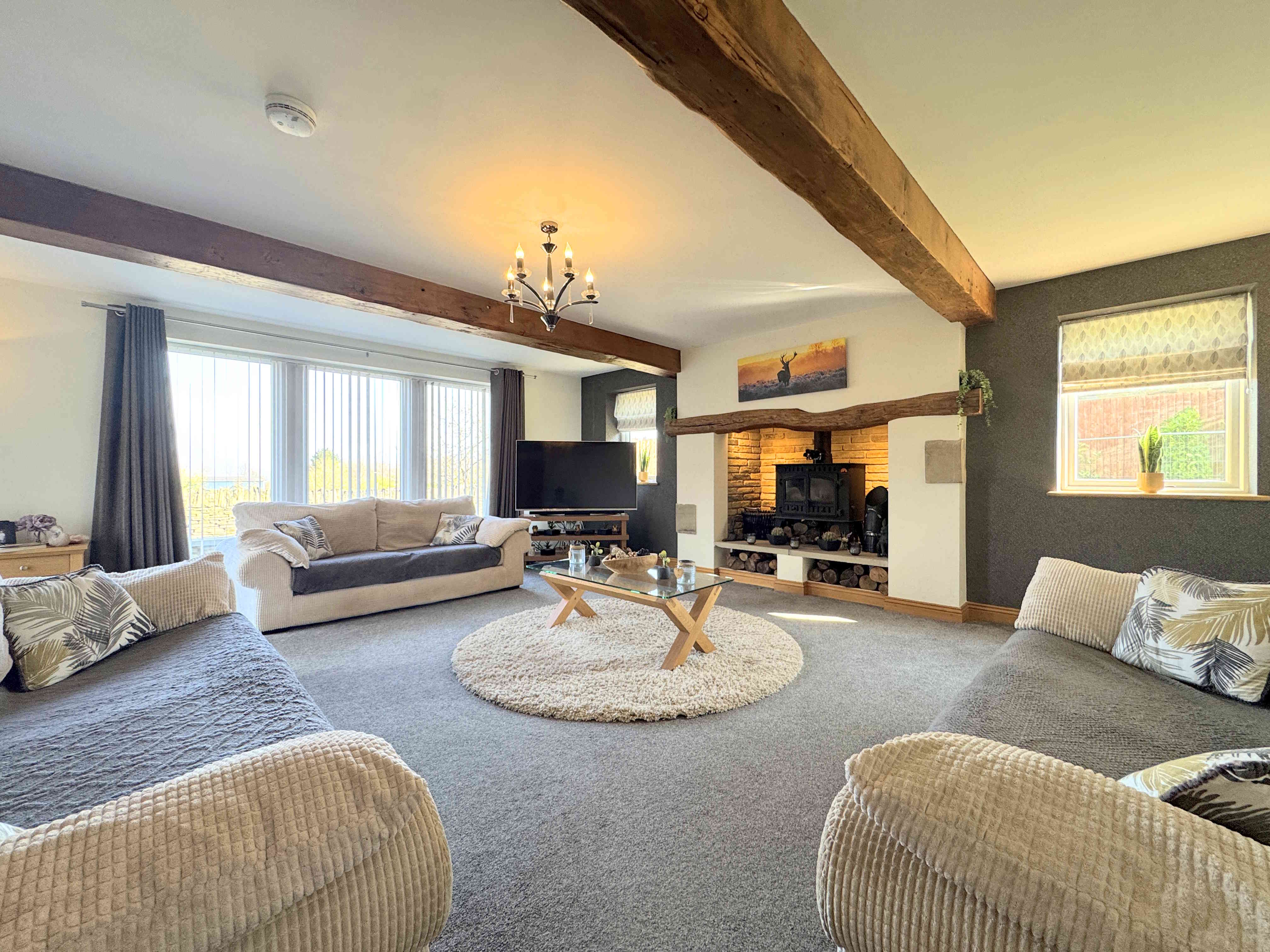 A spacious lounge brimming with character, boasting exposed wooden ceiling beams and a large fireplace with an exposed wooden beam. A multi-fuel stove sits against an exposed stone backdrop, creating a sophisticated yet cozy ambiance. Natural light floods the space through UPVC windows and three floor-to-ceiling UPVC windows on one side, enhancing the sense of openness.