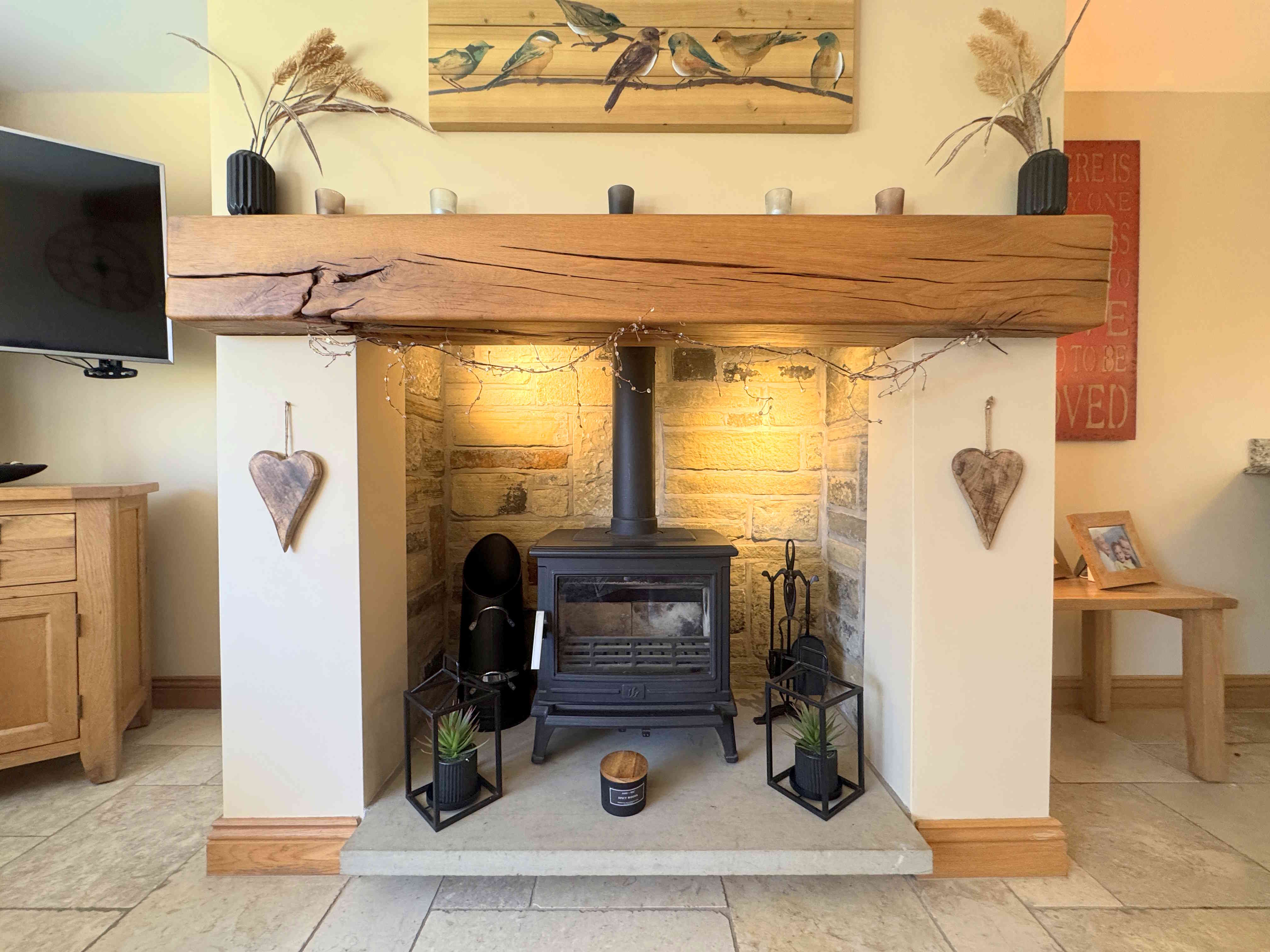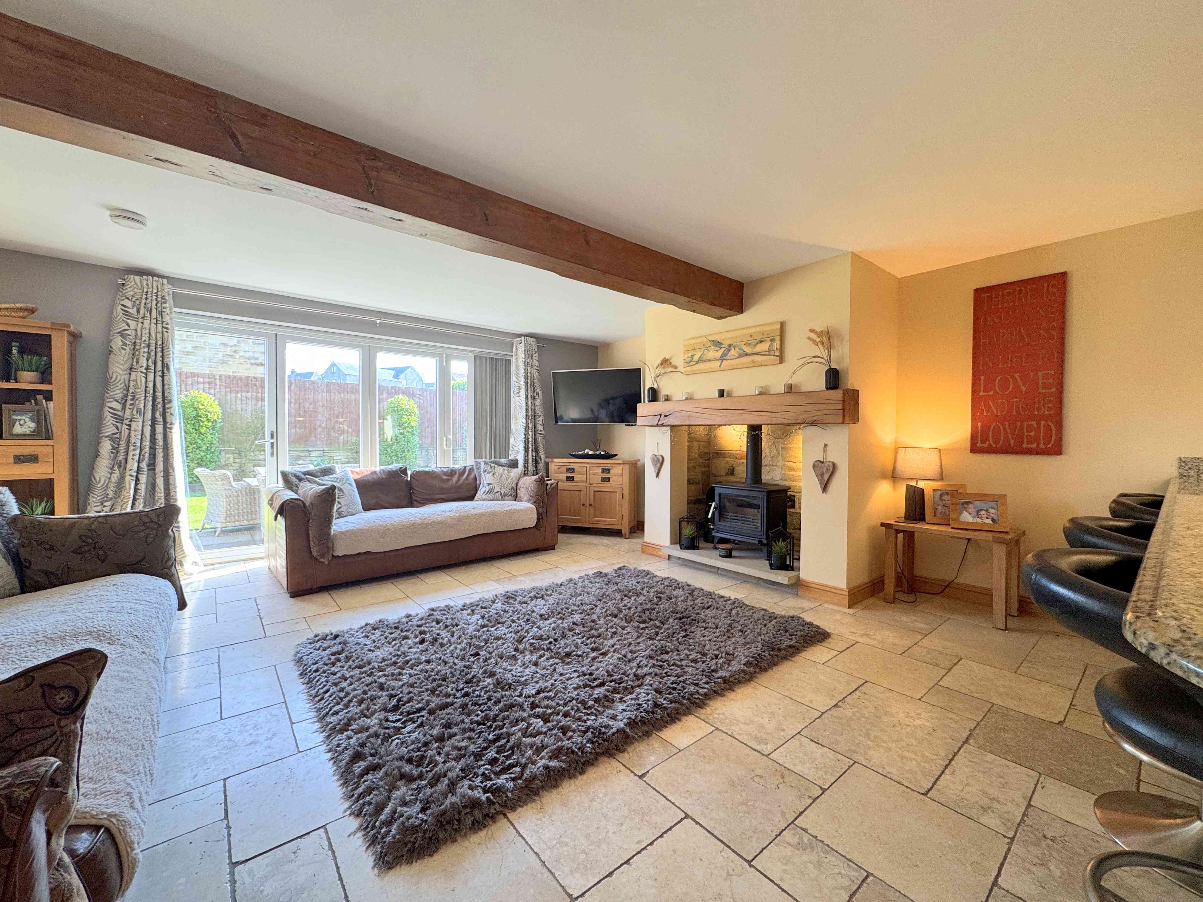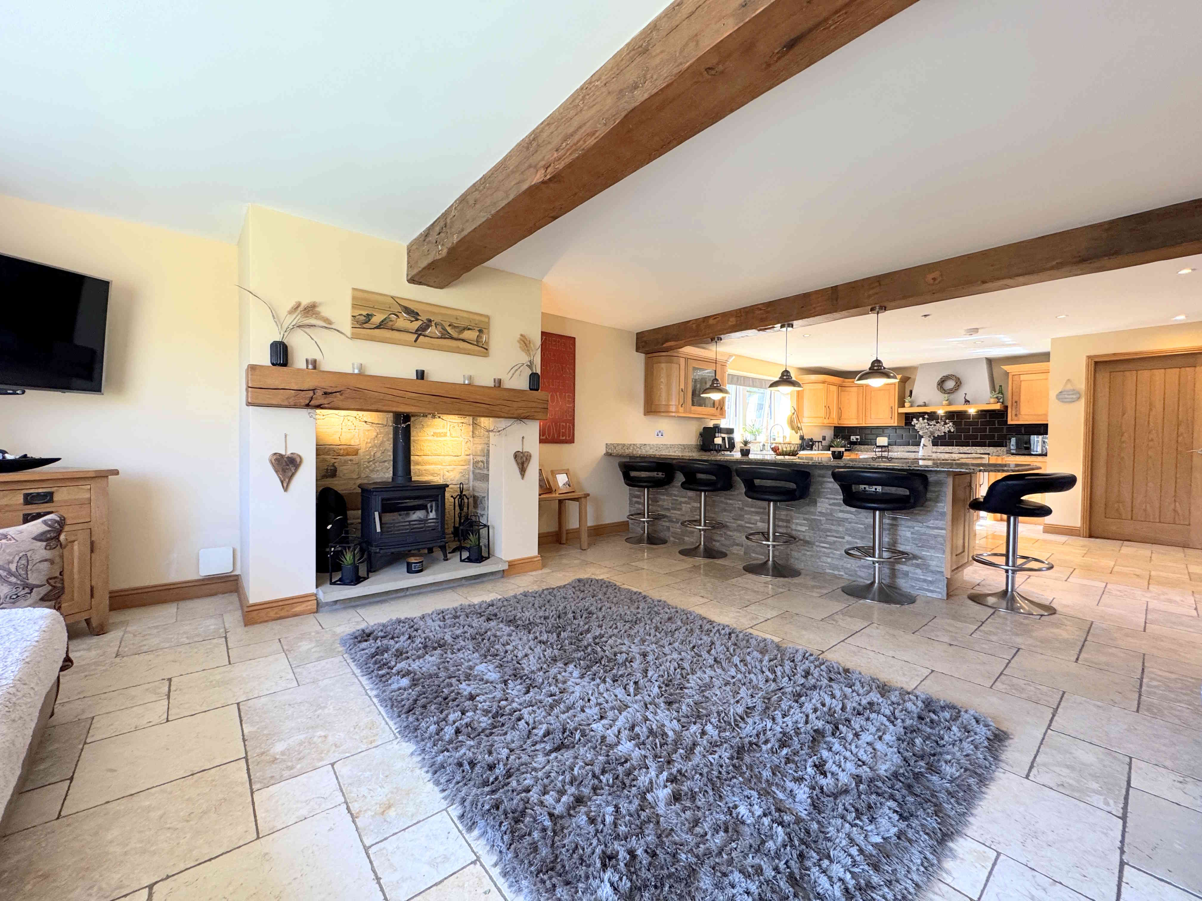 The versatile dining area features a fireplace with an exposed wooden beam, a multi-fuel stove set against an exposed stone wall, and exposed wooden ceiling beams, adding warmth and charm. Expansive bi-folding doors open to the side garden, seamlessly blending indoor and outdoor living.