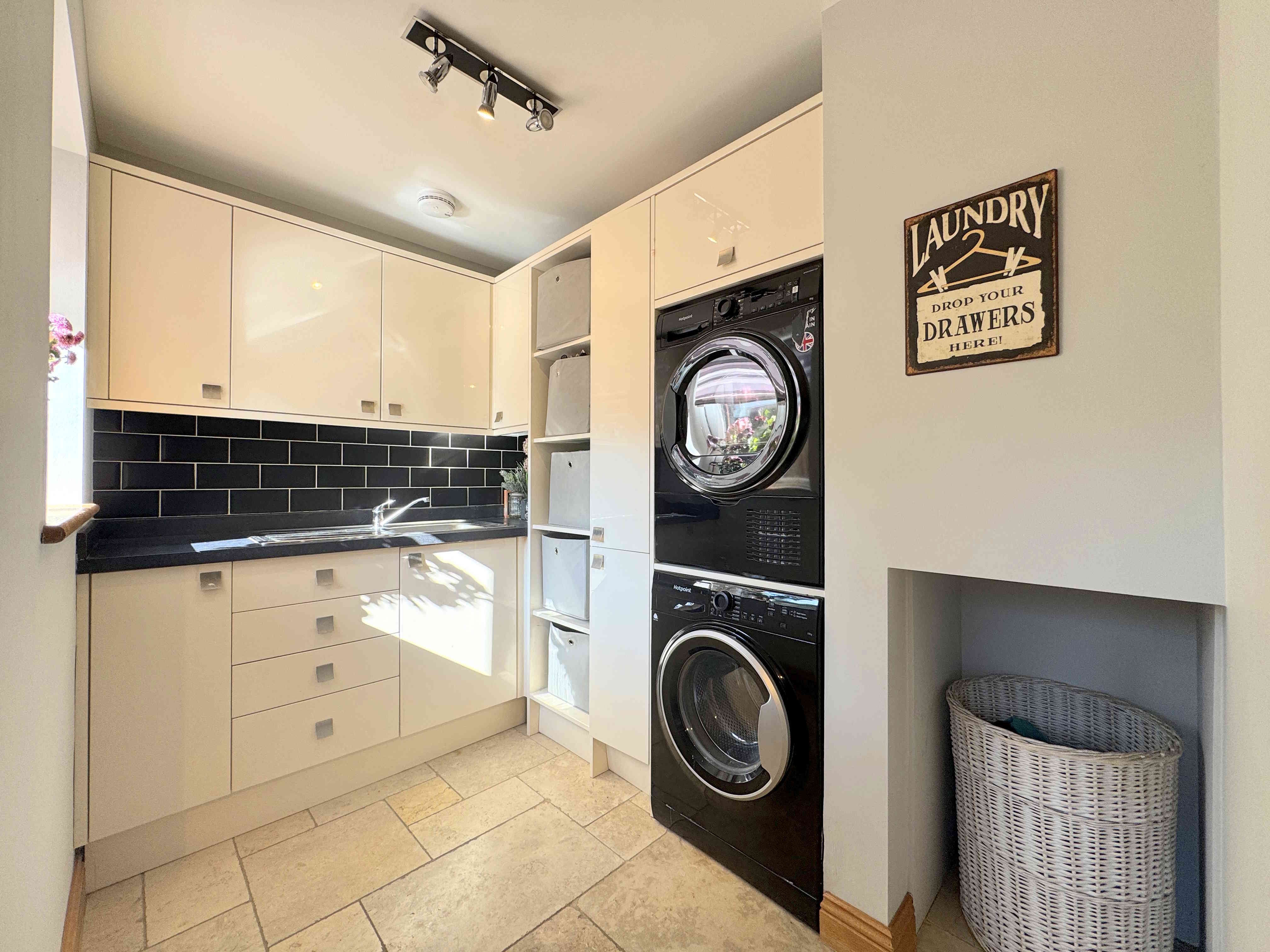 A well-equipped utility room fitted with wall and base units, a sink with a chrome mixer tap, and splashback tiles. The limestone tiling continues for a cohesive look. There is plumbing for a washing machine and dryer, a laundry chute, and a UPVC window.