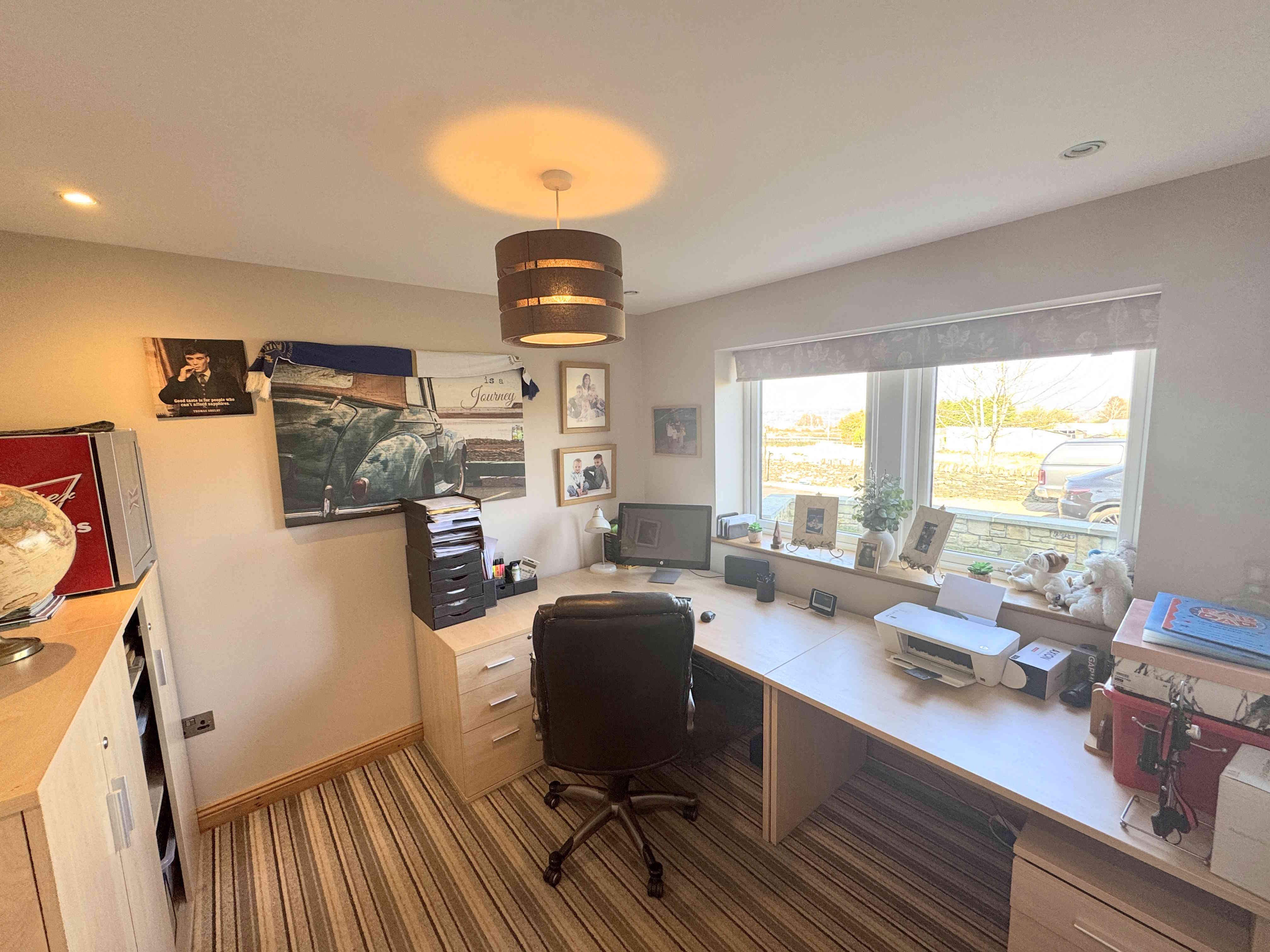 A functional study space, ideal for working from home, featuring ceiling spotlights and a UPVC window.