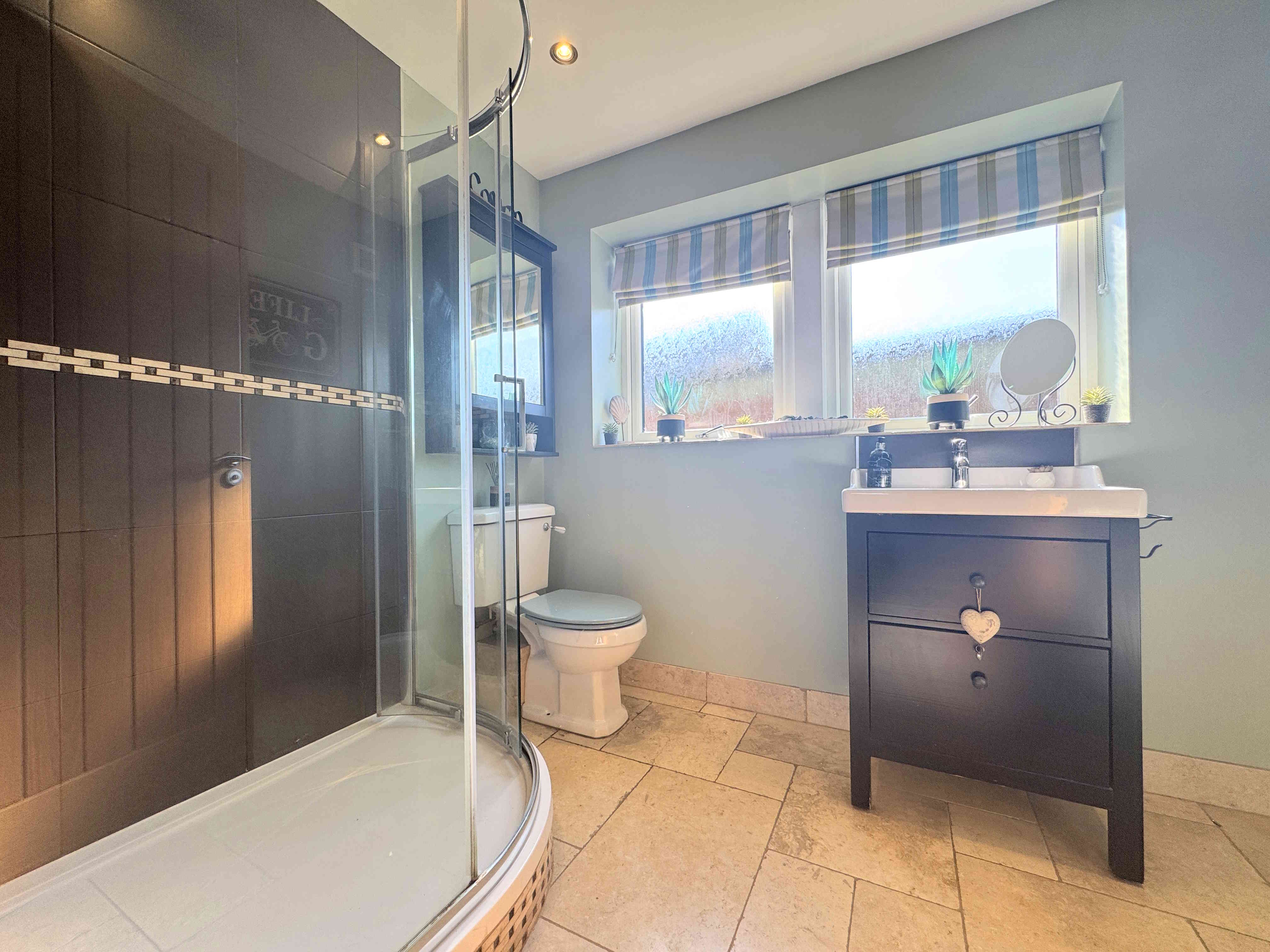 A stylish three-piece suite, comprising a tiled shower cubicle with a glass shower screen, a rainfall and handheld power shower, a low-flush toilet, and a vanity sink unit. The limestone tiling continues, complemented by ceiling spotlights and a UPVC window.