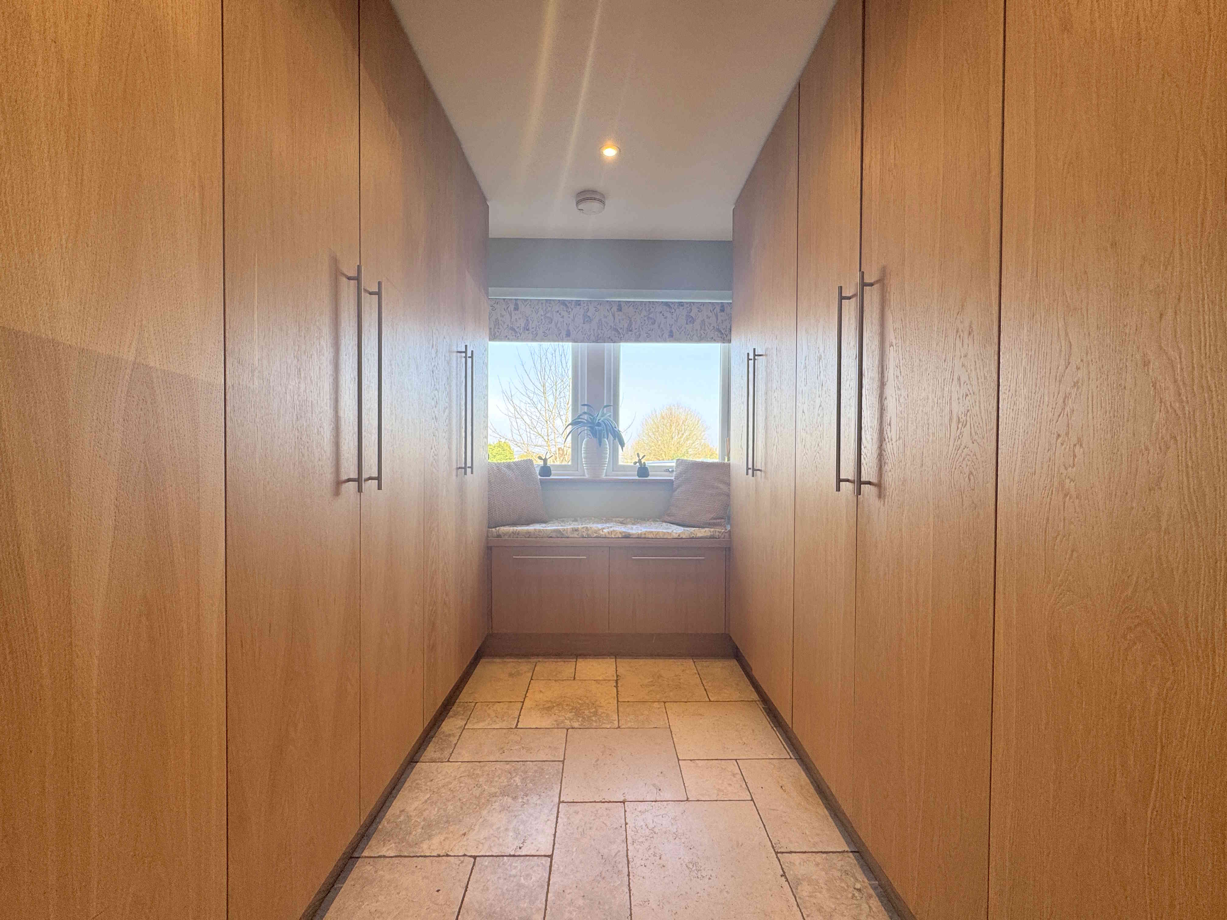 A practical boot room with ample fitted storage cupboards, housing the Vaillant combination boiler and hot water tank. A window bench provides a cozy spot to sit, and UPVC windows allow natural light into the space. The limestone tiling continues, adding to the home’s cohesive aesthetic.