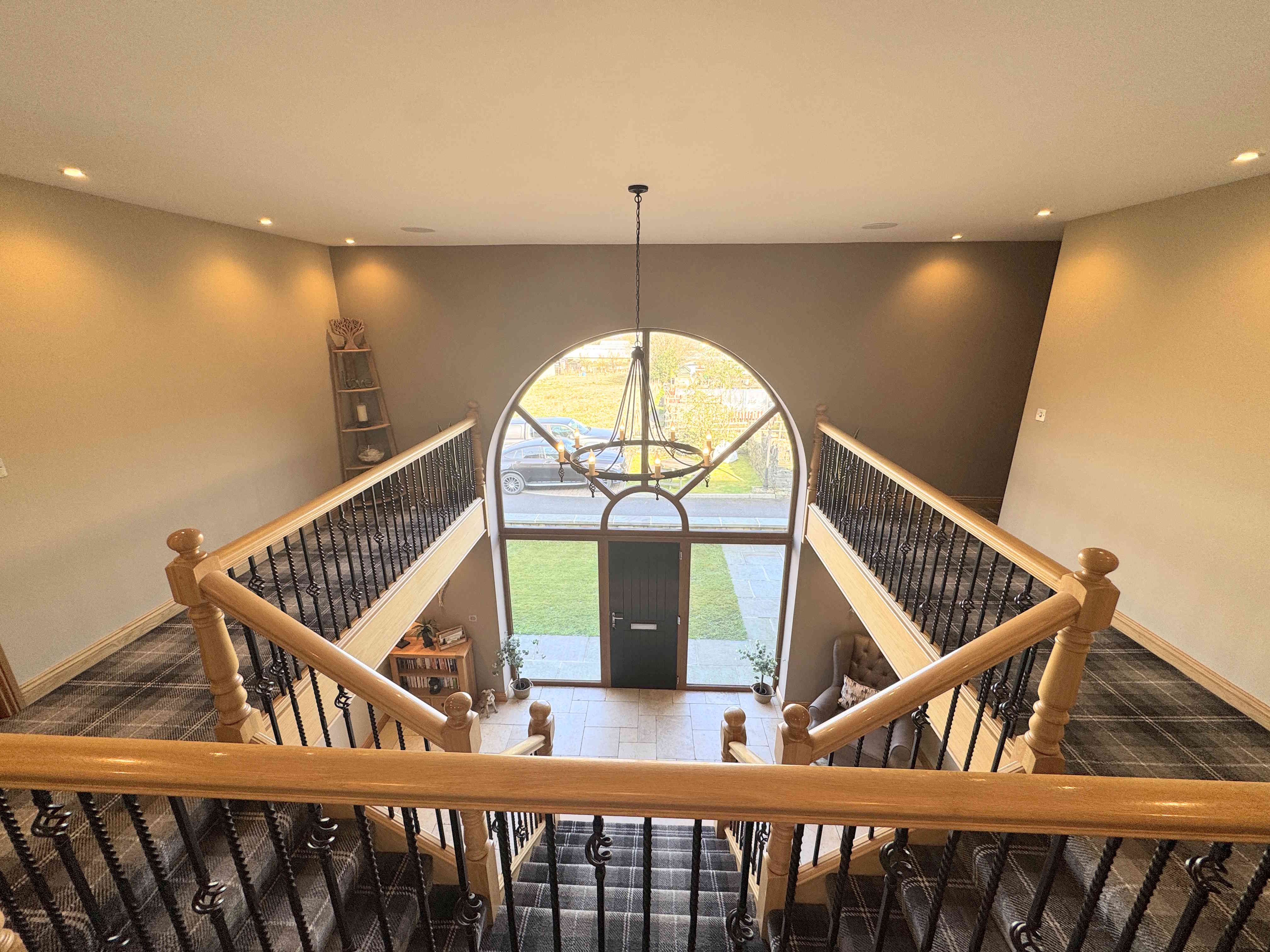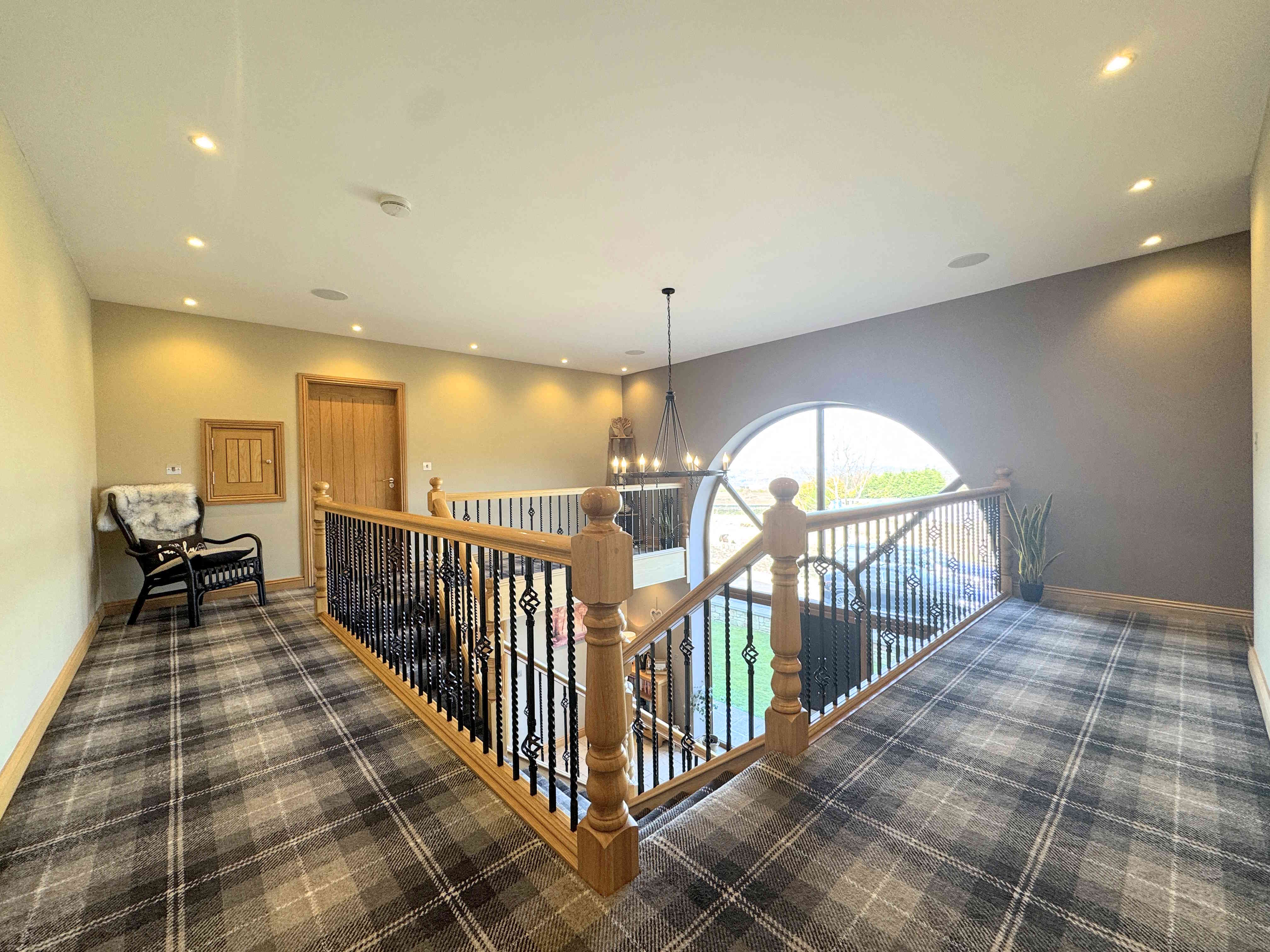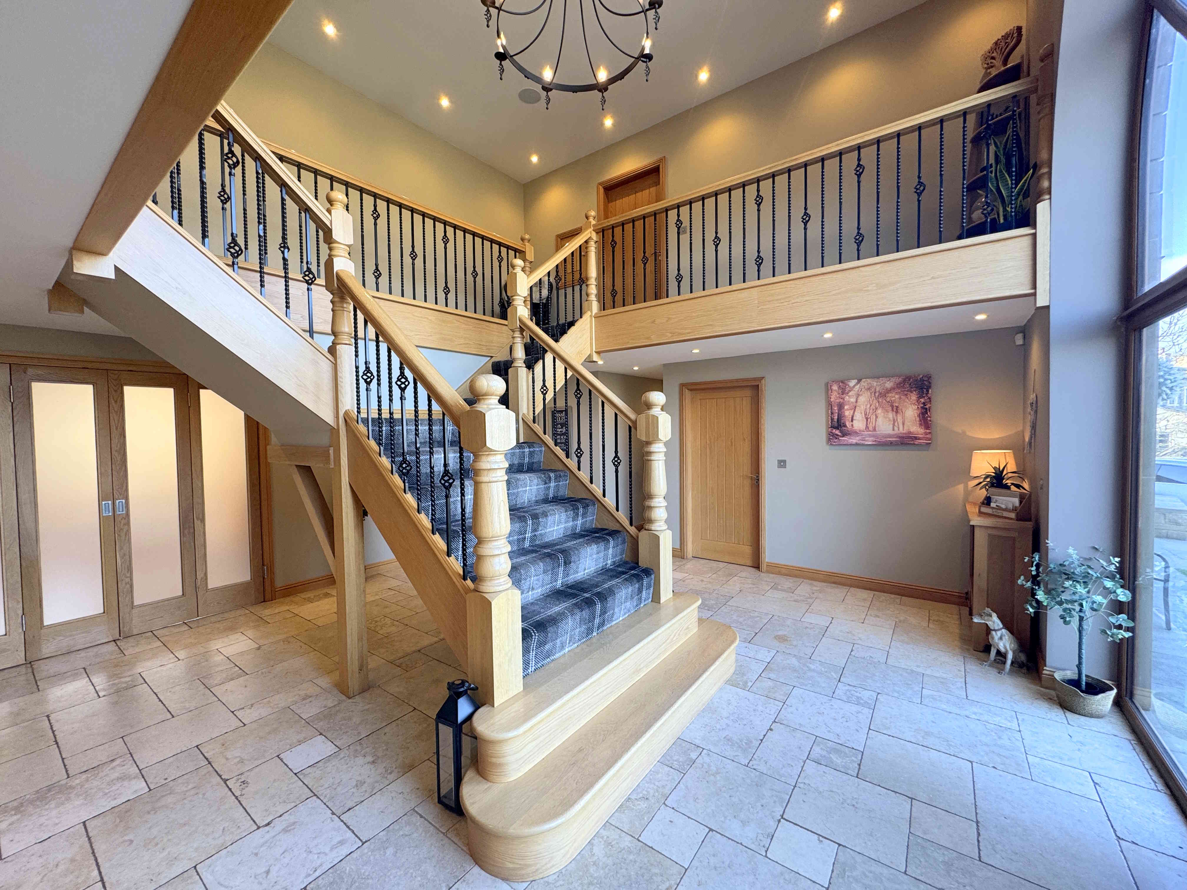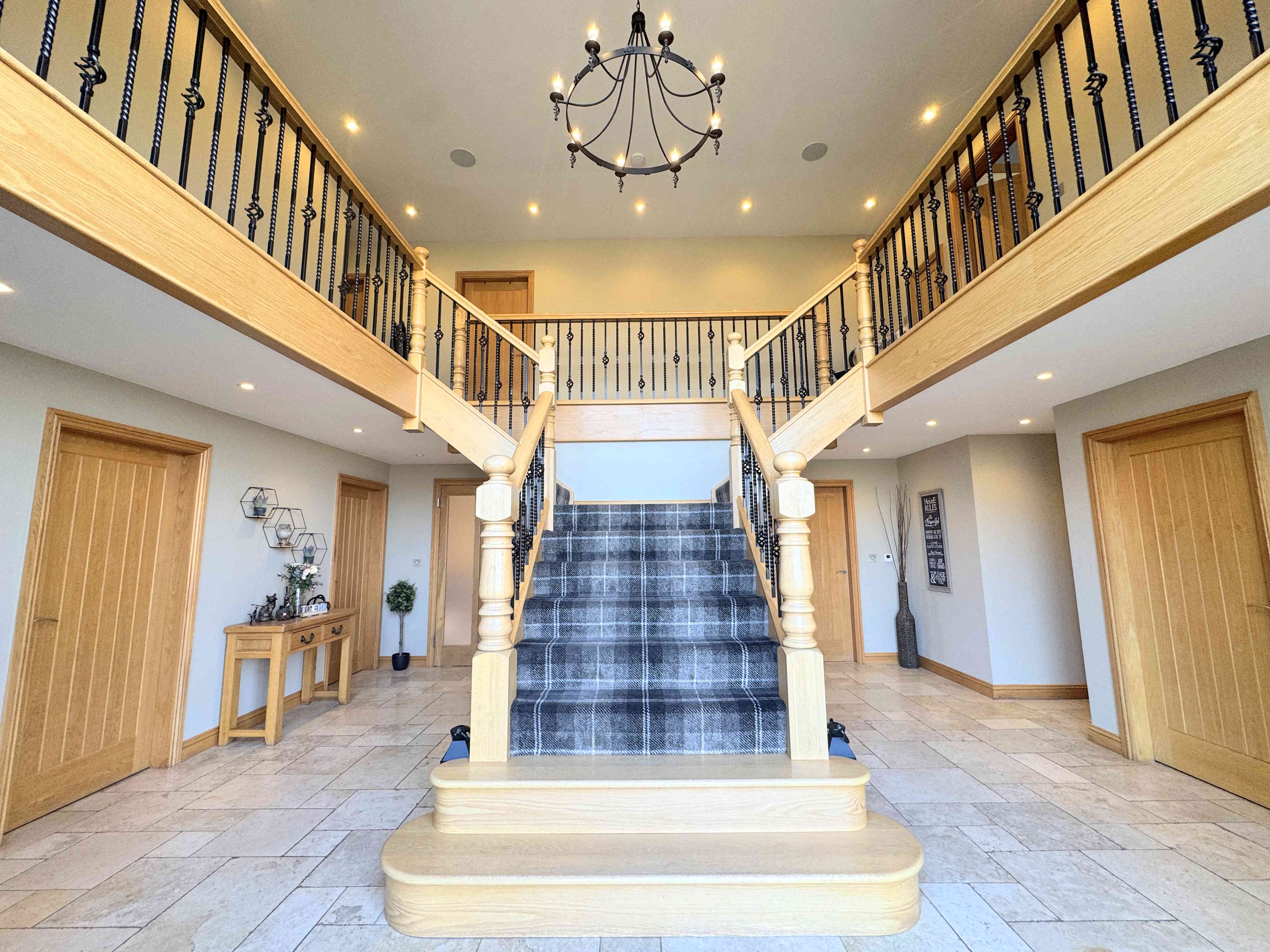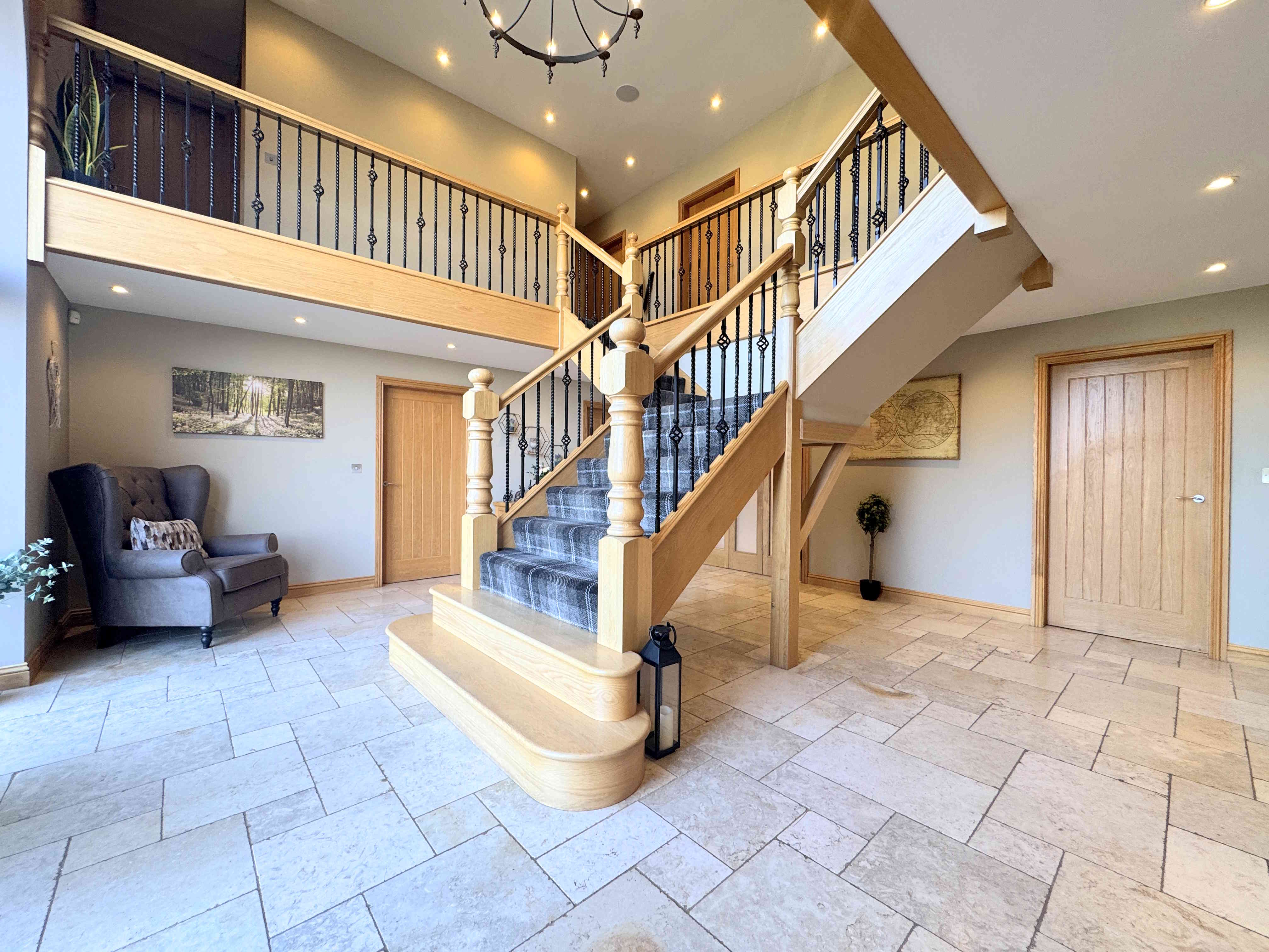 A breathtaking grand entrance which is fit for a Queen, featuring a large UPVC archway and composite front door that makes a stunning first impression. The space is further elevated by a bespoke oak bifurcated staircase that leads up to a mezzanine landing, ceiling spotlights, and beautiful limestone floor tiling with underfloor heating, seamlessly setting the tone for this elegant home.