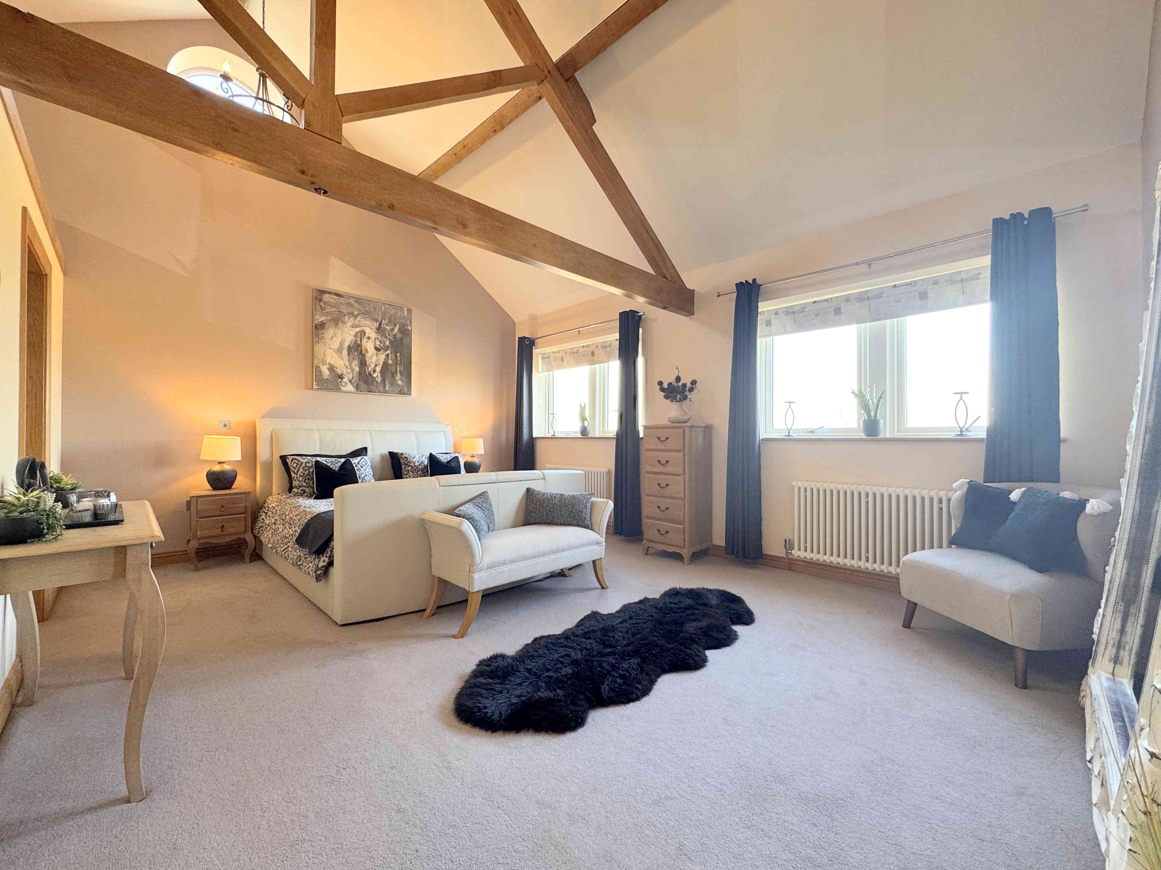 A large double bedroom with exposed wooden ceiling beams and high ceilings. A circular UPVC window adds a unique architectural feature, complemented by two traditional radiators and two additional UPVC windows that flood the space with natural light.