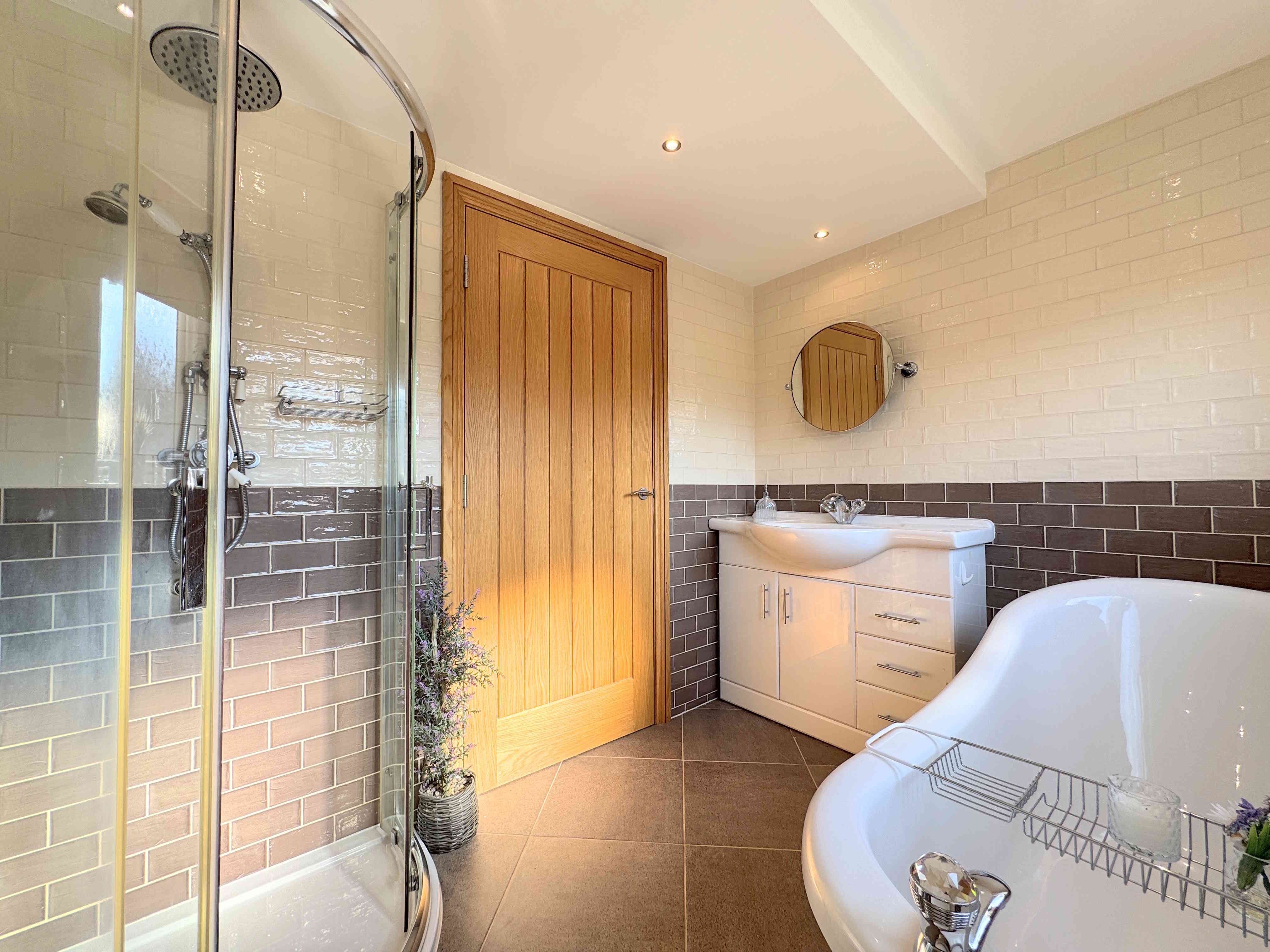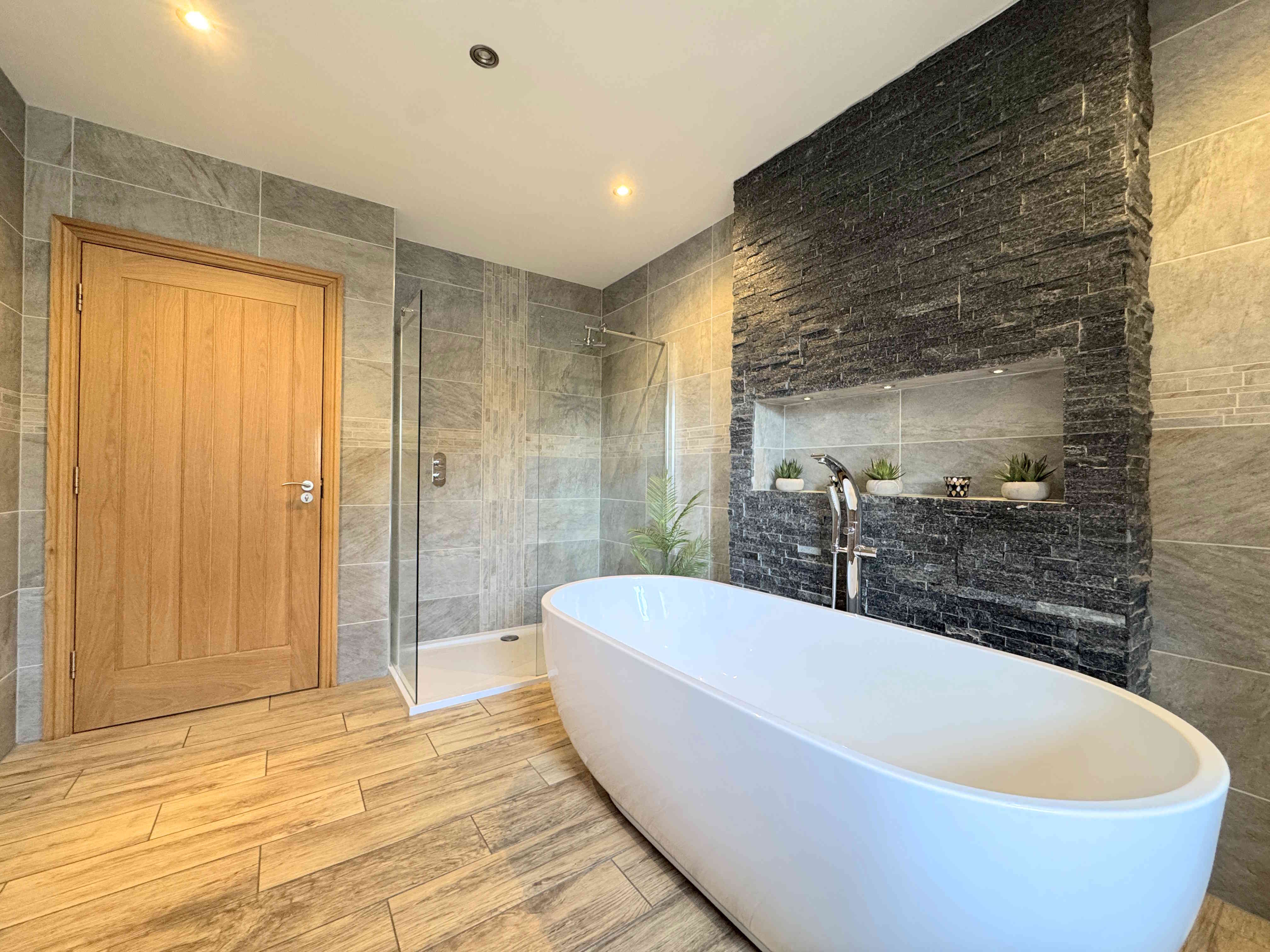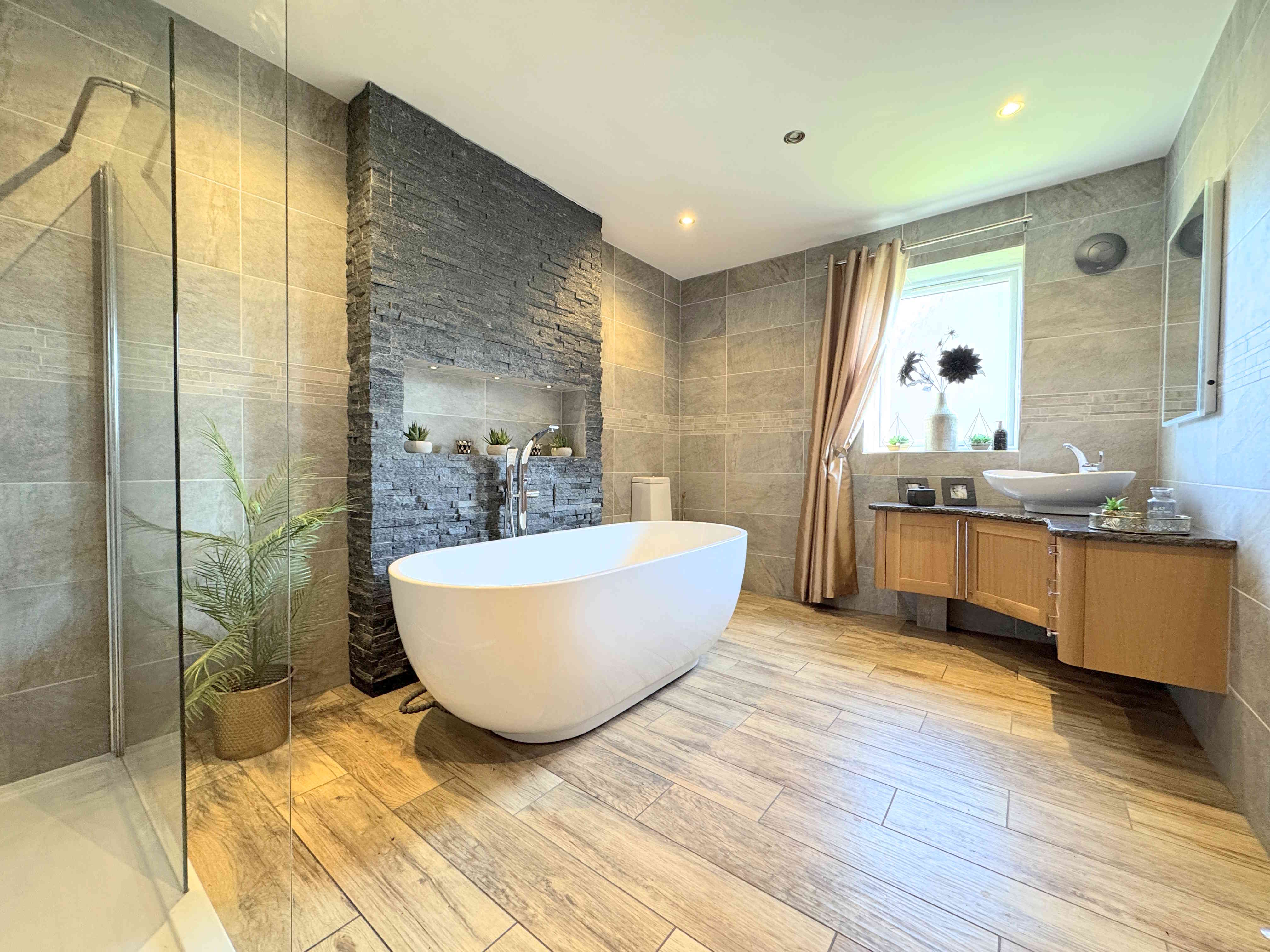 A luxurious four-piece suite, featuring a freestanding bath with a handheld power shower, a walk-in shower cubicle with a glass screen and rainfall power shower, a low-flush toilet, and a vanity sink unit. Wood-effect floor tiles and tiled walls make for a stylish yet practical space. An extractor fan, chrome towel radiator, ceiling spotlights, and UPVC window complete this beautiful bathroom.