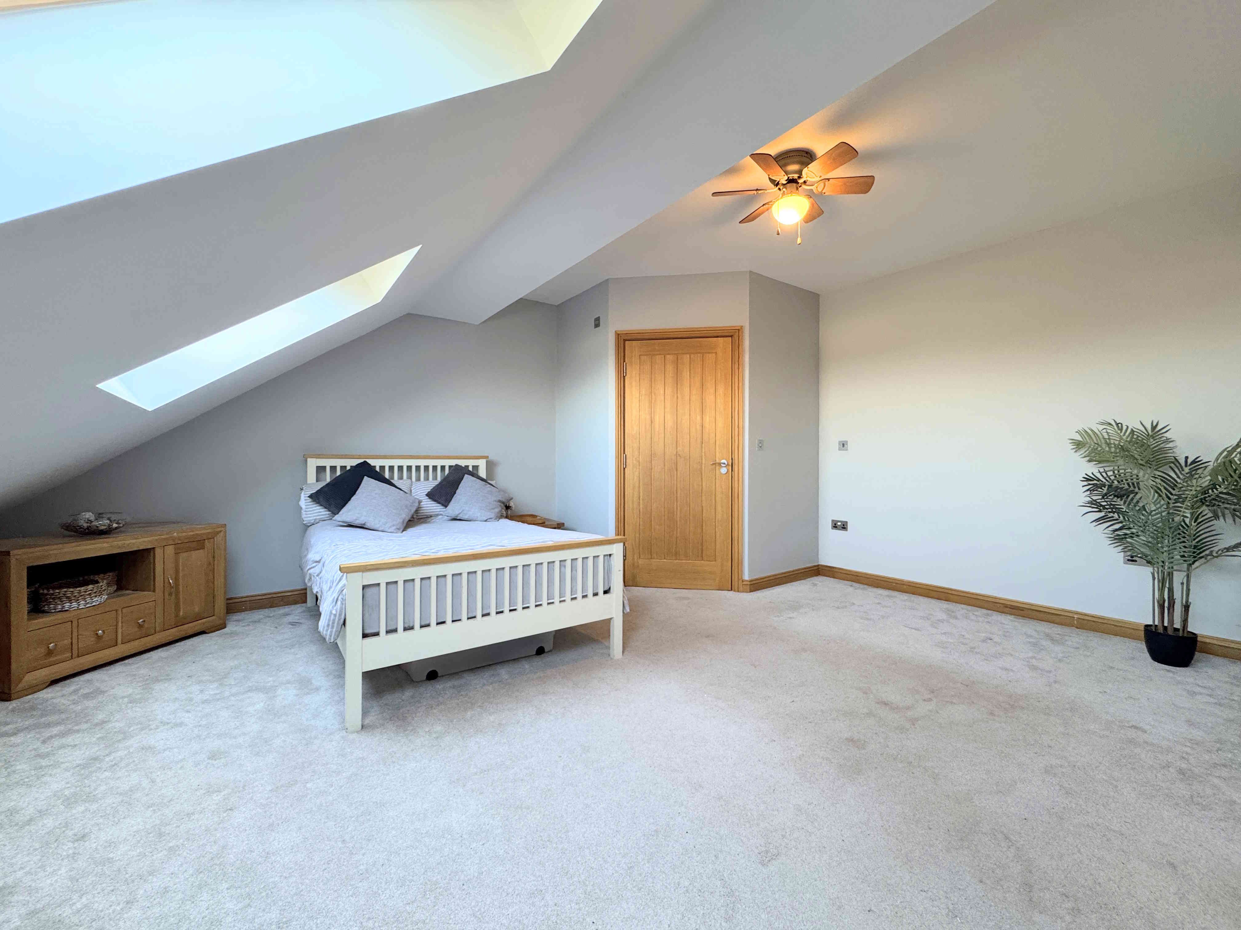 A bright double bedroom with a ceiling fan, a radiator, and two Velux windows. Due to the sloped ceiling, there is limited headspace in some areas.