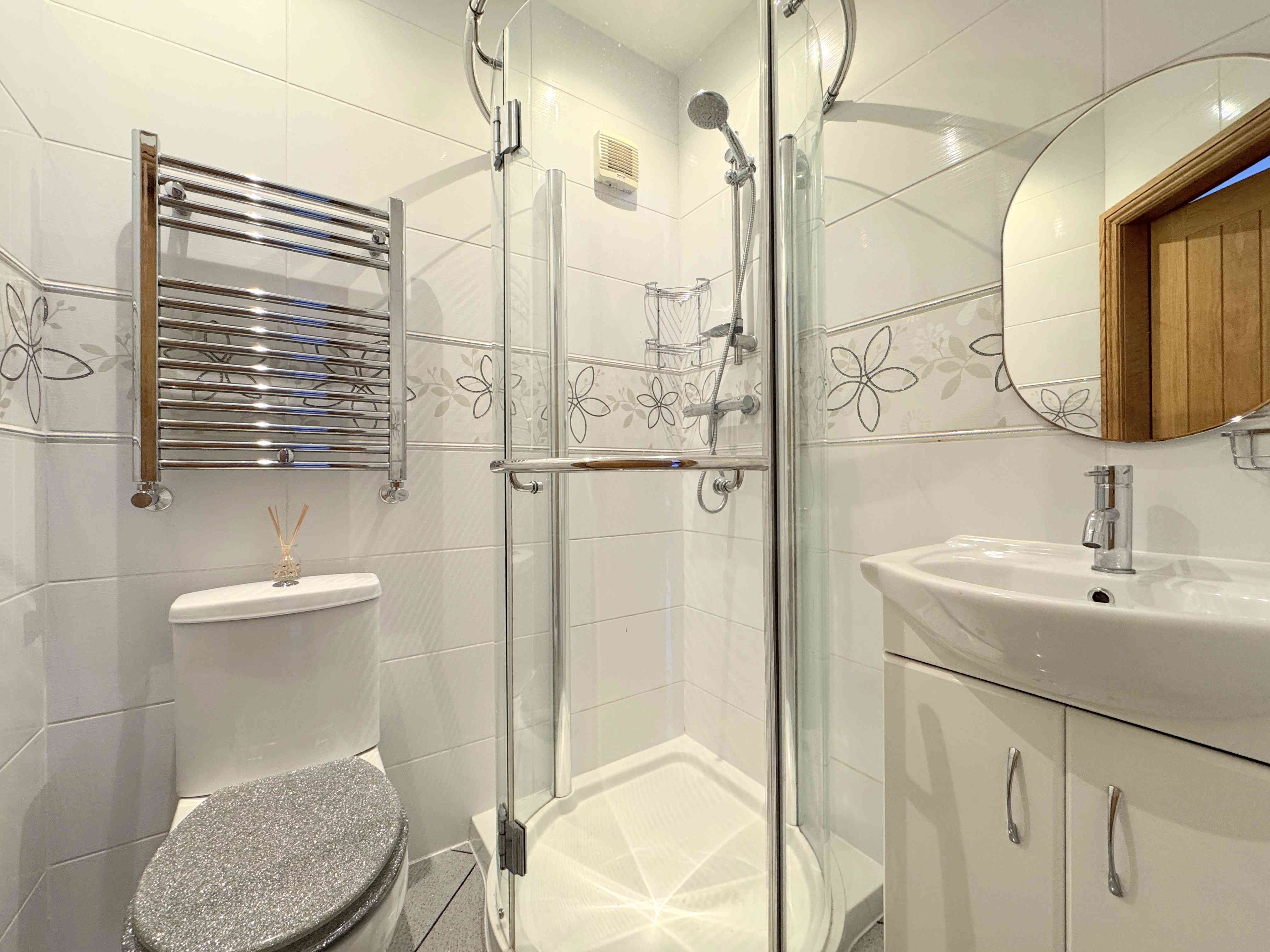 A modern three-piece suite, including a glass shower cubicle with a handheld shower, a low-flush toilet, and a vanity unit. The tiled floor and walls, ceiling spotlights, and extractor fan add to the convenience.